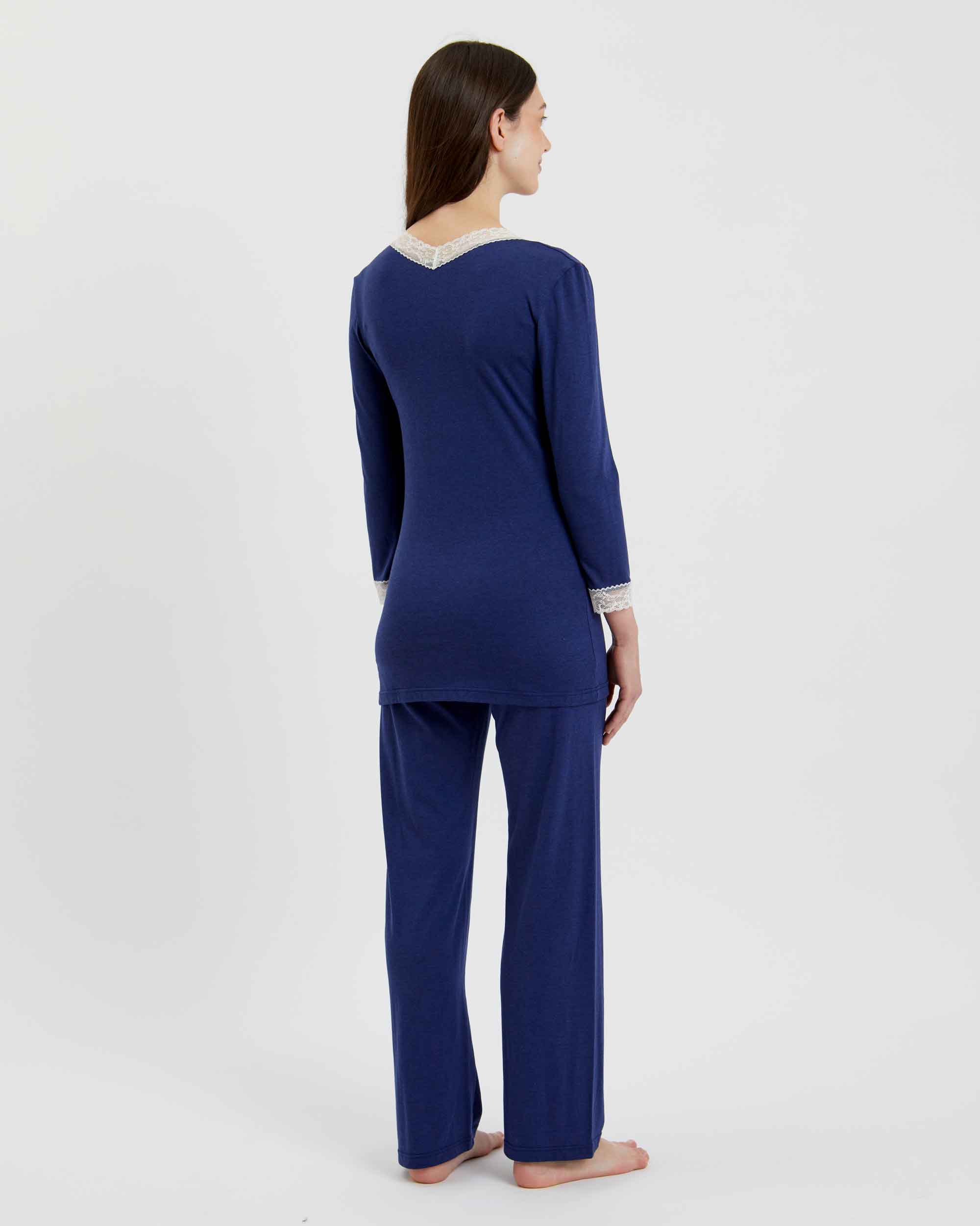 Featuring ivory lace detailing at the neckline and cuffs, this sumptuously soft and breathable jersey is a mix of 50% cotton and 50% modal textile sustainably sourced from the fibres of Beech trees. Technologies behind the fibre allow it to adapt to temperatures throughout the seasons, keeping you warm when it's cool and cool when it's warm.