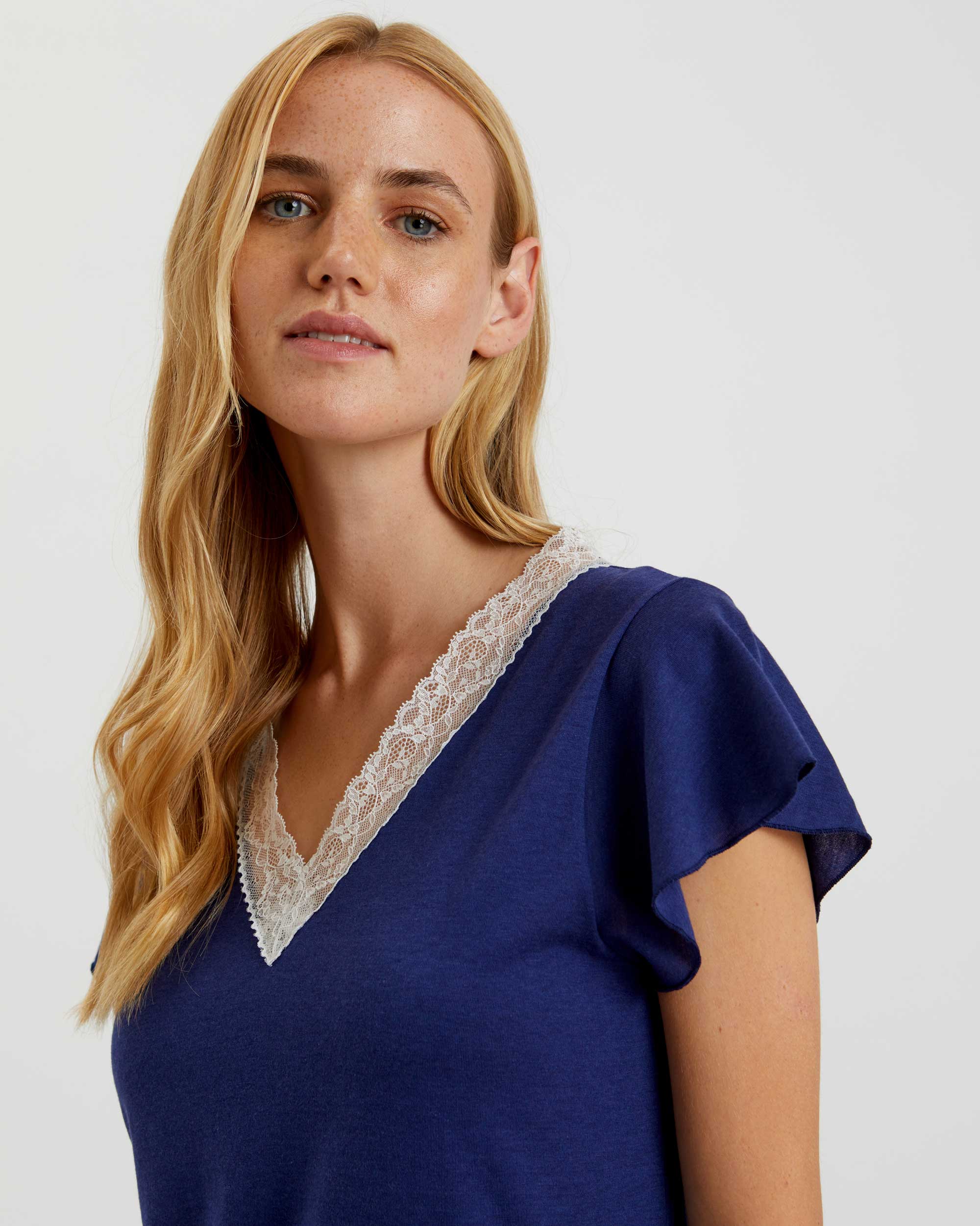 Featuring ivory lace detailing at the neckline and cuffs, this sumptuously soft and breathable jersey is a mix of 50% cotton and 50% modal textile sustainably sourced from the fibres of Beech trees. Technologies behind the fibre allow it to adapt to temperatures throughout the seasons, keeping you warm when it's cool and cool when it's warm.