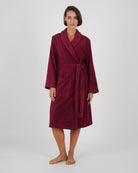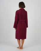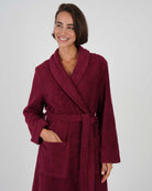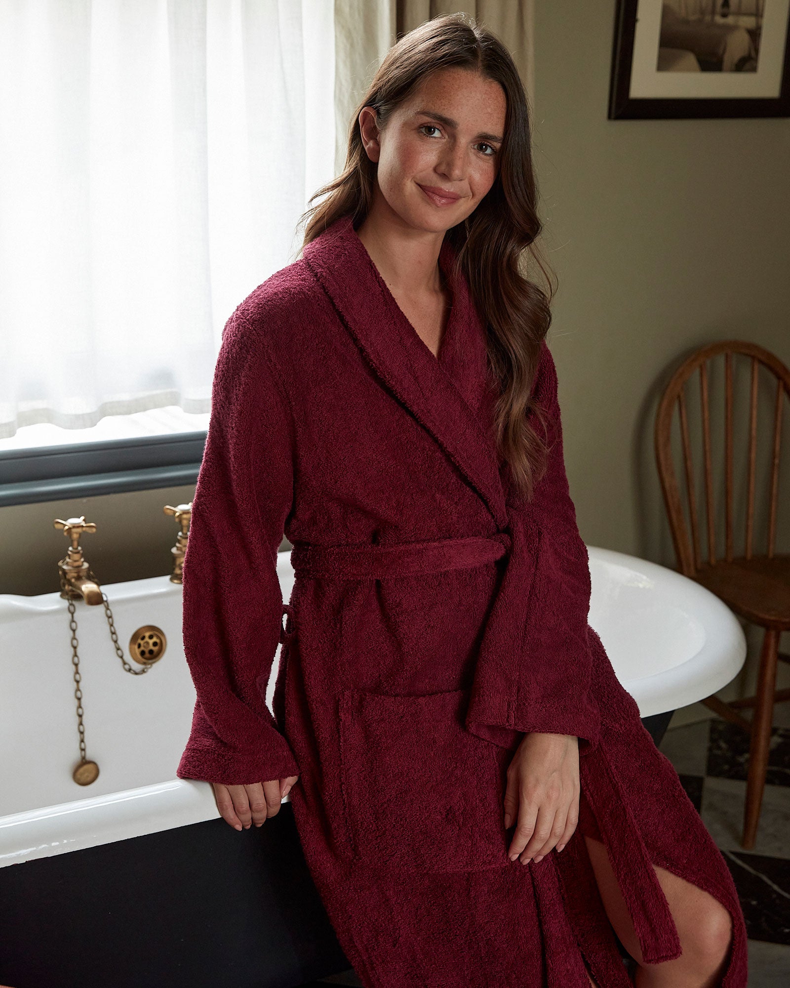 Wrap up in every day luxury in our burgundy 100% cotton towelling robe. As soft as it is absorbent and featuring deep pockets, a generous tie and a shawl collar. Perfect to pop on after a shower.