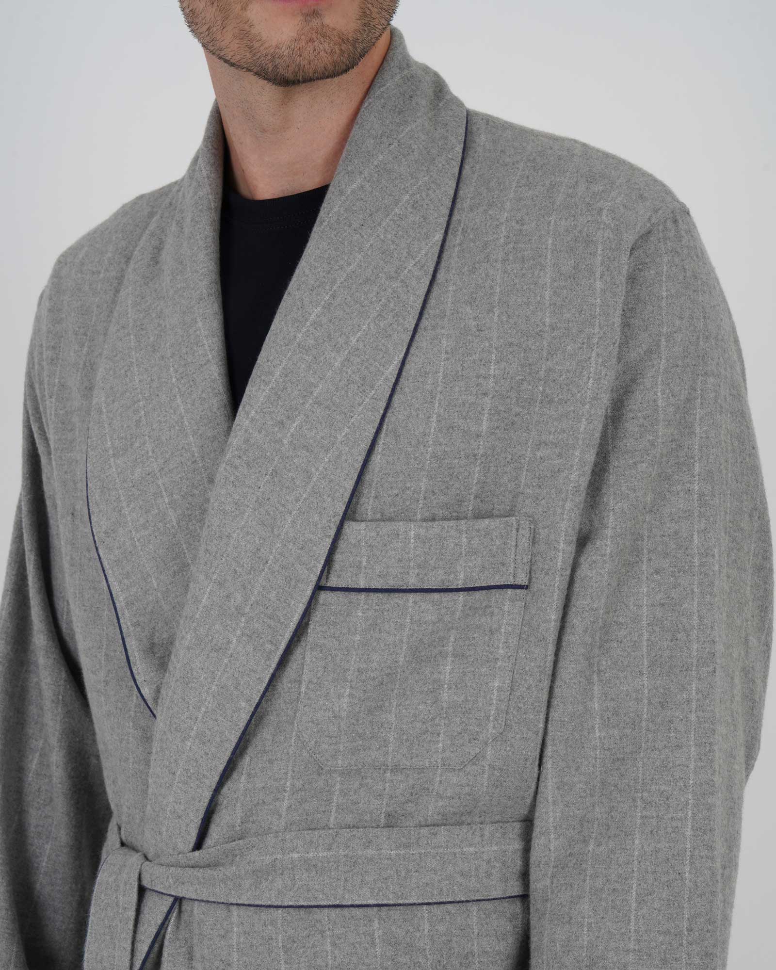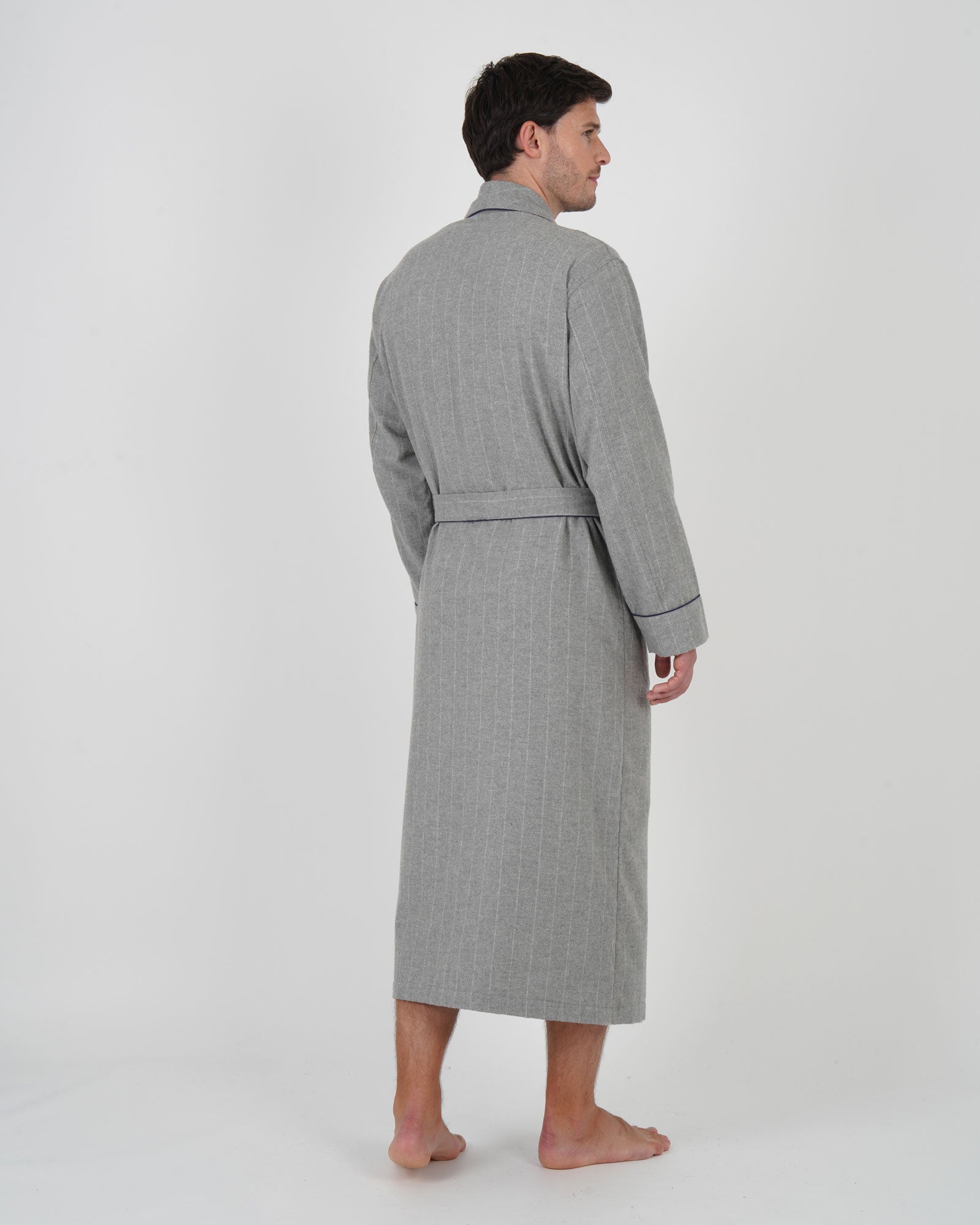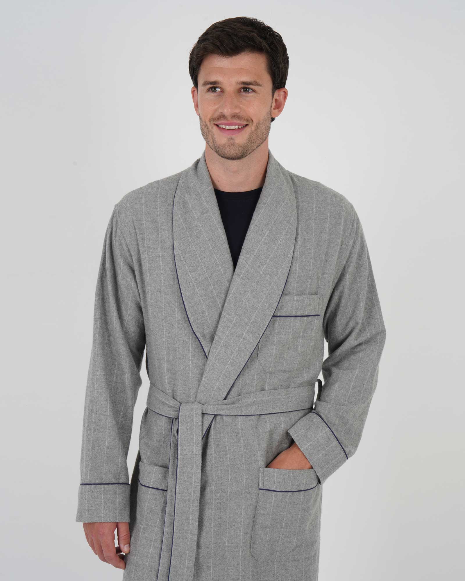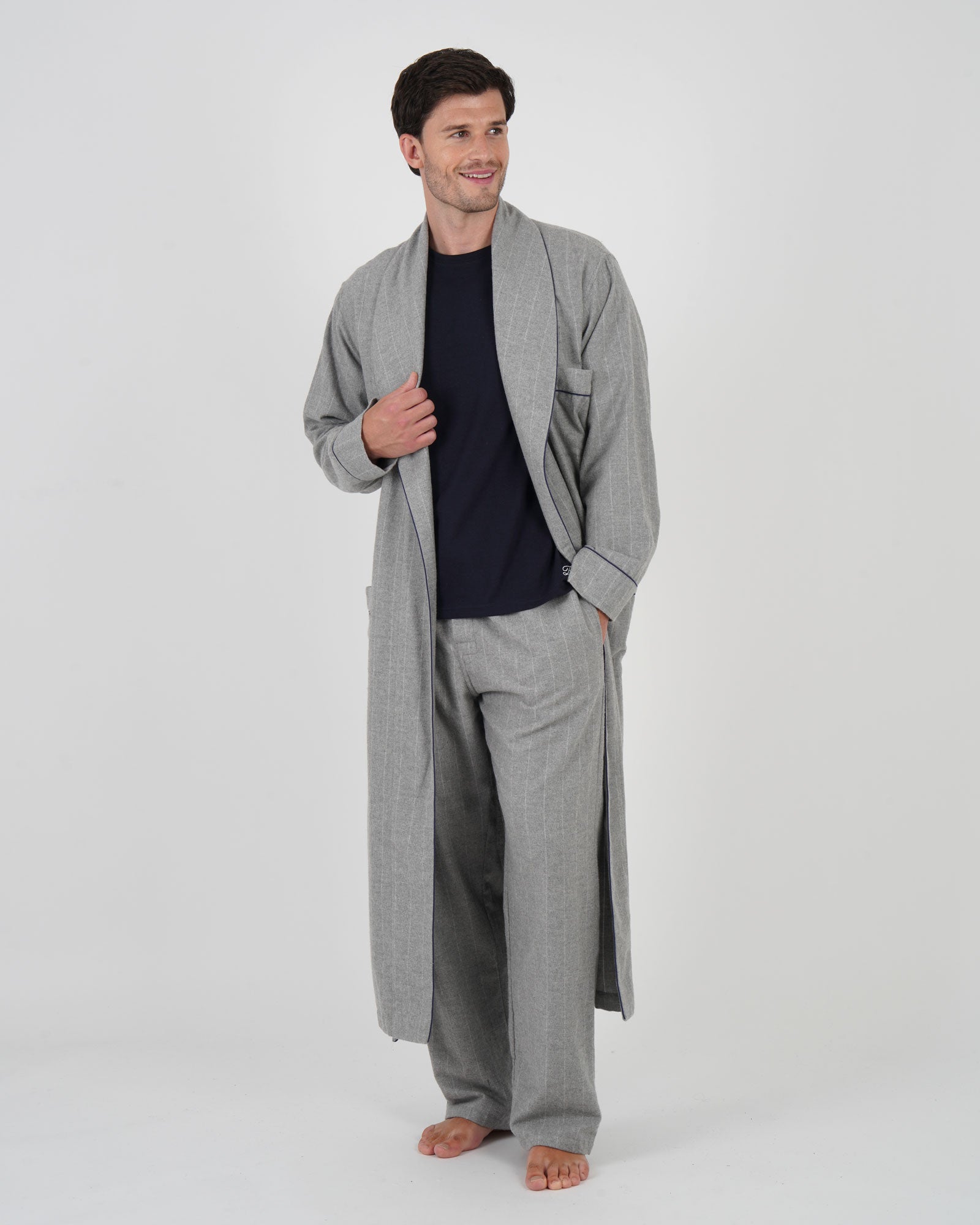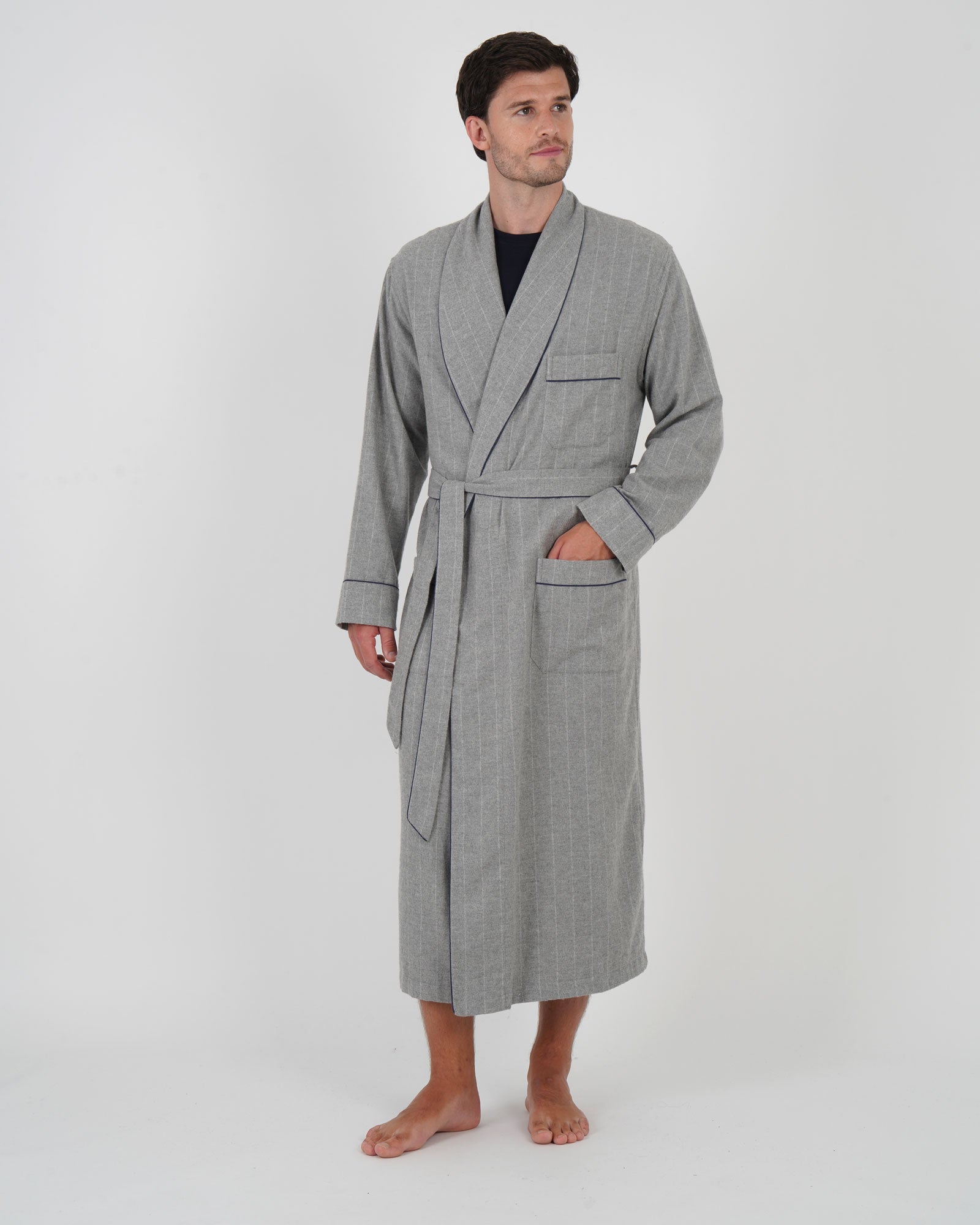 Our men's dressing gown is crafted from a sumptuously soft 100% brushed cotton. Roomy and relaxed, it has a shawl collar, wide tie belt and useful patch pockets. The perfect piece of loungewear for relaxing at home or away.
