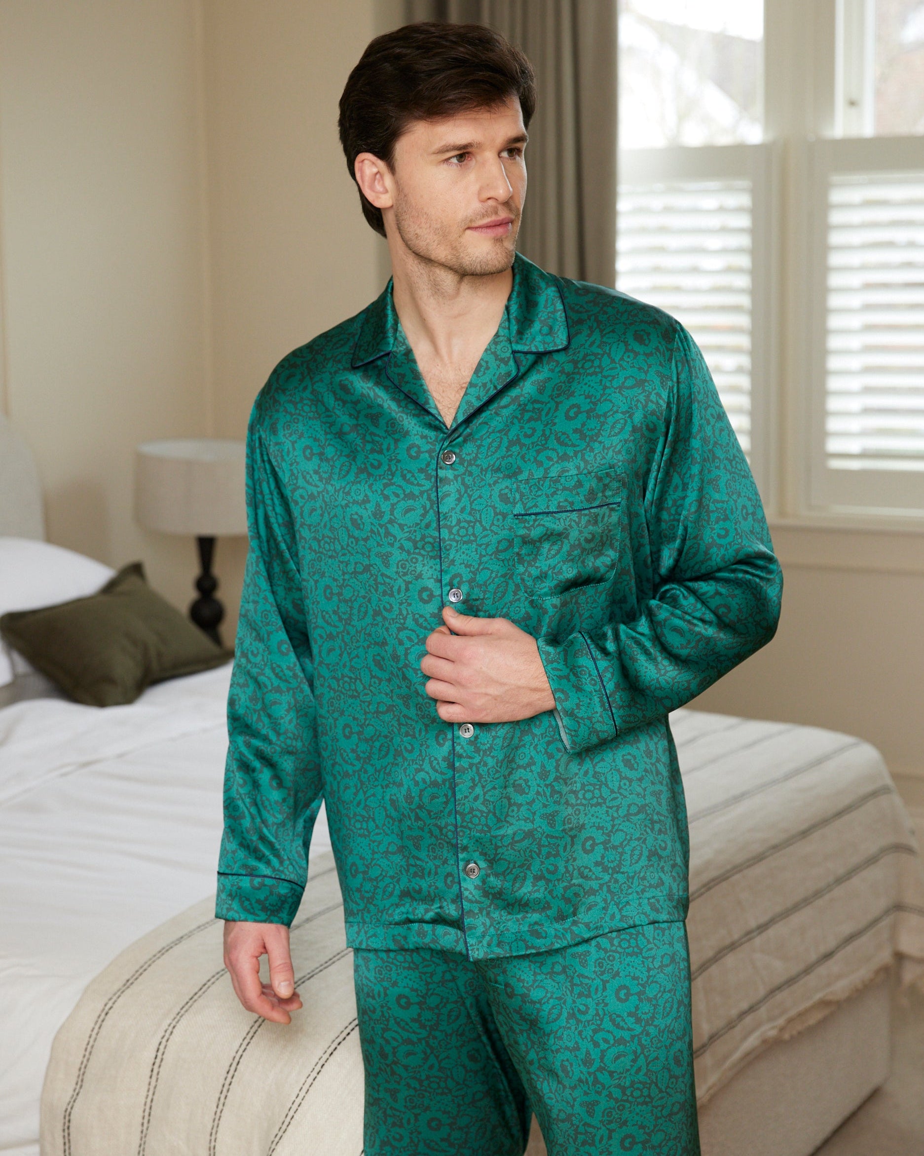 Our opulent men’s silk pyjamas are the ultimate luxury in men’s nightwear. Cut from liquid soft 19 momme 100% silk in our new season Davidson green floral Print, these silk pyjamas are created to balance comfort and style. Handcrafted in Somerset, this classic shape has been refined over the years, since its debut in 1926, but stays true to its undeniably masculine cut and traditional fit.