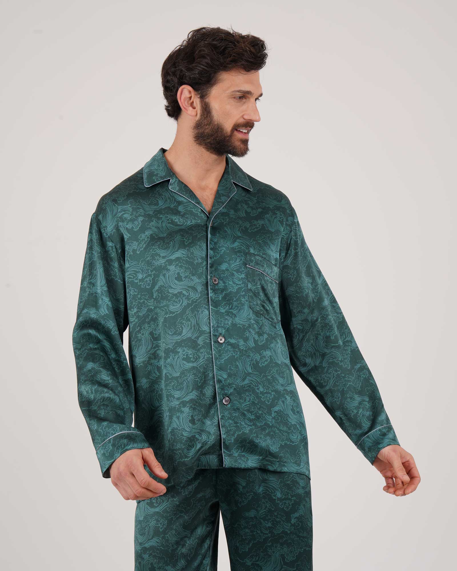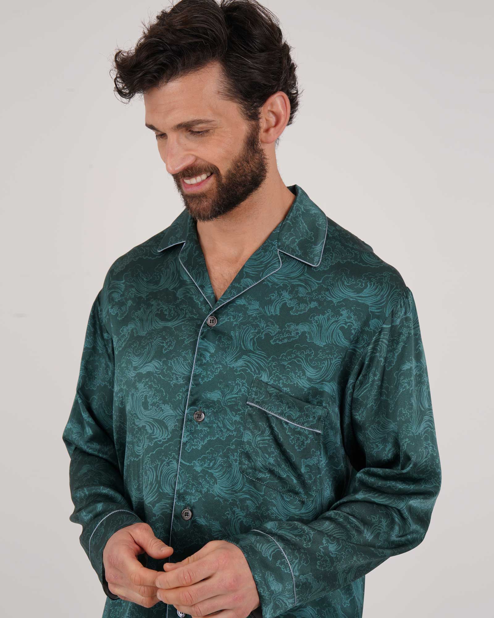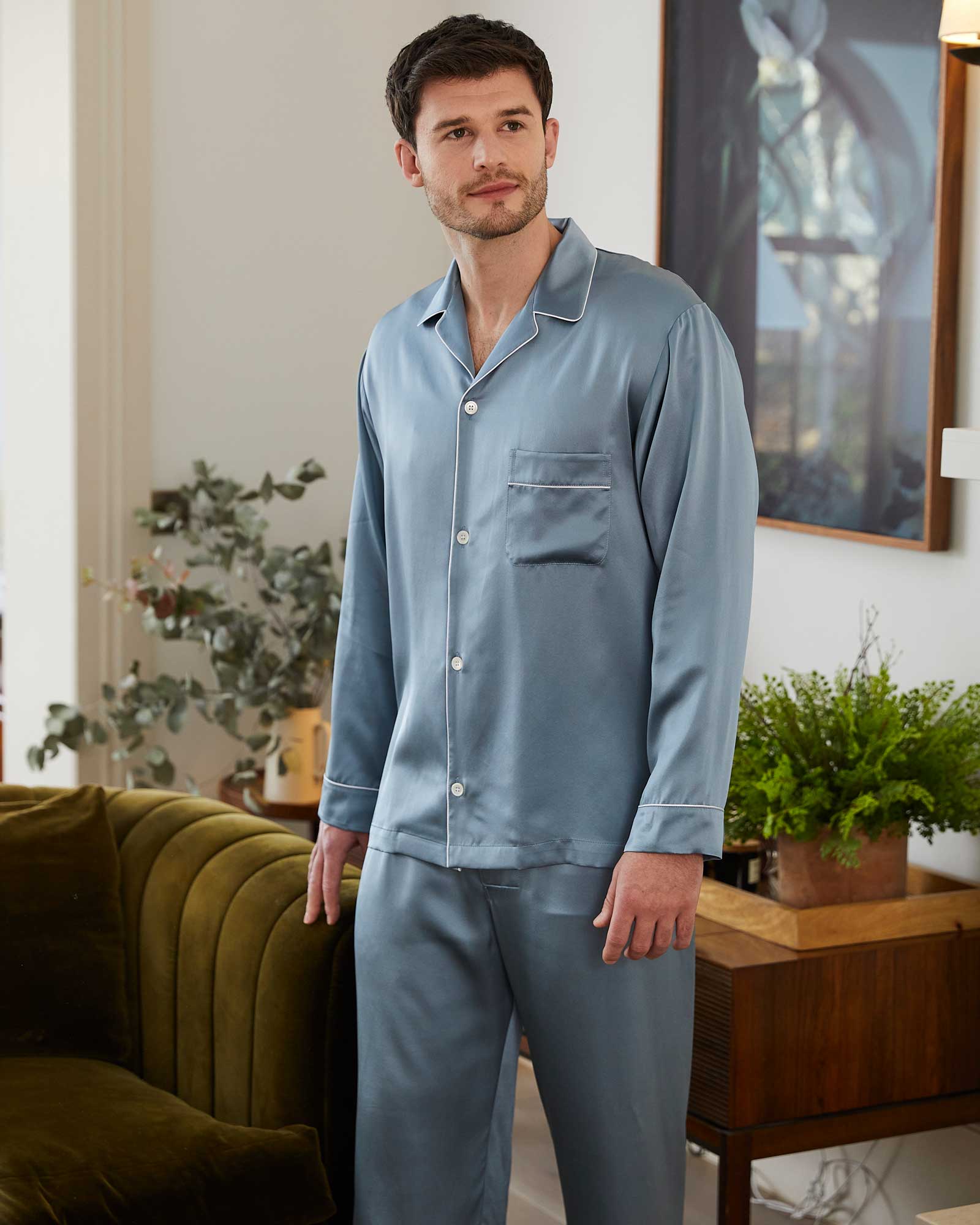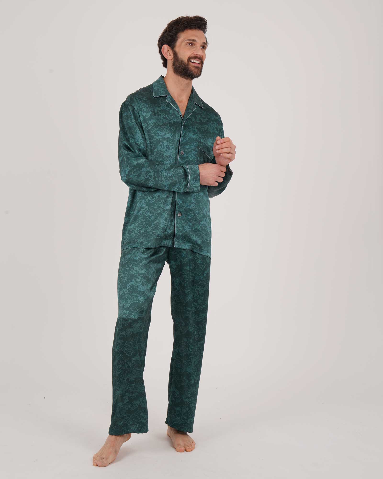Our luxurious men's silk pyjamas are the perfect loungewear addition to your seasonal wardrobe. Cut from 19 momme silk satin fabric in our amazing teal hue, these pyjamas are tailored for a relaxed yet stylish fit which ensures they won't feel restrictive when sleeping. Each piece handmade in Somerset, England the classic shape has been refined since its debut in 1926 but stays true to its undeniably masculine cut and traditional styling.