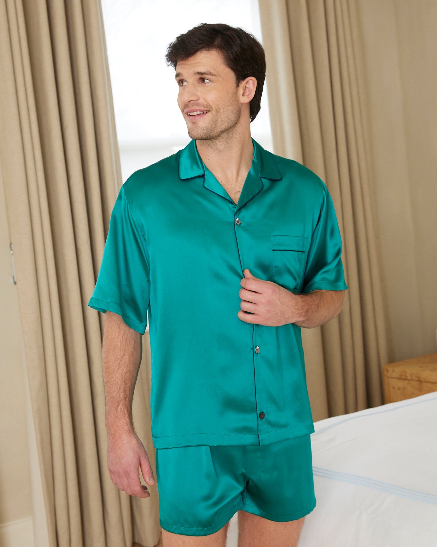 Say hello to our classic men's short pyjamas in our new green, made from luxurious 19 momme silk. These are the ultimate indulgence for the spring and summer months.