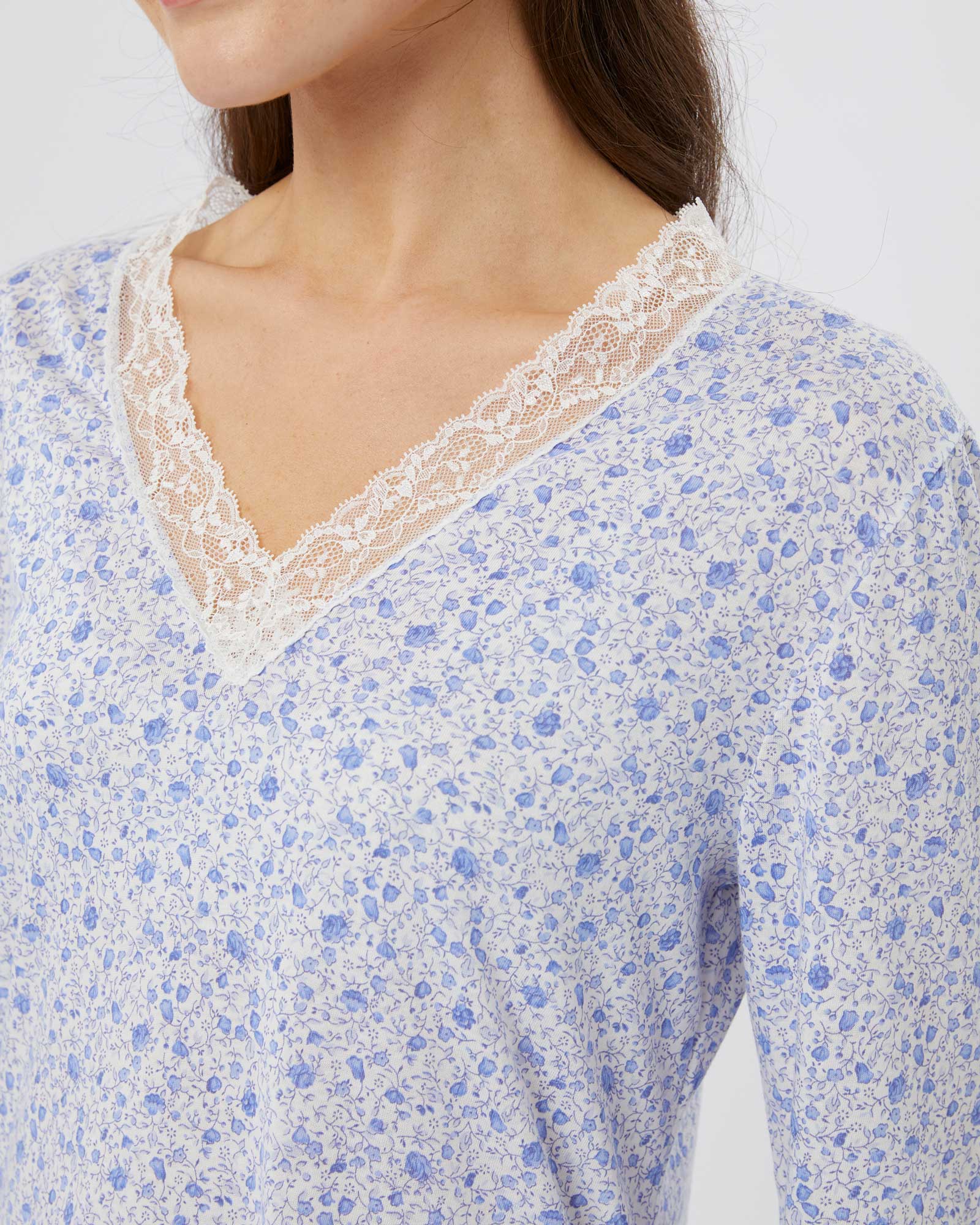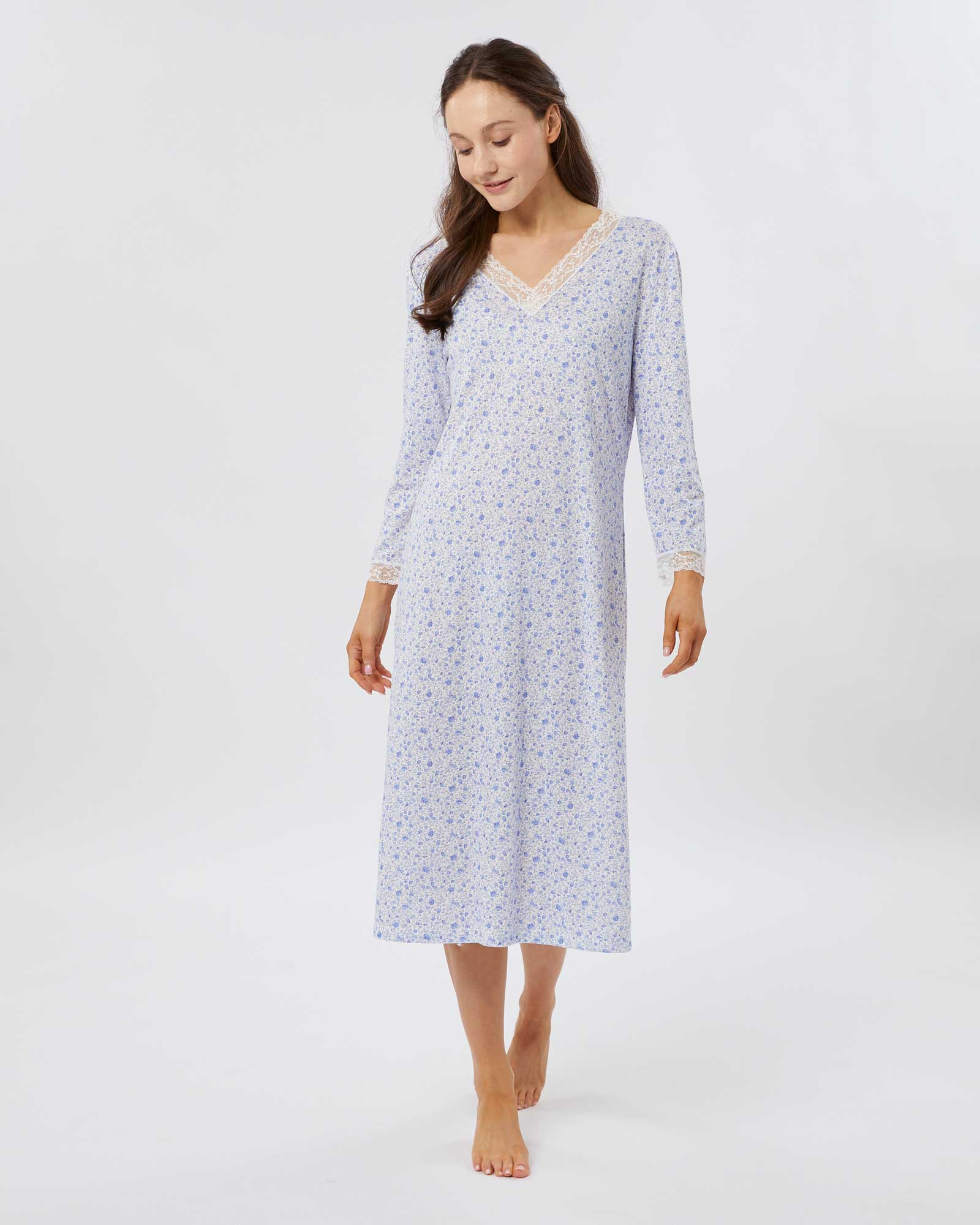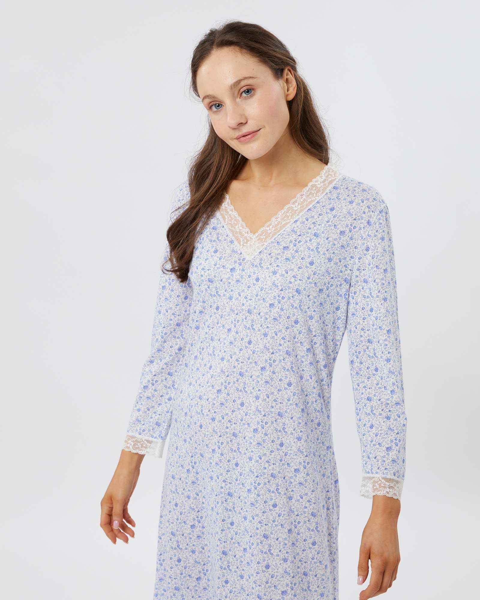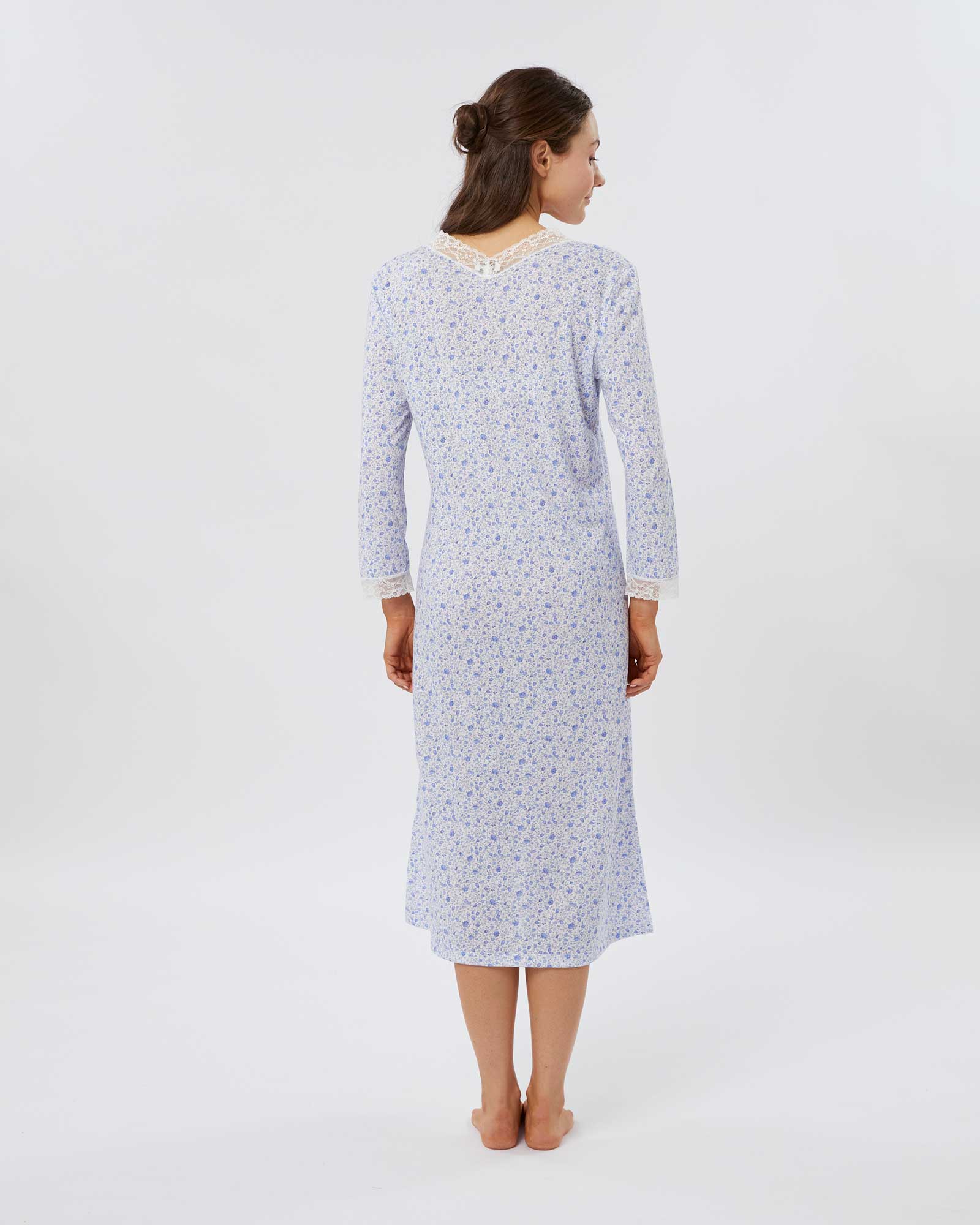 Our calf length Ella nightdress in Berry has three quarter length sleeves and is finished with lace trim at neck and cuffs. Cut from beautifully soft fabric, which is also available in our ever popular French Pleat nightdress.