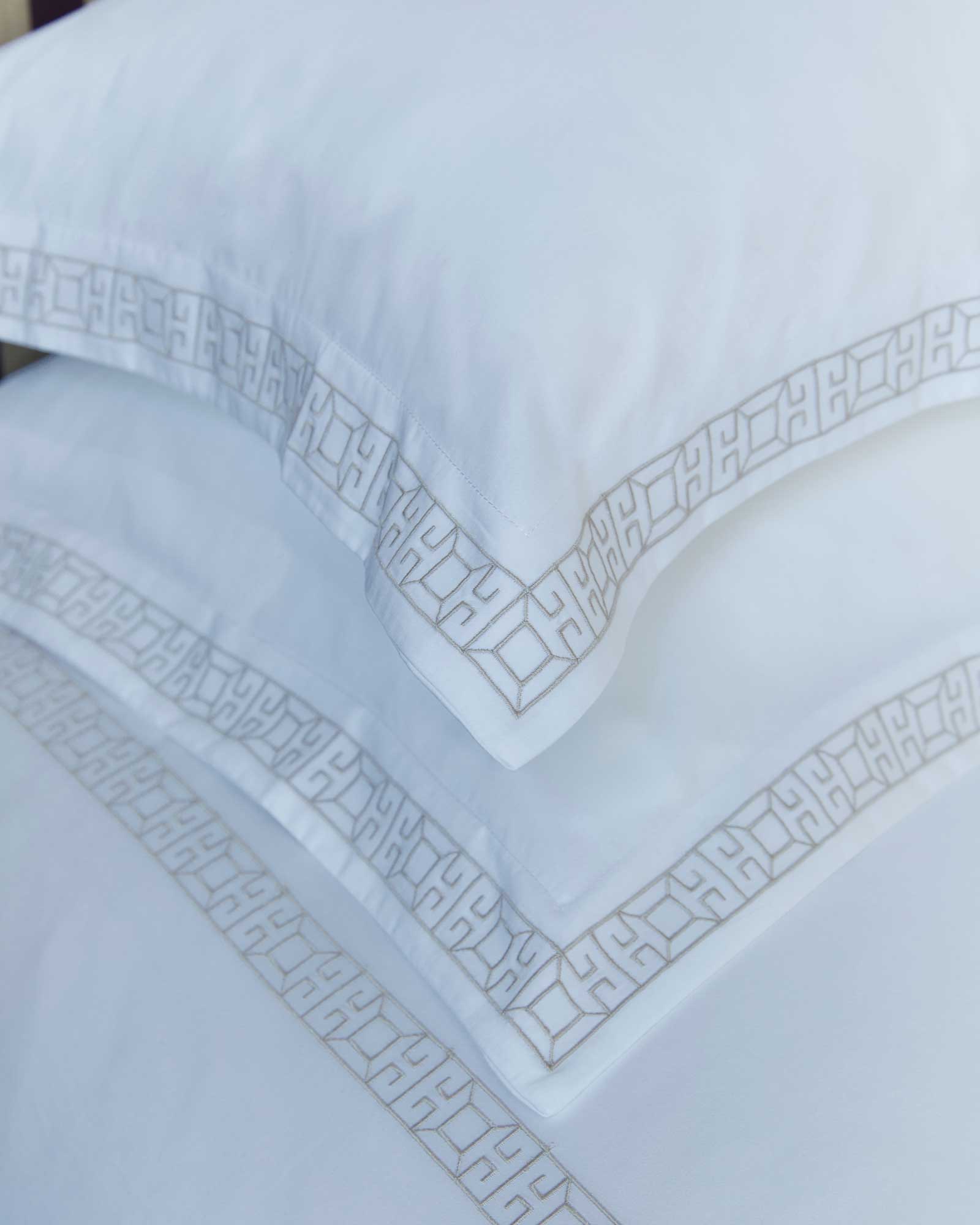 Add a sense of serene refinement to your bedroom with this beautifully embroidered bedding set, featuring a subtle geometric border in stone. Made in Portugal from 300 thread count cotton with a sateen finish, the set includes a duvet cover and two pillowcases designed to offer a luxurious feel and a crisp, tailored look. Light, breathable, and effortlessly elegant it's the perfect way to refresh your bed for the season ahead.