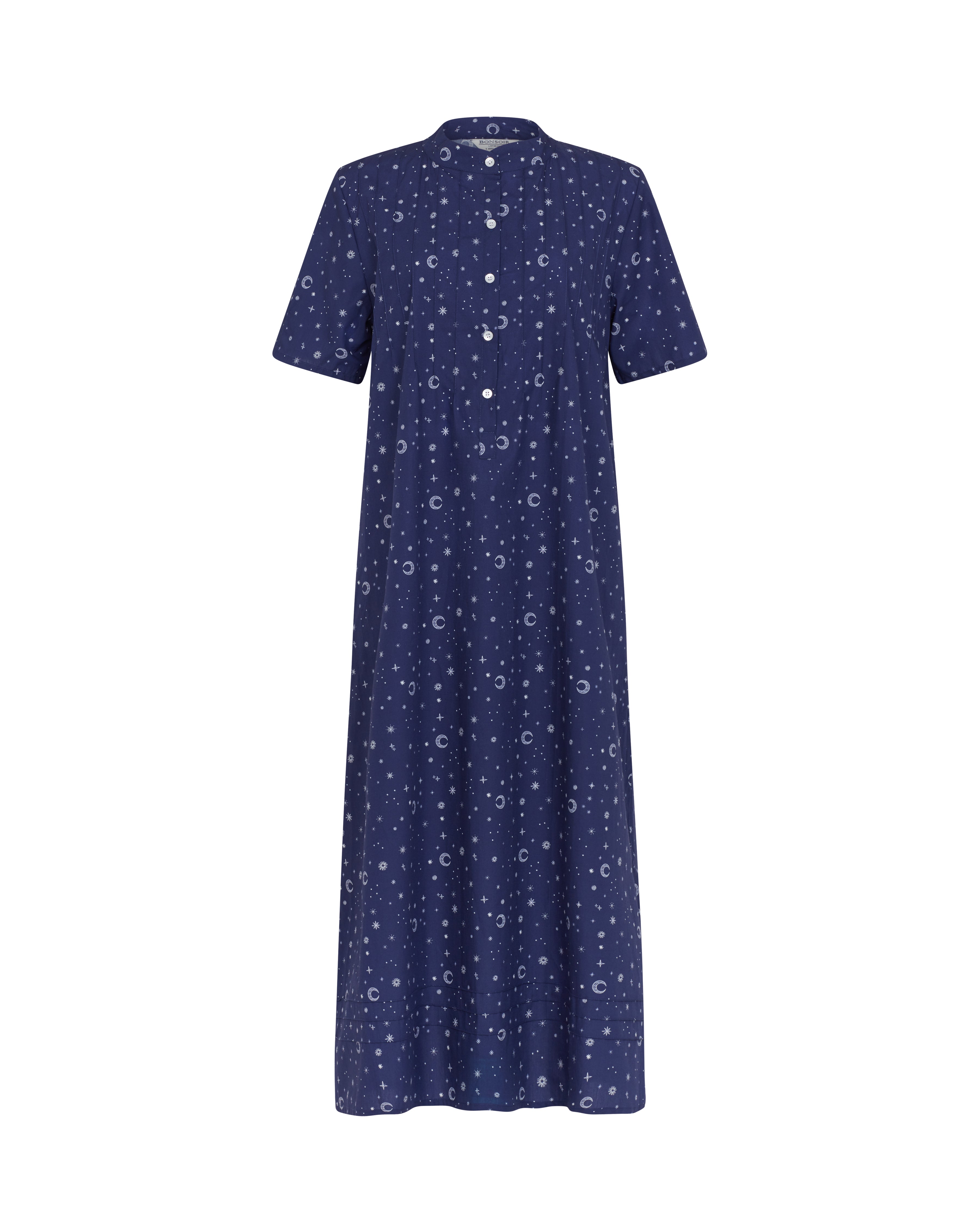 Our Victoria Short-Sleeved Cotton Nightdress in our navy blue celestial print is elegance and comfort combined, the perfect pairing for luxury sleepwear.