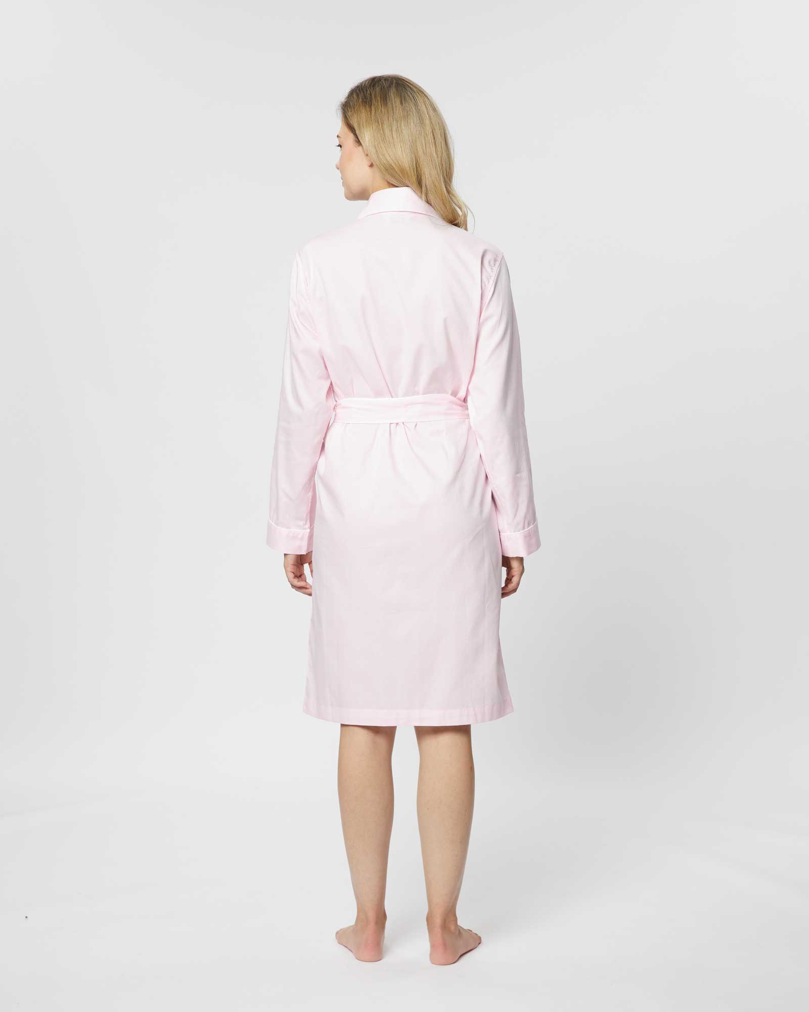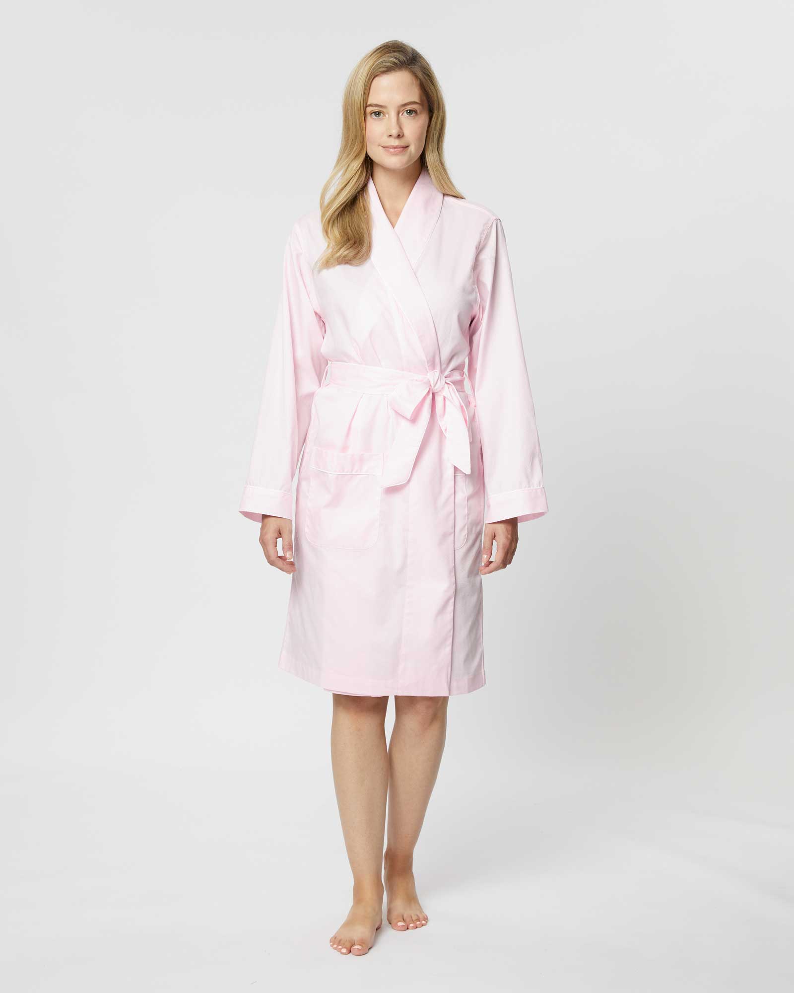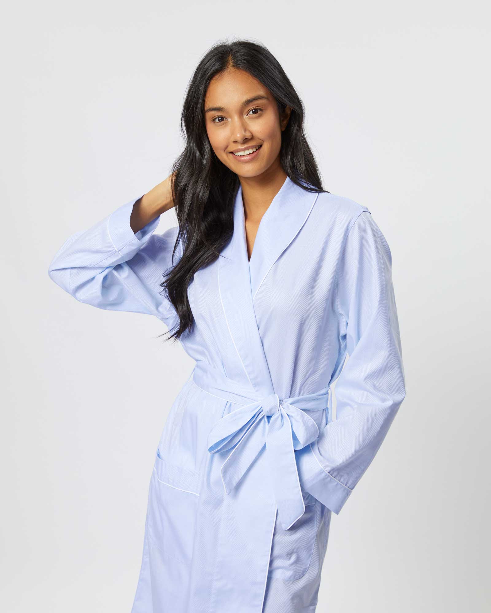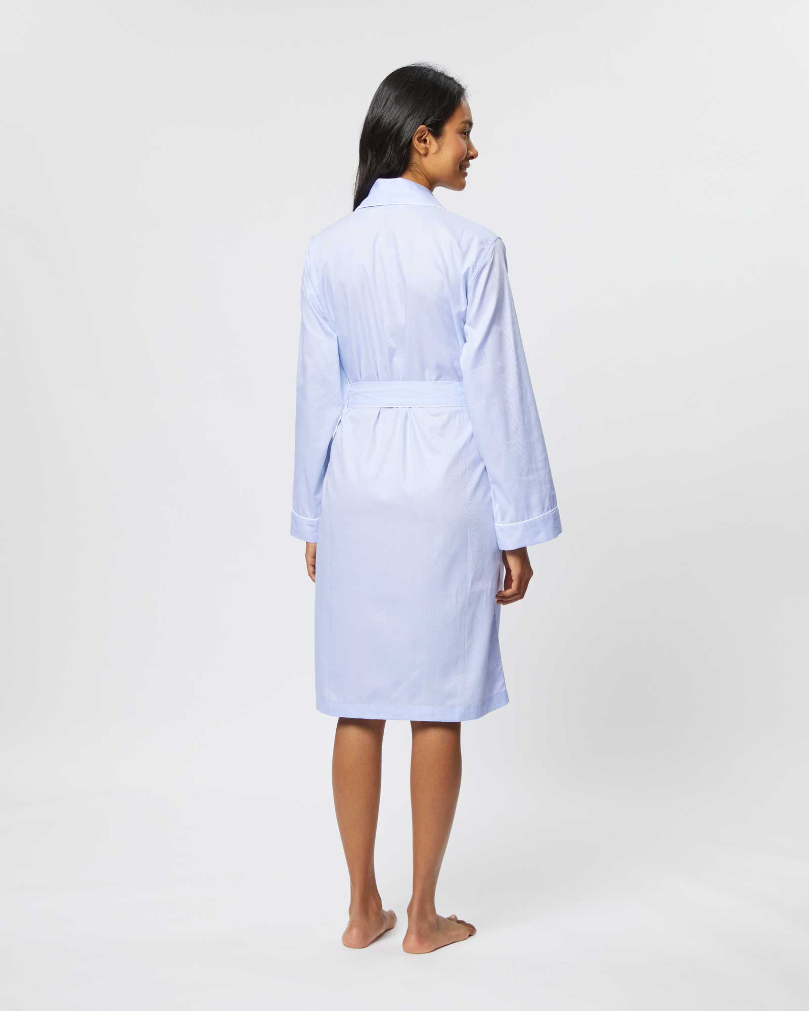 Crafted from a silky-smooth fine herringbone weave, it features a wide shawl collar, white piping, two patch pockets and a tie belt. Long Length Jacquard Gowns are also available.