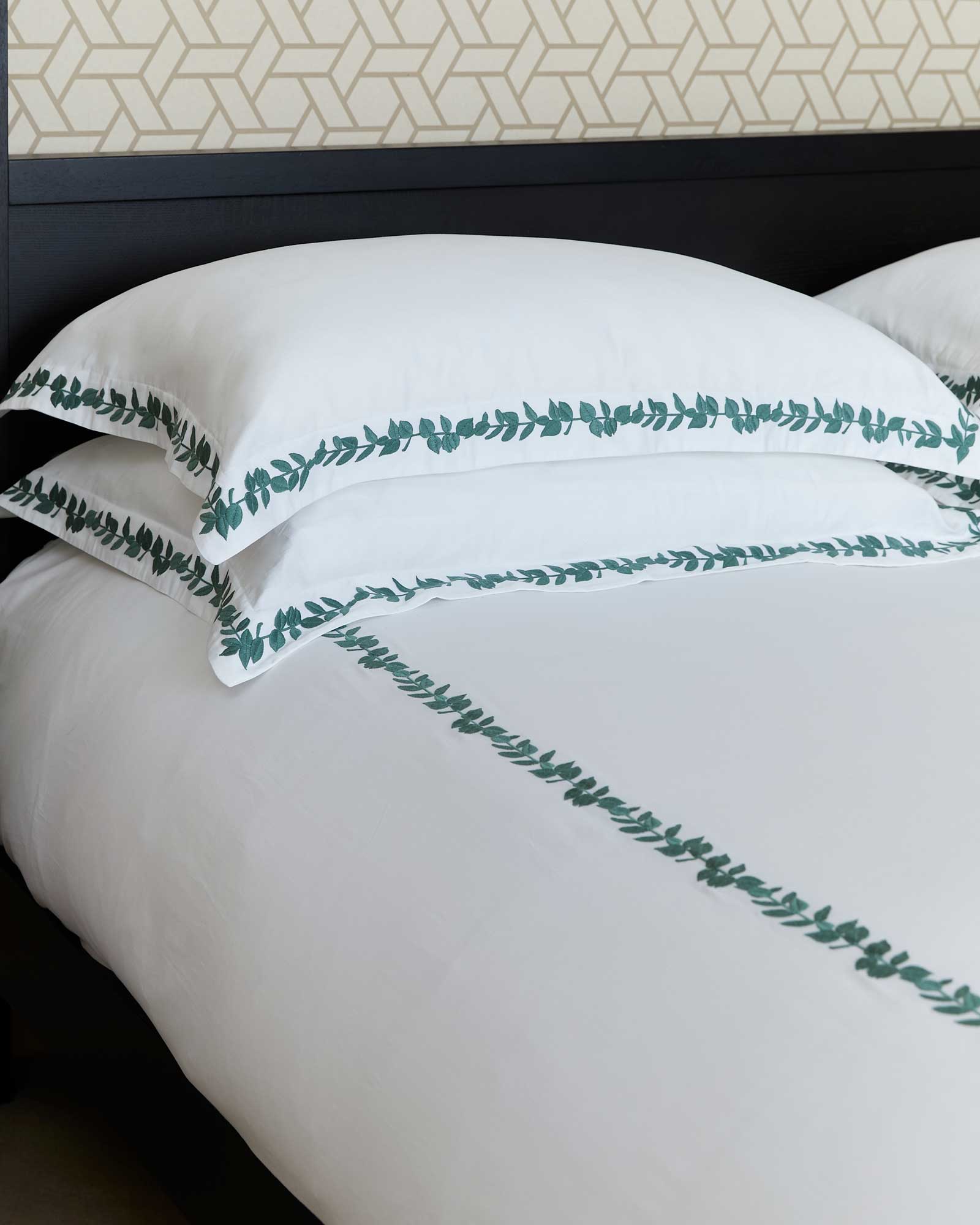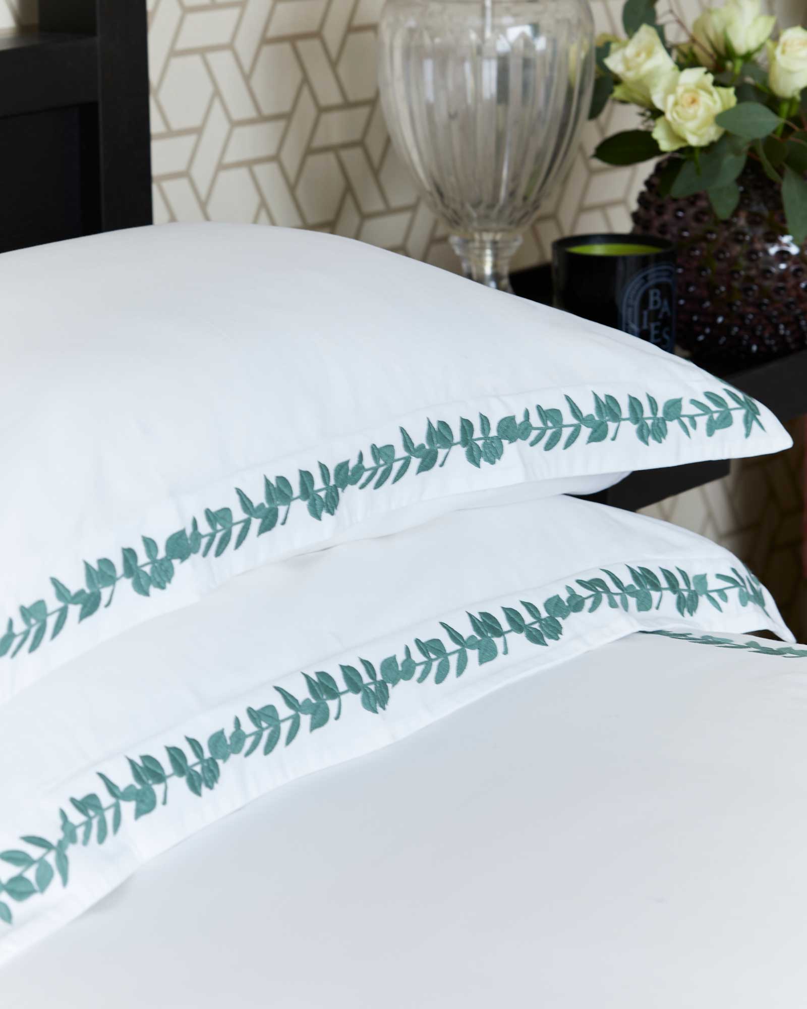 Add a touch of natural charm to your bedding with our embroidered pillowcase set, featuring a delicate green leaf motif on crisp white cotton. Crafted in Portugal from luxurious 300 thread count cotton with a smooth sateen finish, these pillowcases offer exceptional softness and a beautifully refined look perfect for refreshing your sleep space with effortless elegance.