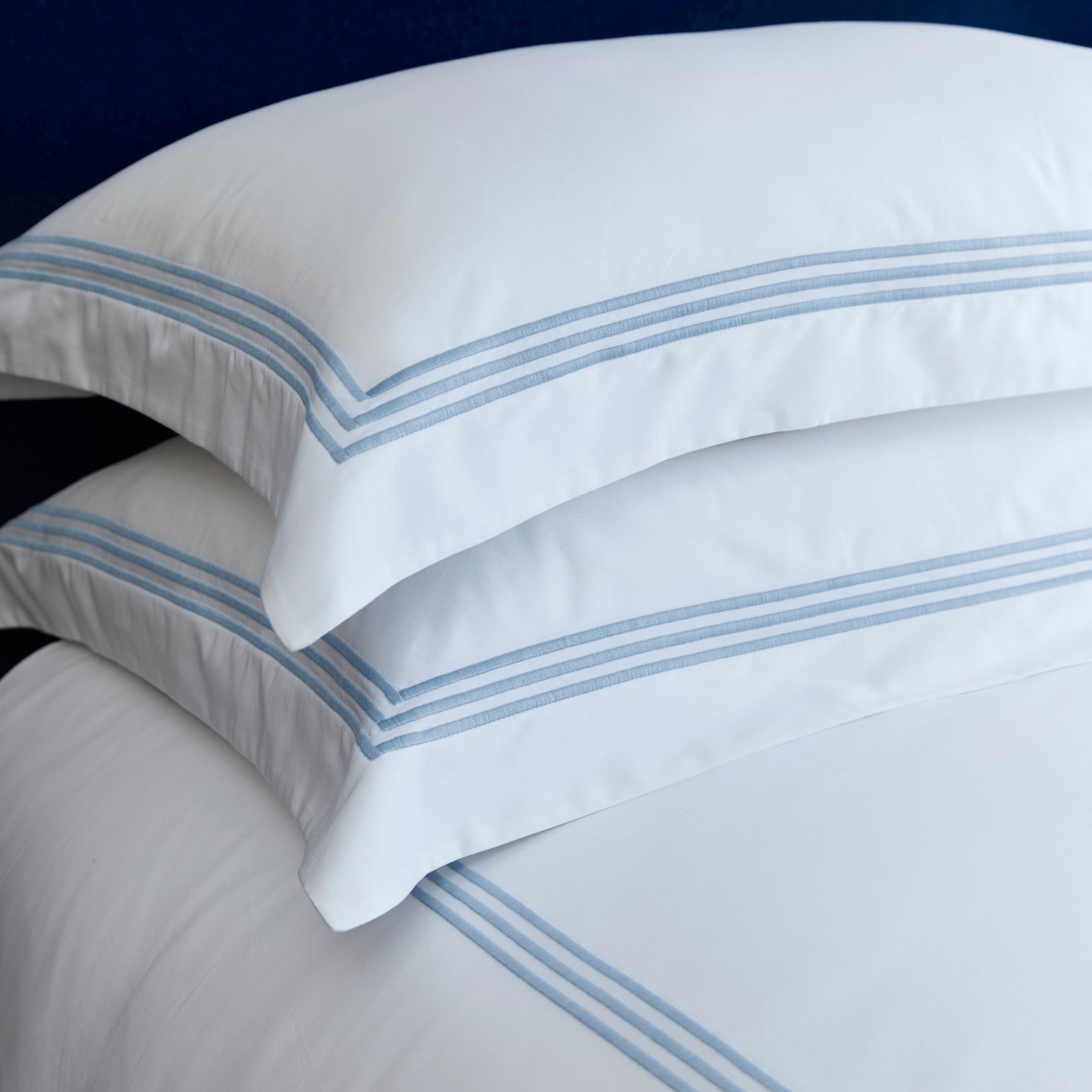 Add a sense of serene refinement to your bedroom with this beautifully embroidered bedding set, featuring a classic triple stripe in gentle light blue. Made in Portugal from 300 thread count cotton with a sateen finish, the set includes a duvet cover and two pillowcases designed to offer a luxurious feel and a crisp, tailored look. Light, breathable, and effortlessly elegant it's the perfect way to refresh your bed for the season ahead.
