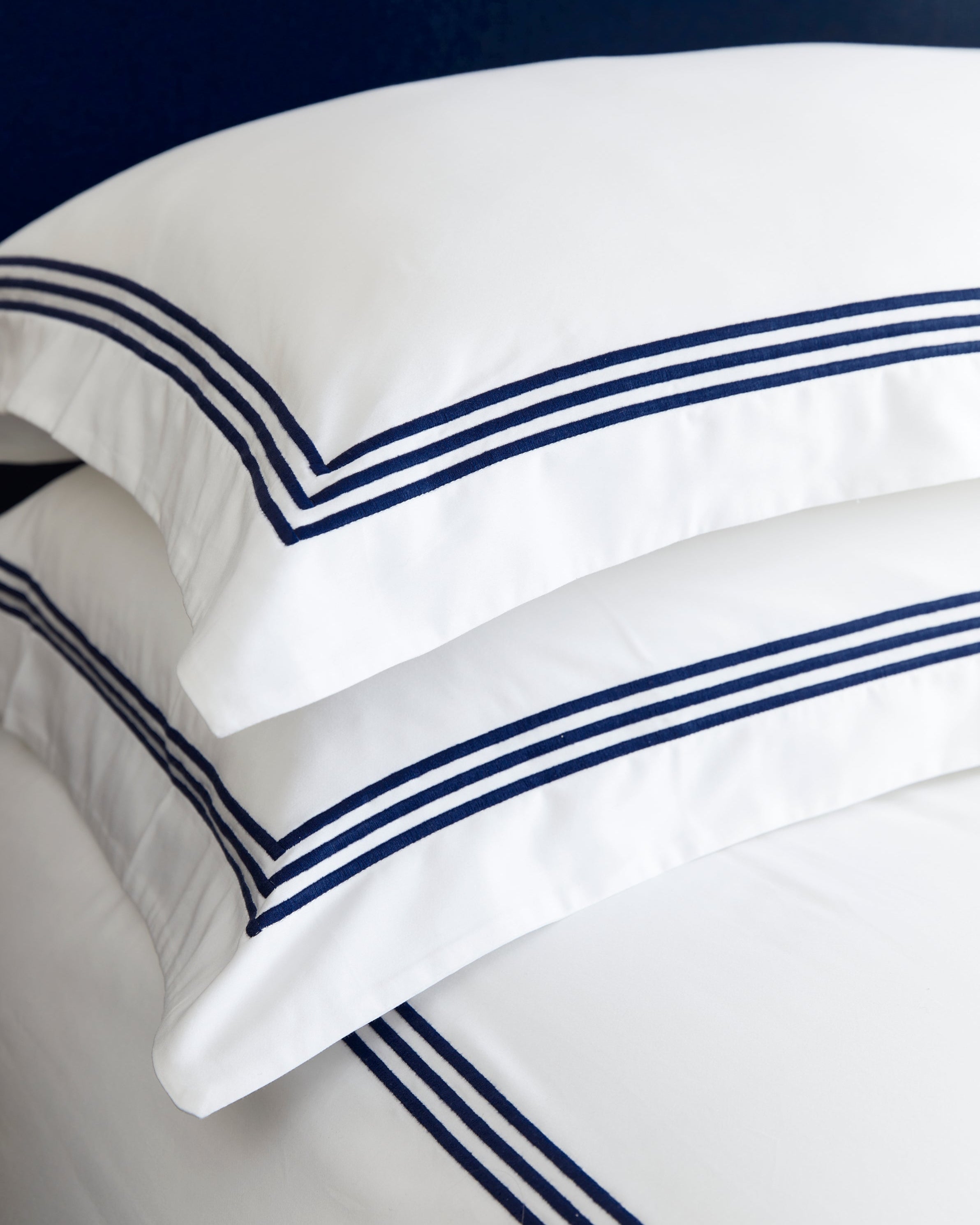 Understated and elegant, this bedding set features a crisp navy blue triple-stripe embroidery — a refined design that never goes out of style. Made in Portugal from 300 thread count cotton with a lustrous sateen finish, the set includes a duvet cover and pillowcases, all offering a smooth, breathable feel for exceptional comfort. A perfect choice for those who appreciate classic tailoring and polished, hotel-quality bed linen.