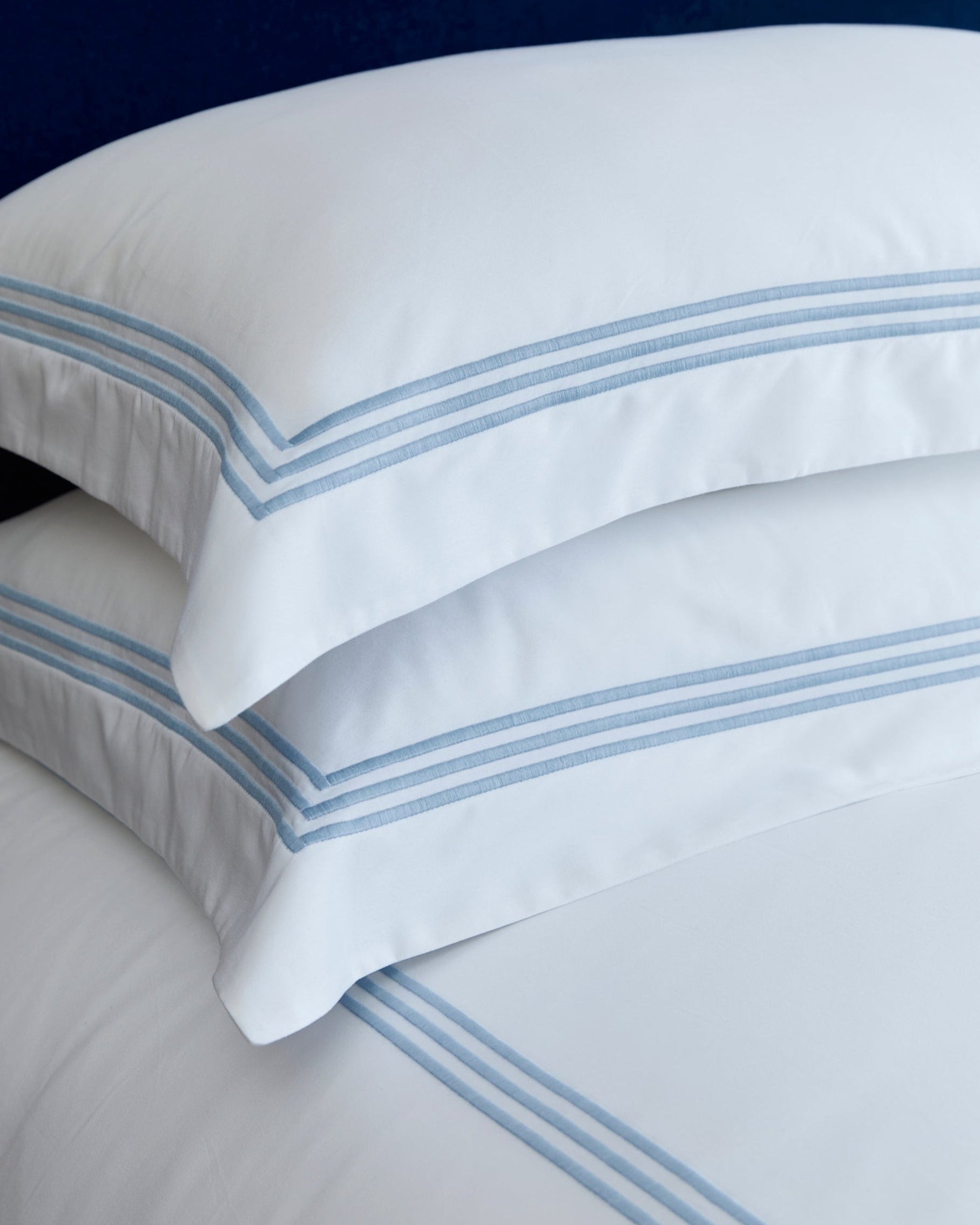 Embroidered with a soft triple stripe in delicate light blue, these pillowcases strike the perfect balance between classic design and calming charm. Woven in Portugal from 300 thread count cotton with a sateen finish, they bring breathable comfort and quiet luxury to any bed.