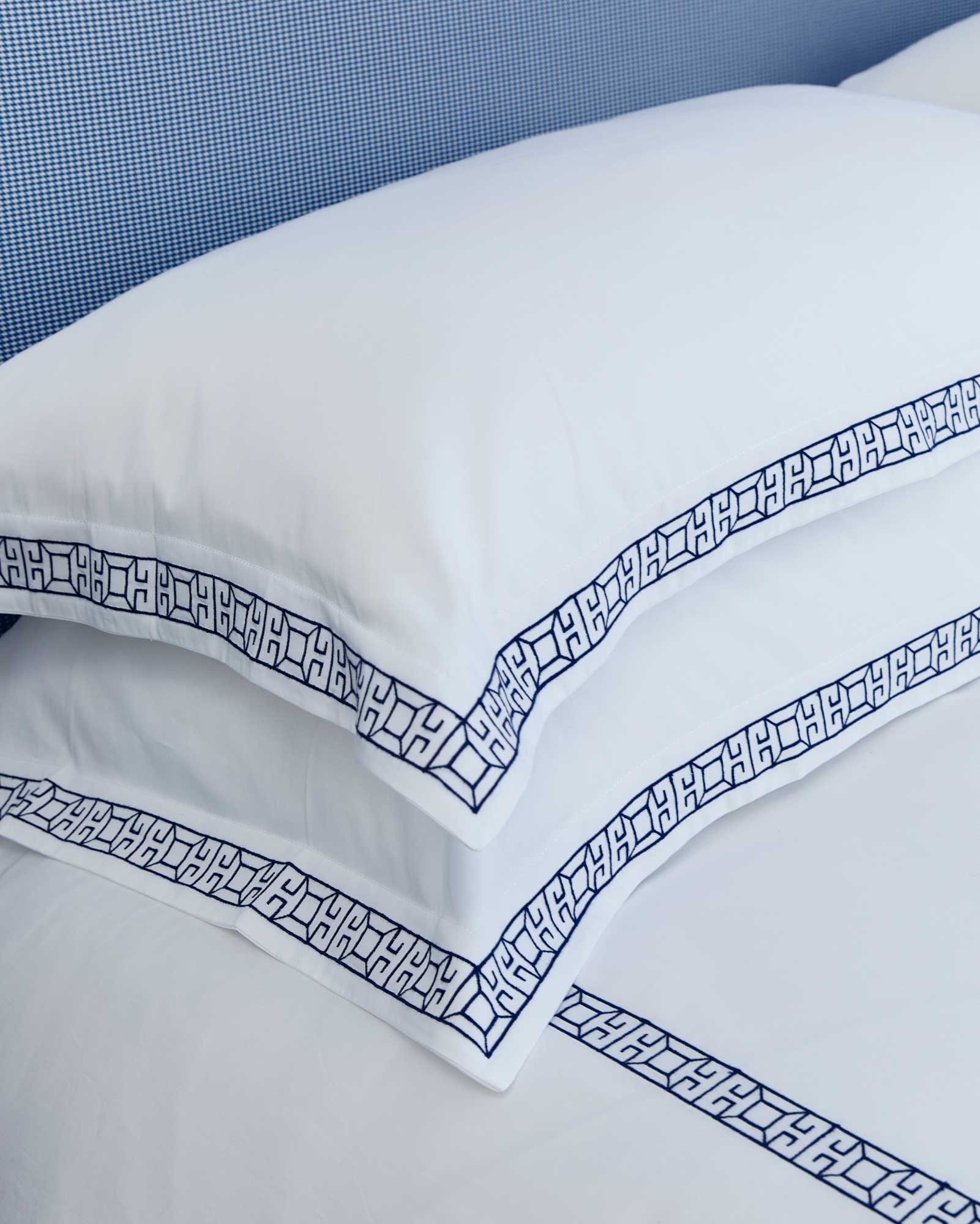 These pillowcases bring a touch of luxury to your bedroom with a classic geometric embroidery in an elegant navy. Crafted in Portugal from 300 thread count cotton with a smooth sateen finish, they offer both softness and sophistication perfect for elevating your everyday routine.