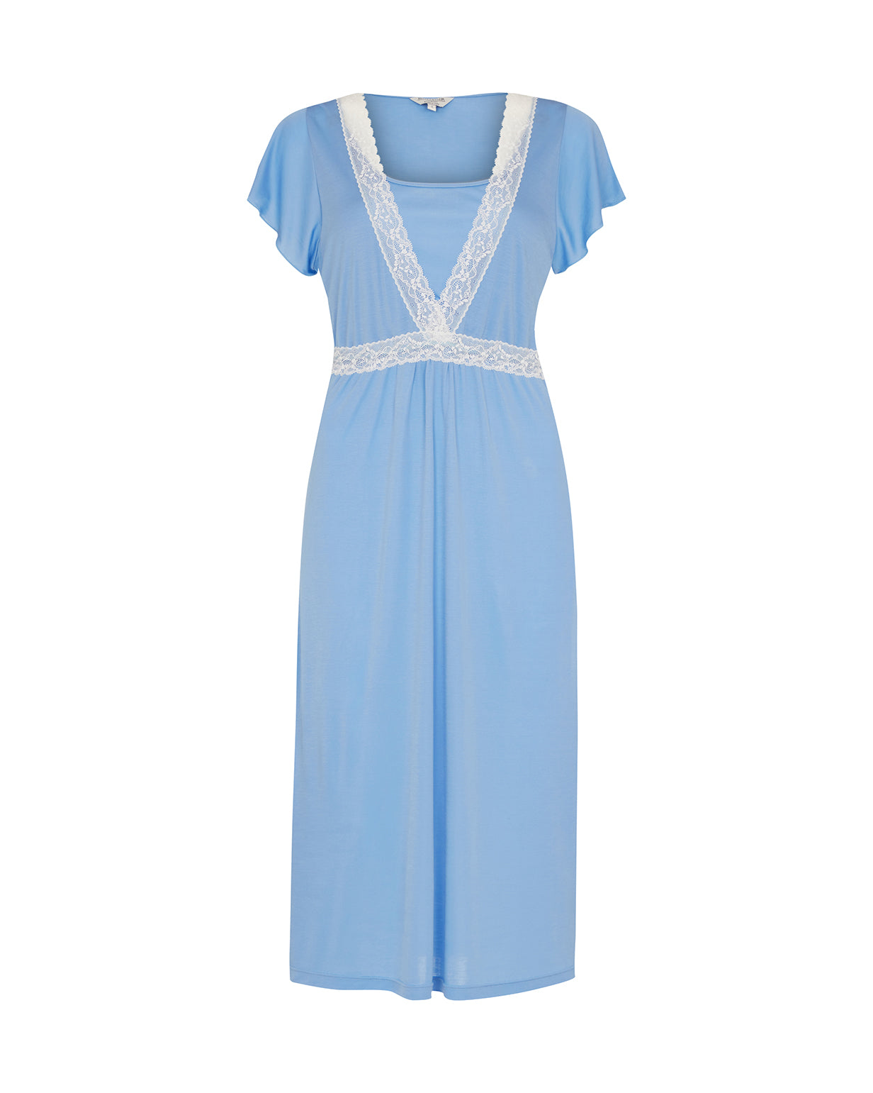 Discover our maternity & nursing jersey nightdress in sky blue with delicate ivory lace. A must-have for new mums and mums to be.