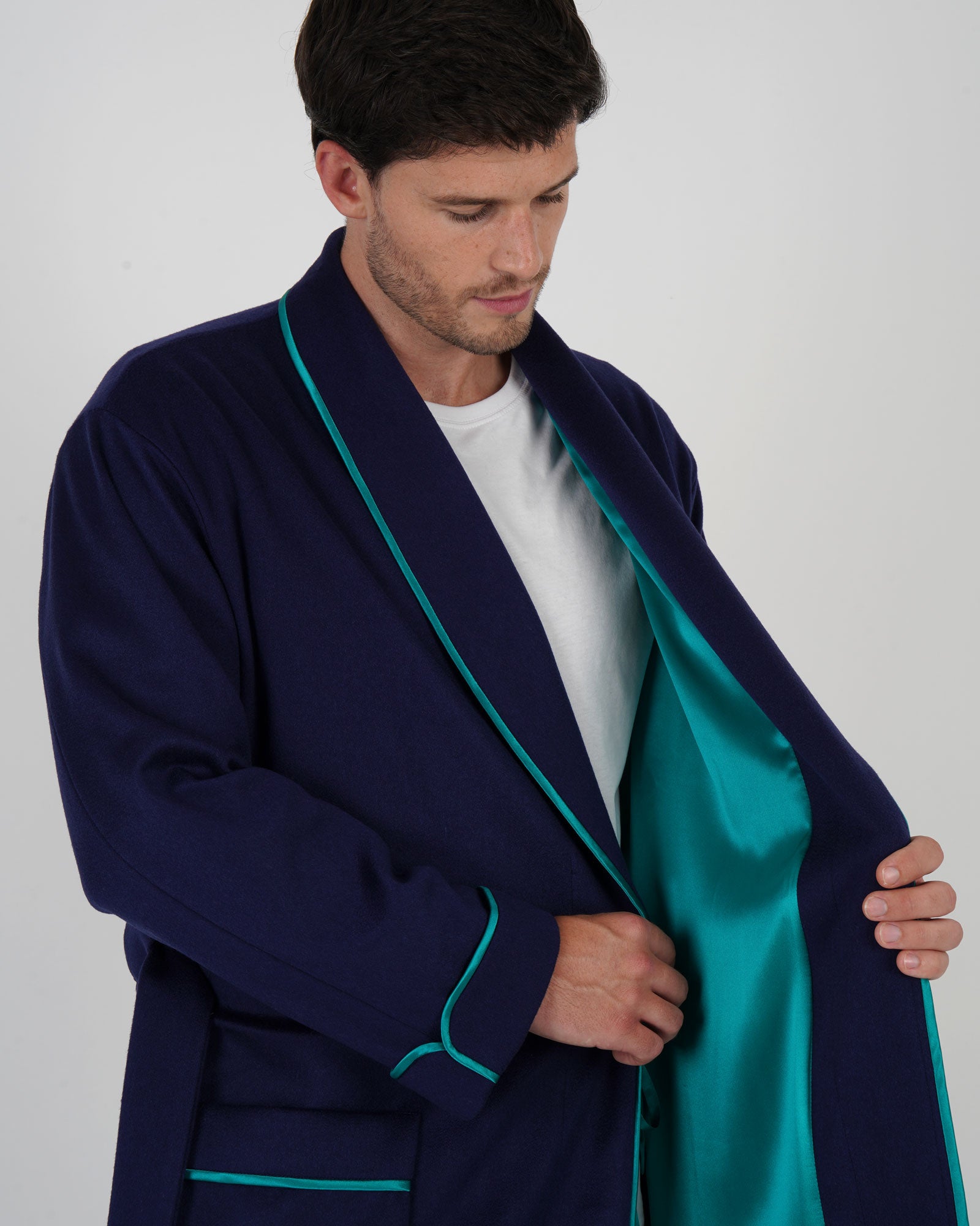 Men's Silk-Lined Cashmere Robe - Navy with Green Silk Lining