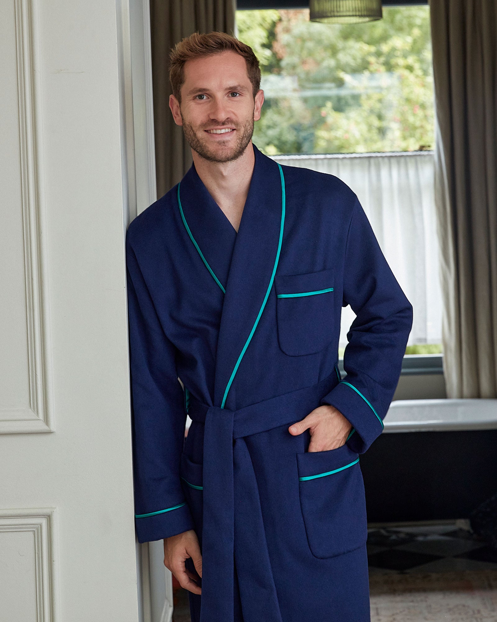 Our luxury men's cashmere robe is elevated this season with a stunning 16 momme green silk satin lining. Expertly handcrafted by our team of seamstresses in Somerset, our wonderfully soft Italian robe features turn-back cuffs, pockets and a shawl collar, all beautifully finished with cord piping detail for a refined result. The dressing gown has a wrap over front secured with a wide tie belt and inside ties for ease and comfort.