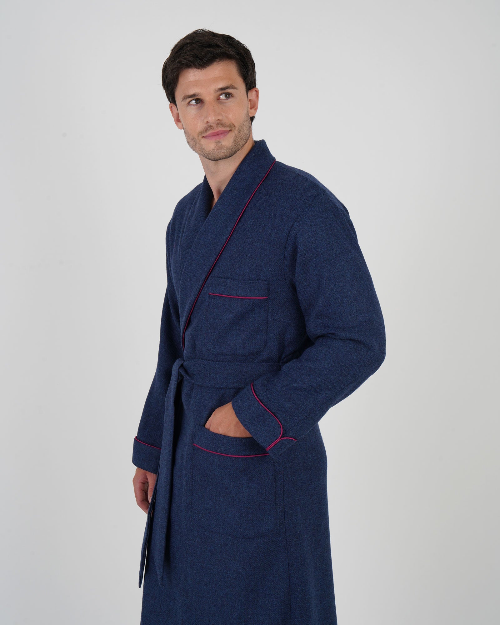 Our exquisite men's wool dressing gown is a Bonsoir icon. Carefully tailored to order by our expert seamstresses in Somerset, our wool robe is made using lambswool responsibly sourced from the UK. Fully lined with silk, and generously cut for a relaxed and comfortable fit. It features a shawl collar, three pockets, turn-back cuffs, inside ties and a wide tie belt.