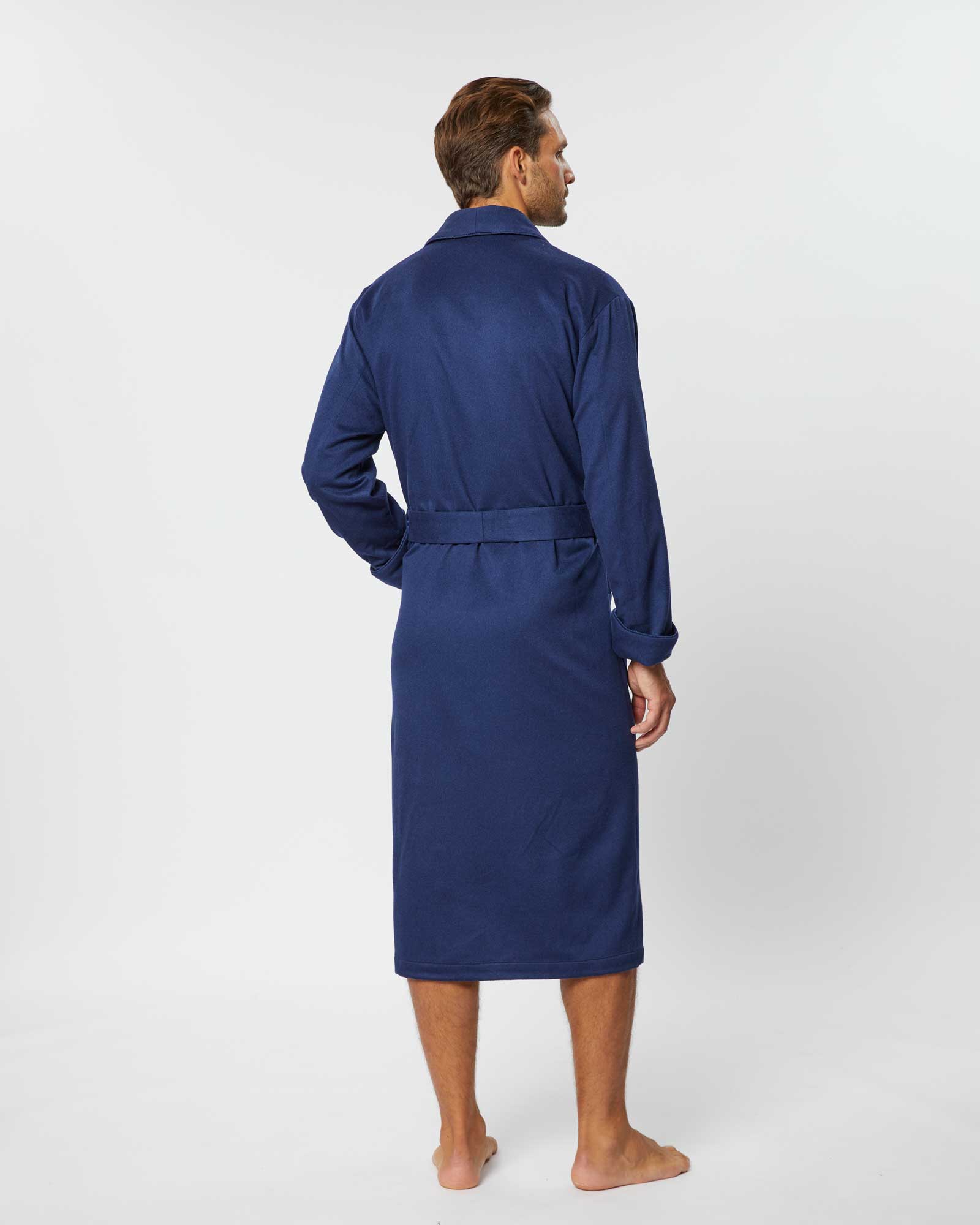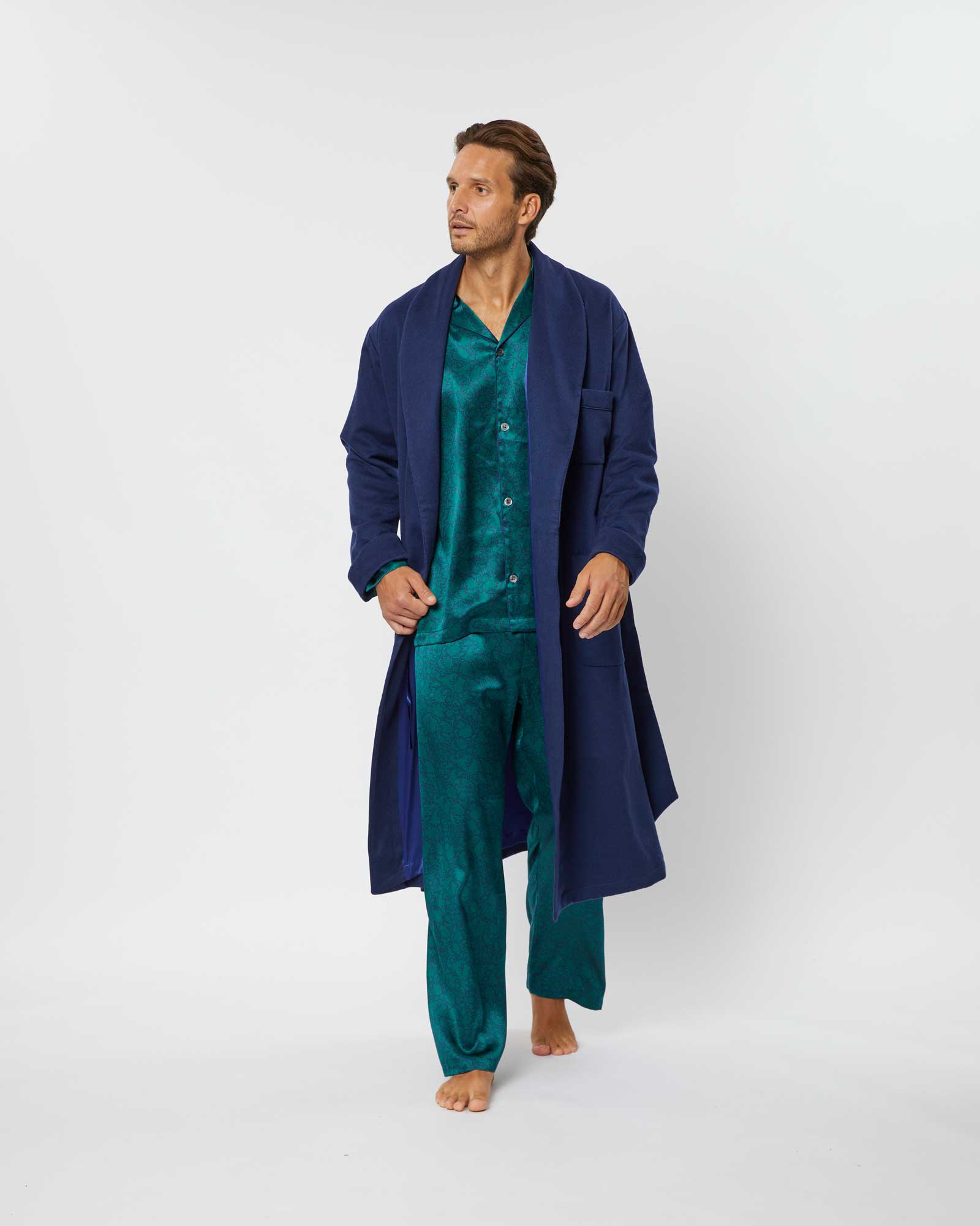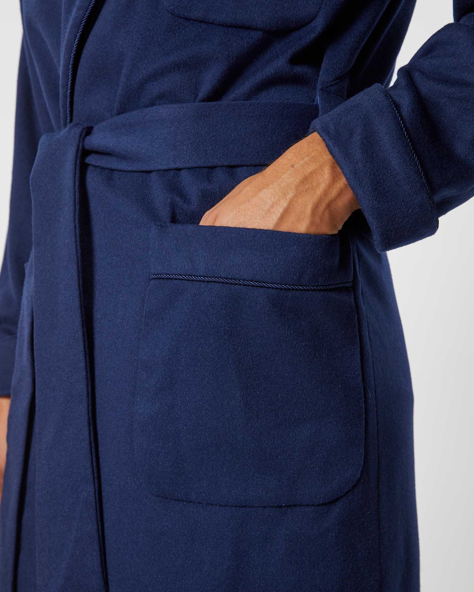 Our men's silk-lined cashmere robe in navy is individually tailored to order in a wonderfully soft Italian cashmere. Expertly handcrafted by our team of seamstresses in Somerset, it features turn-back cuffs, pockets and a shawl collar, all beautifully finished with piping detail for a refined result. The dressing gown has a wrap over front secured with a wide tie belt for ease and comfort. The ultimate gift or investment piece, this is luxury loungewear at its best.
