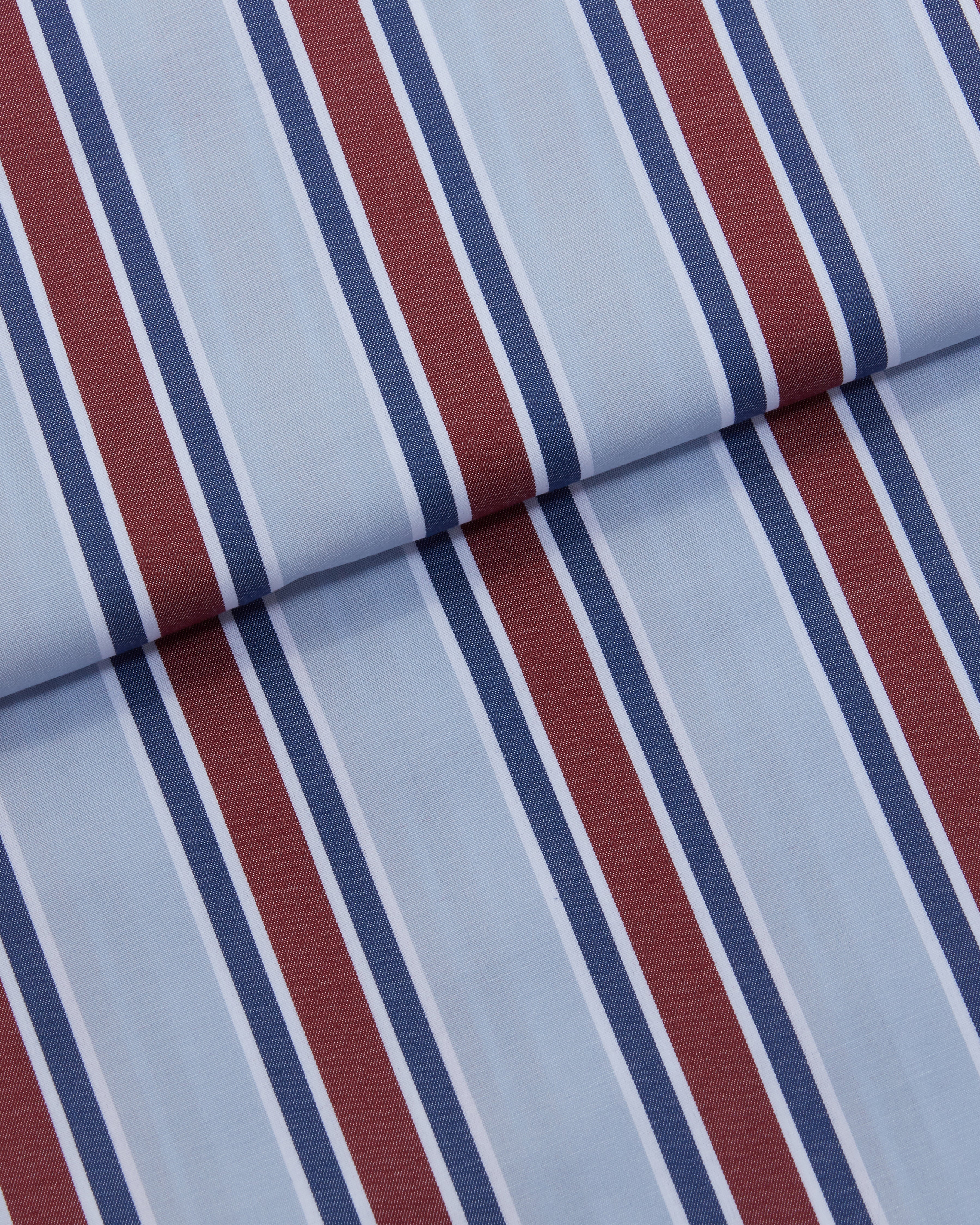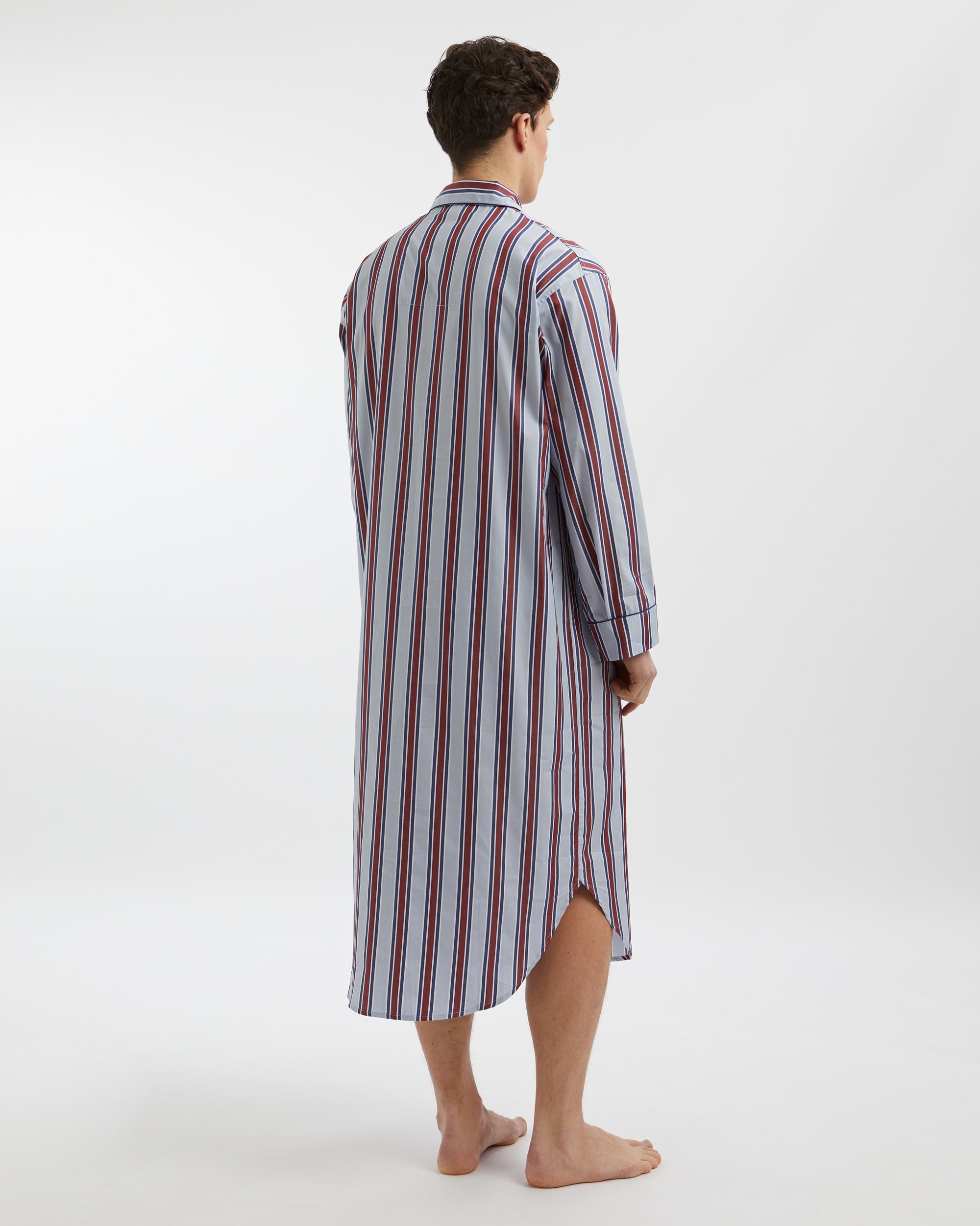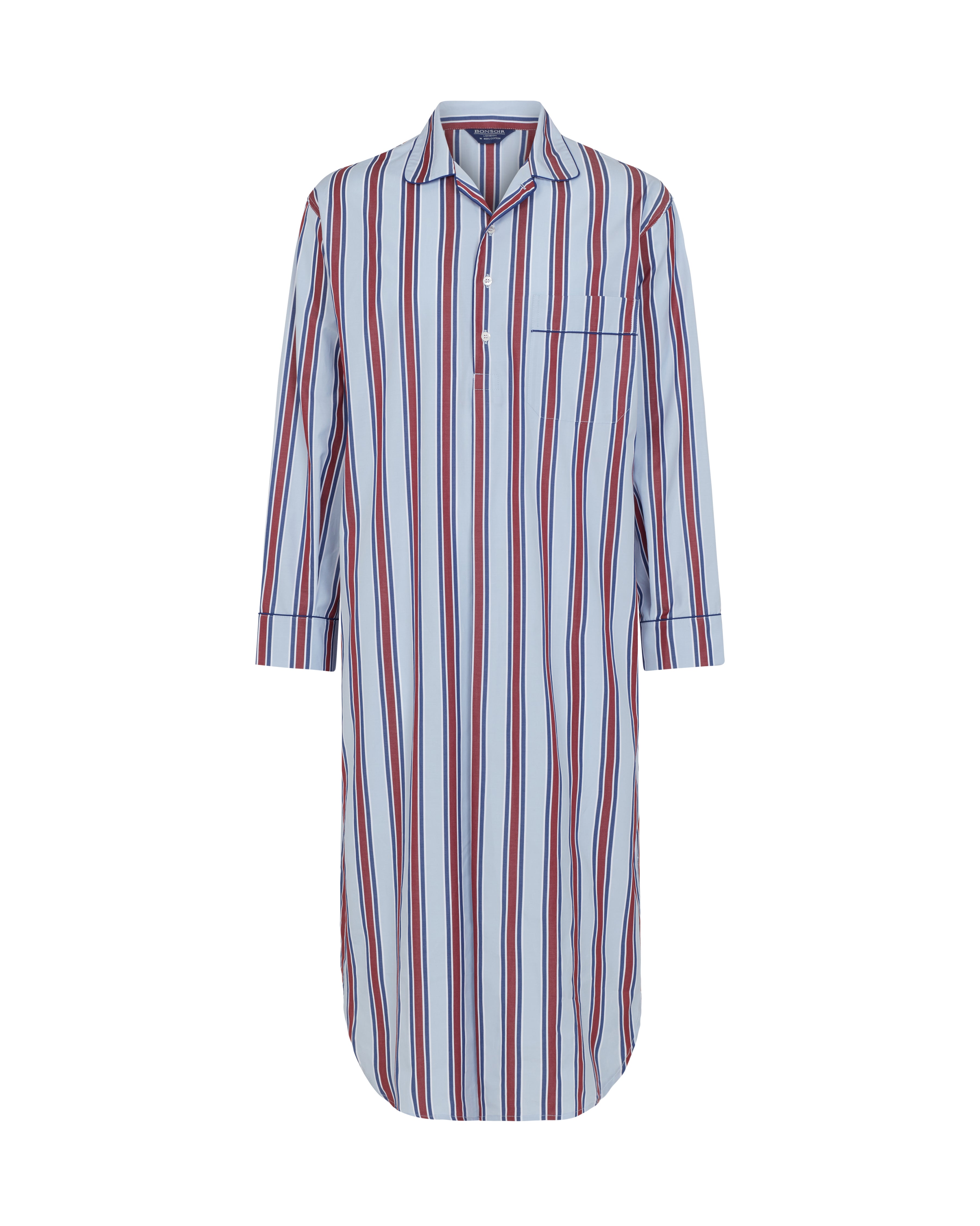 This exceptionally smooth two-fold fabric is created by using extra fine yarns which are spun together, producing a super fine weave. The Crawford stripe is a classic two-fold design in burgundy and sky blue stripes. Our classic nightshirts are the perfect piece of loungewear for working at home, relaxing and sleep.