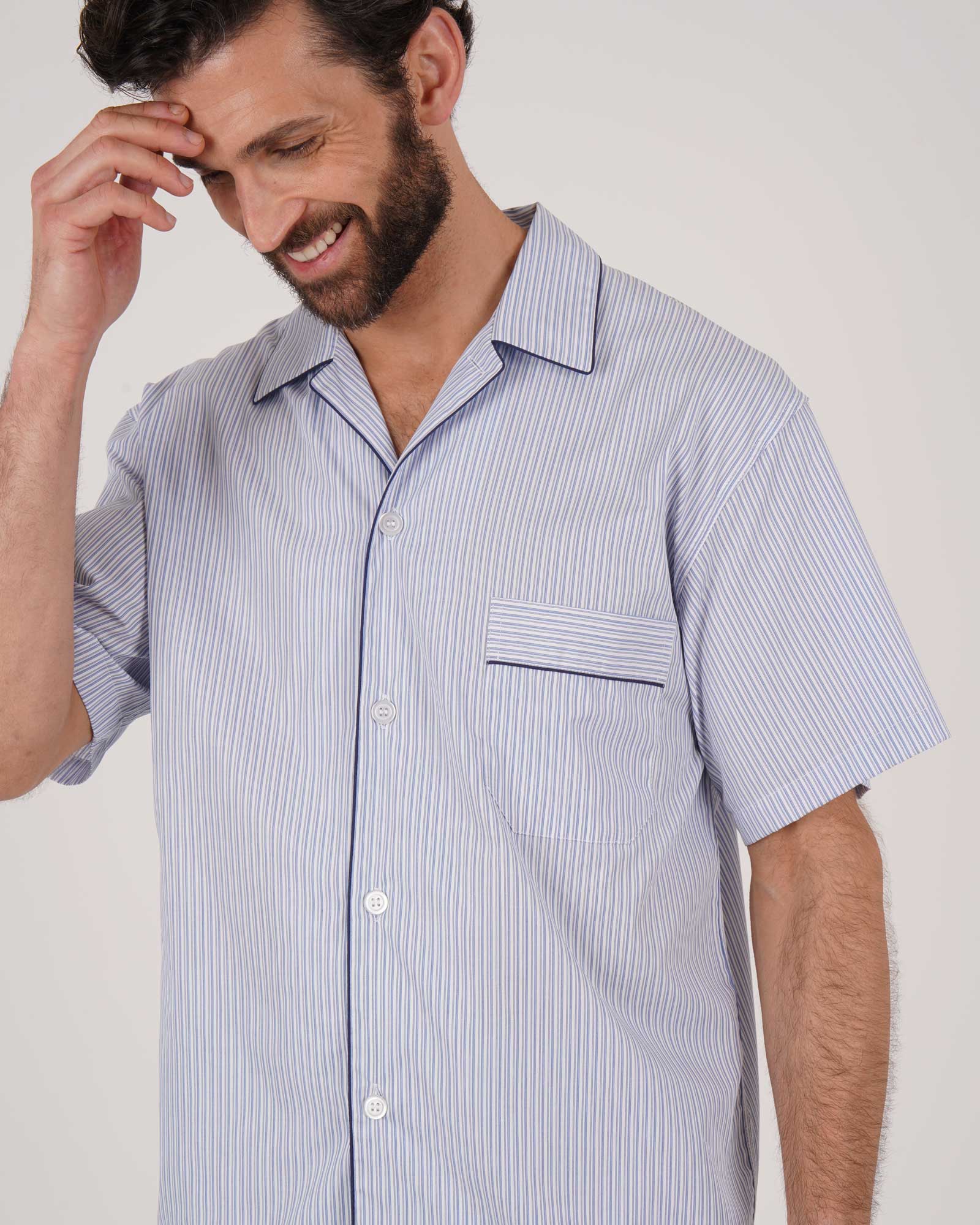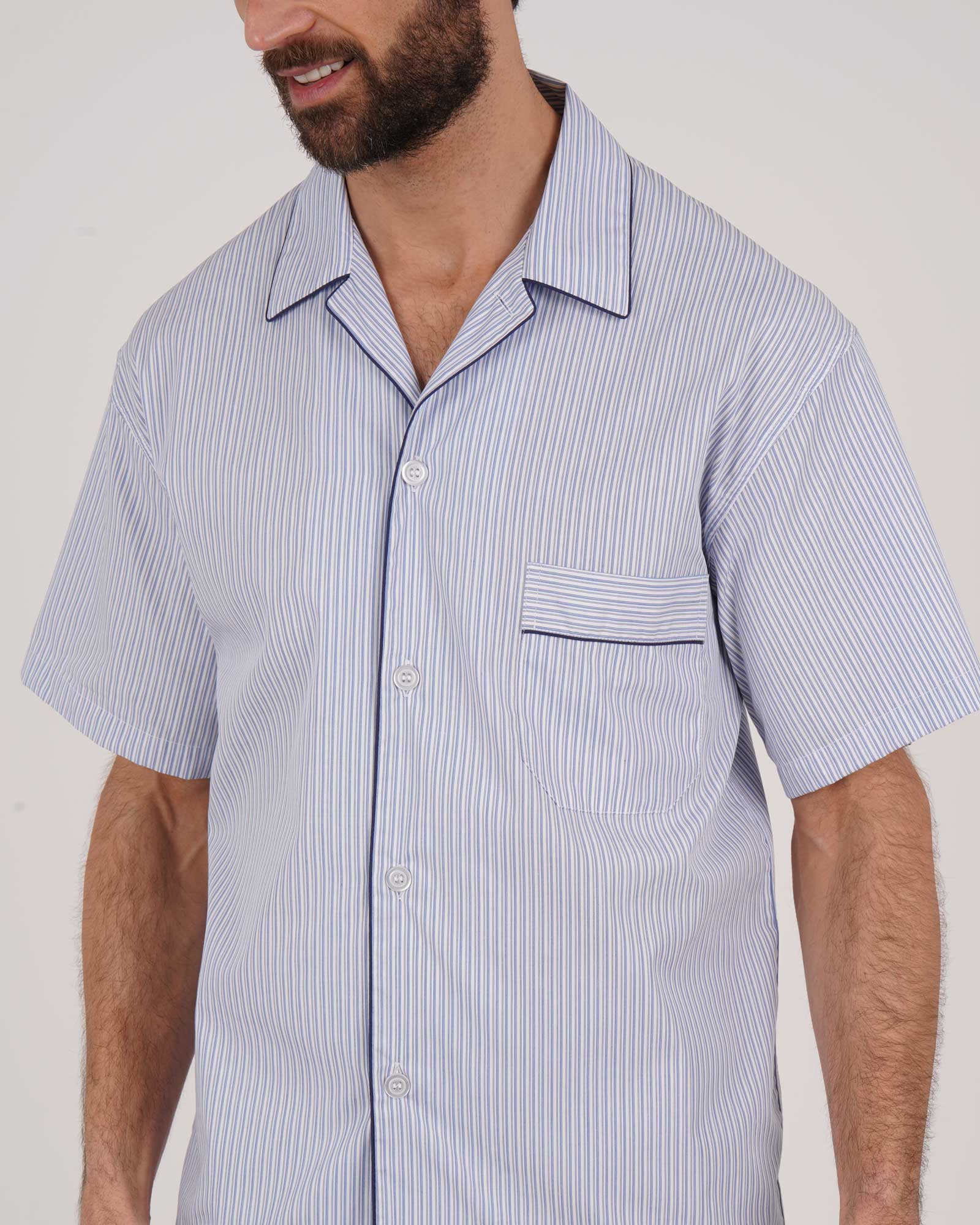 Perfect for sleeping or relaxing in, the shorts are cut to mid-thigh and boast an elasticated waist and closed fly for an easy wearing fit. The shirt features a single breast pocket and short sleeves.