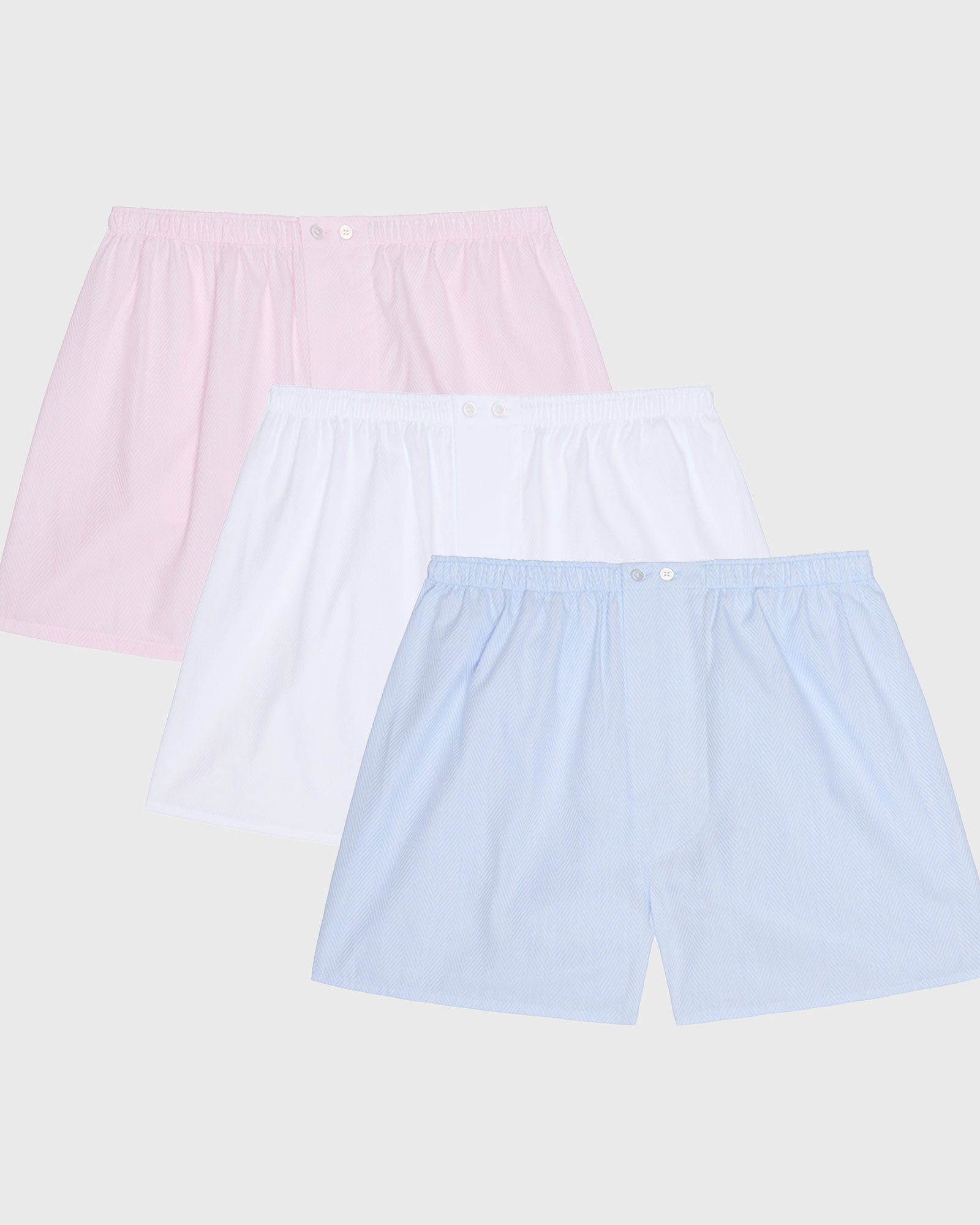 Renew your essentials collection with this bundle of high-quality jacquard cotton boxer shorts. Featuring white, blue, and pink color options, this classic bundle offers a saving of over 15%, making it a versatile and cost-effective choice. Experience the durability and comfort of Bonsoir of London boxer shorts, perfect for everyday wear.