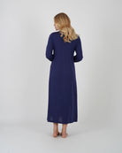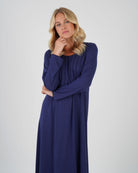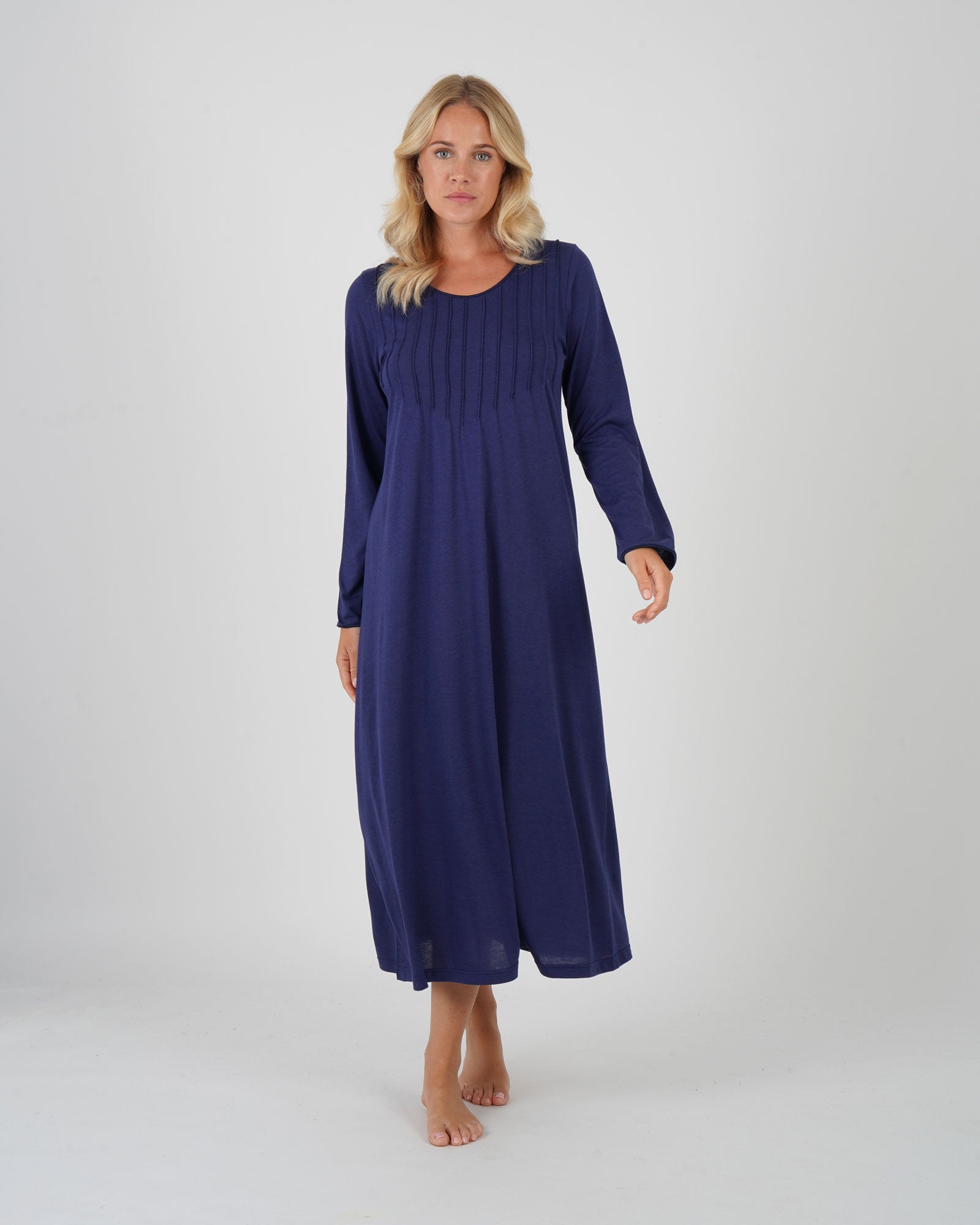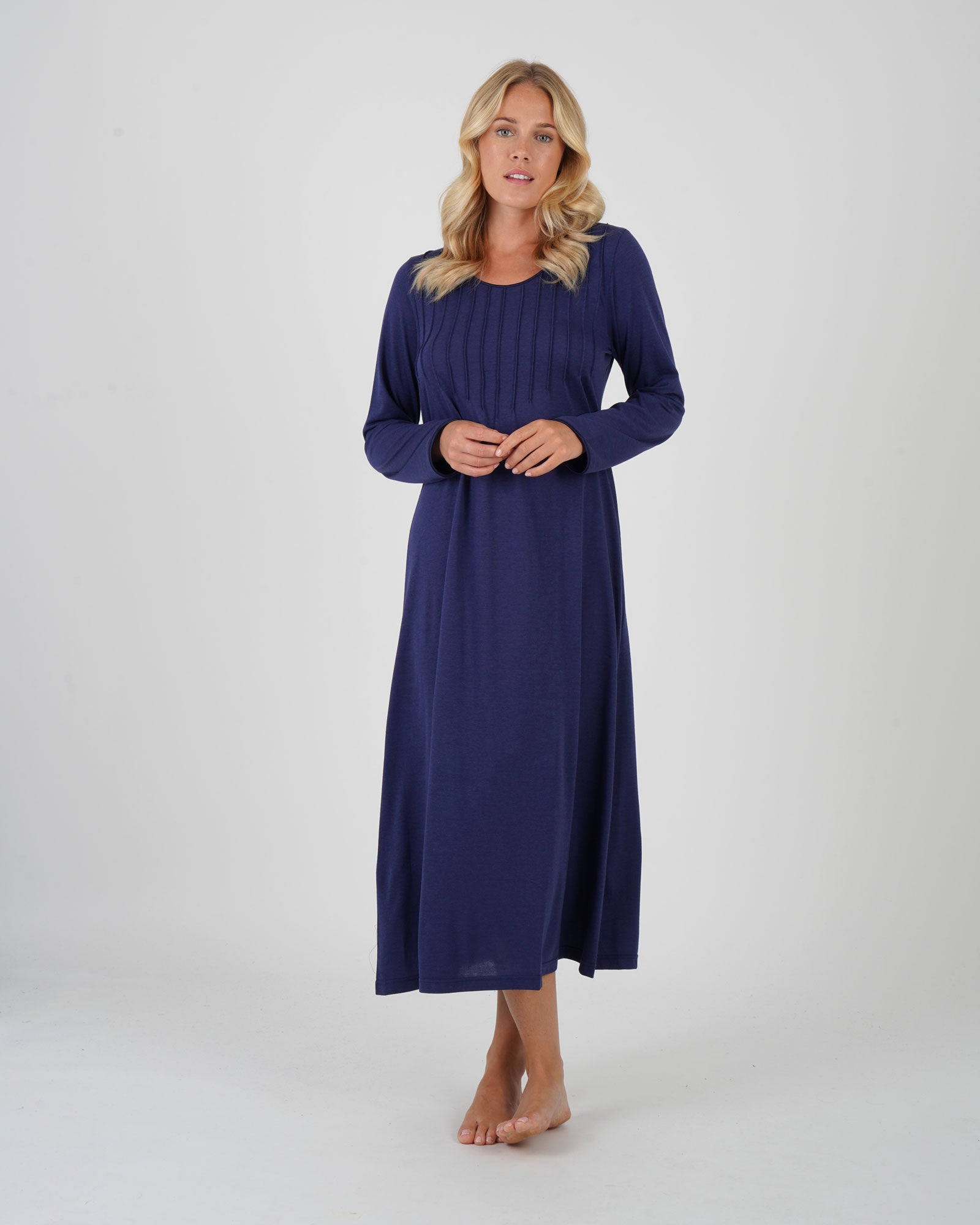 This full sleeve nightdress, with its loose-fit cut drapes beautifully across the figure. Styled with smooth satin trims and delicate pin tuck detail in an elegant shade of midnight blue. Made from cotton and modal jersey - a sustainably sourced fabric, with a natural drape and super-soft finish.