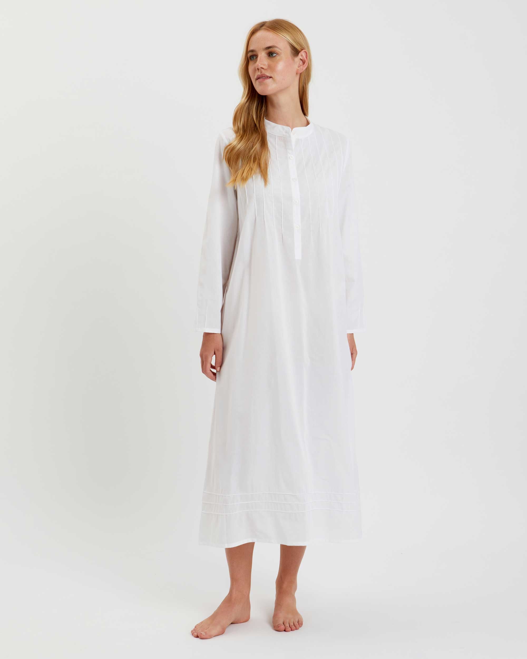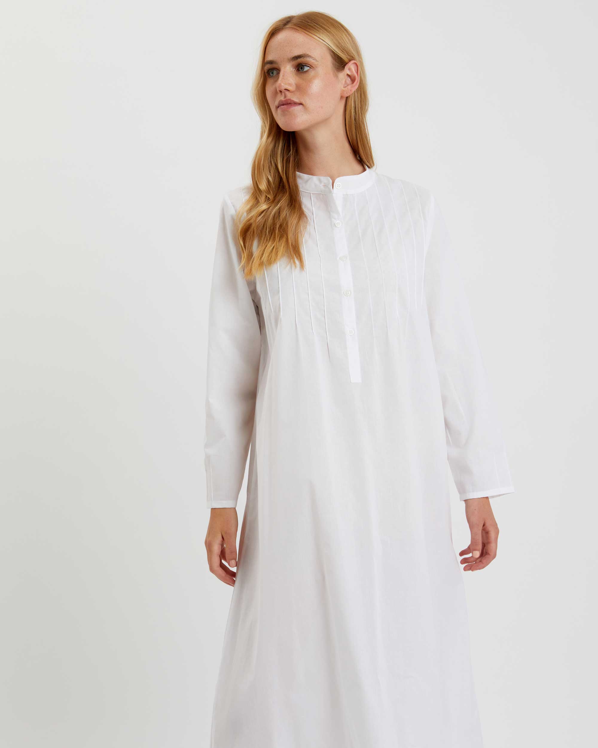 Generously cut from a fine cotton lawn with a relaxed silhouette, it features delicate front pleating, a high collar and button fastening. Our Victoria Nightdress is also available with short sleeves.