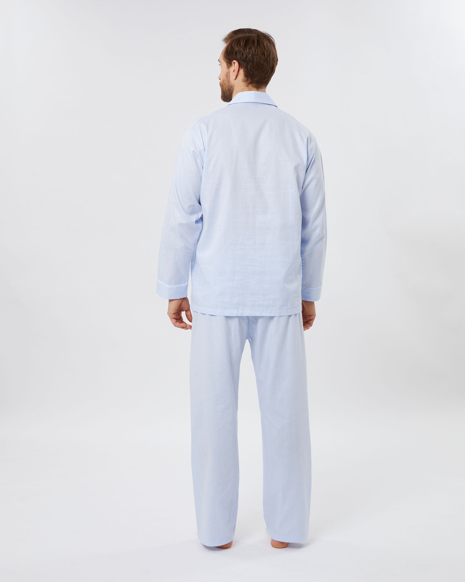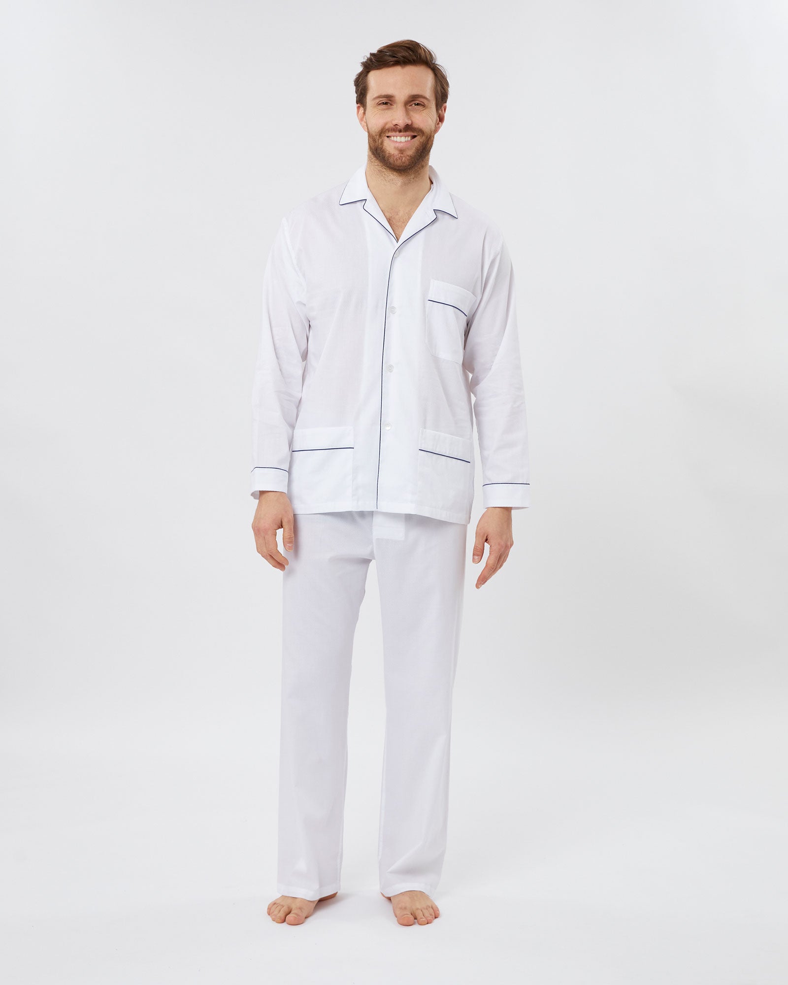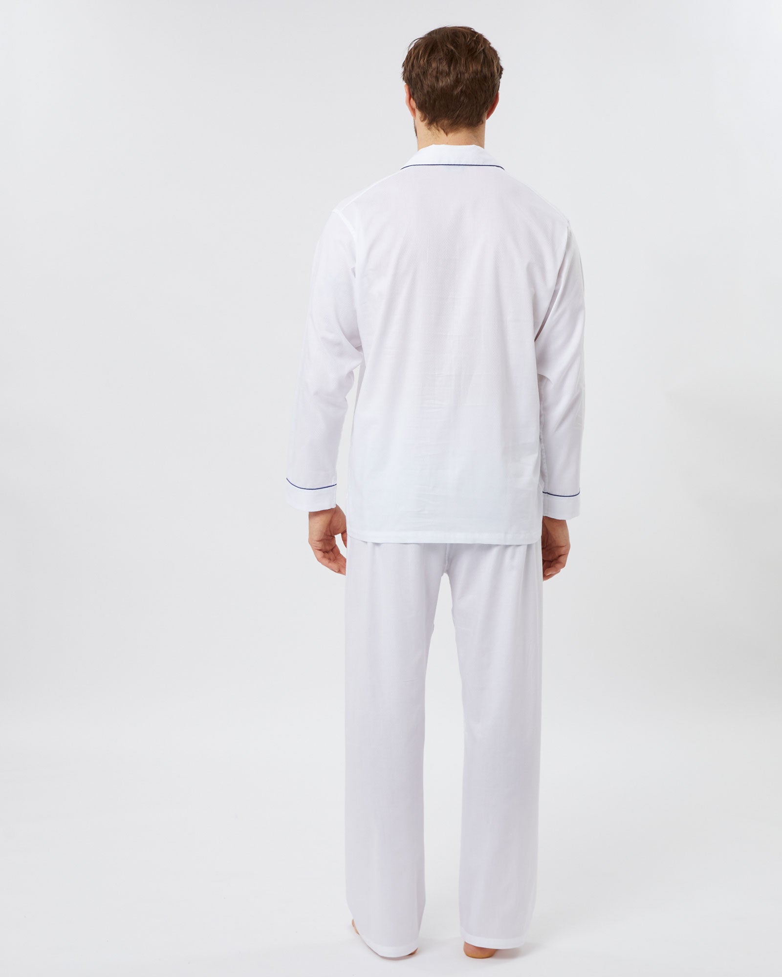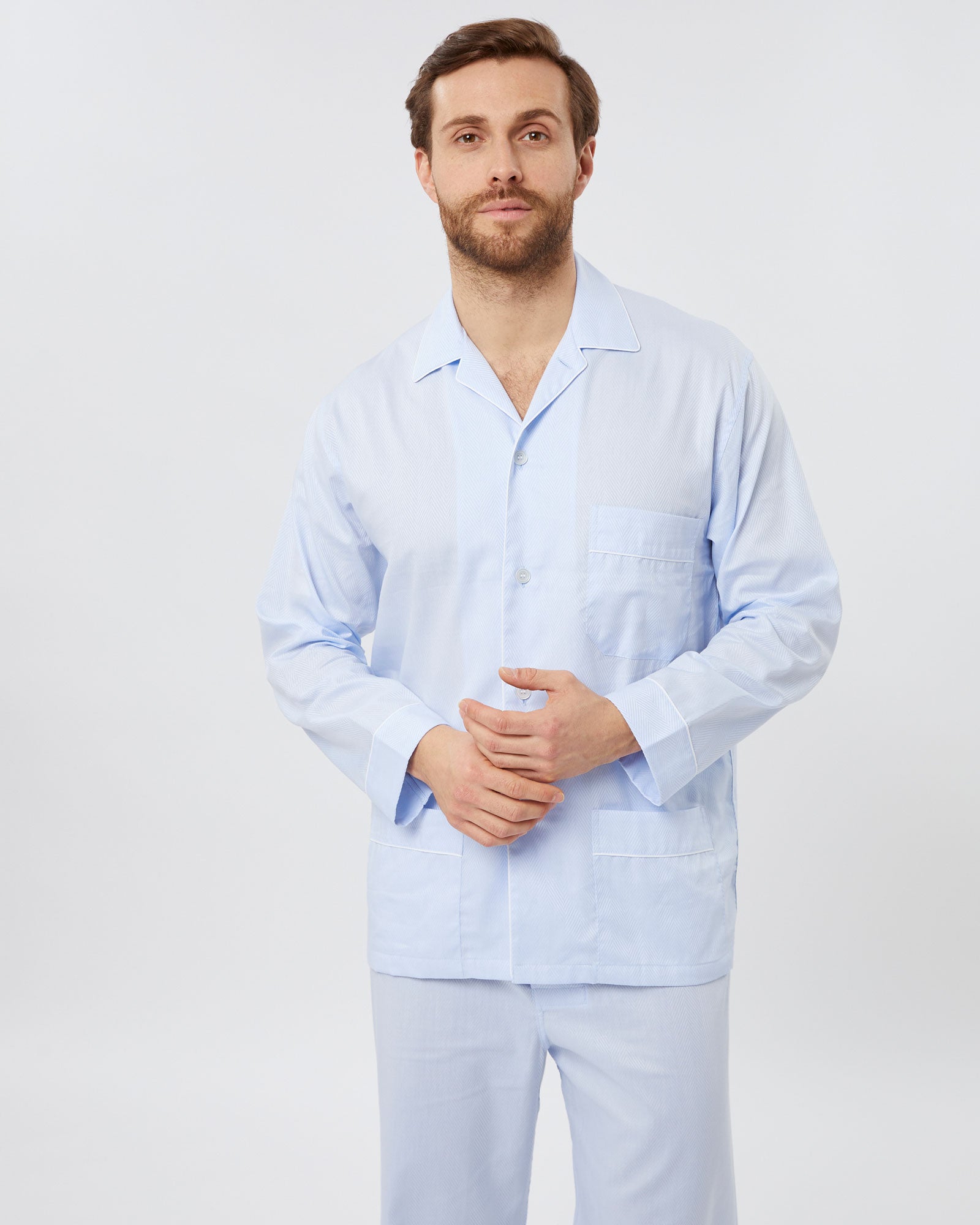 These pyjamas in a smooth cotton offer a slight sheen and delicate all over pattern from being woven from two tones of cotton yarn. Finished with contrasting piping on the jacket and an elasticated waist on the trouser.