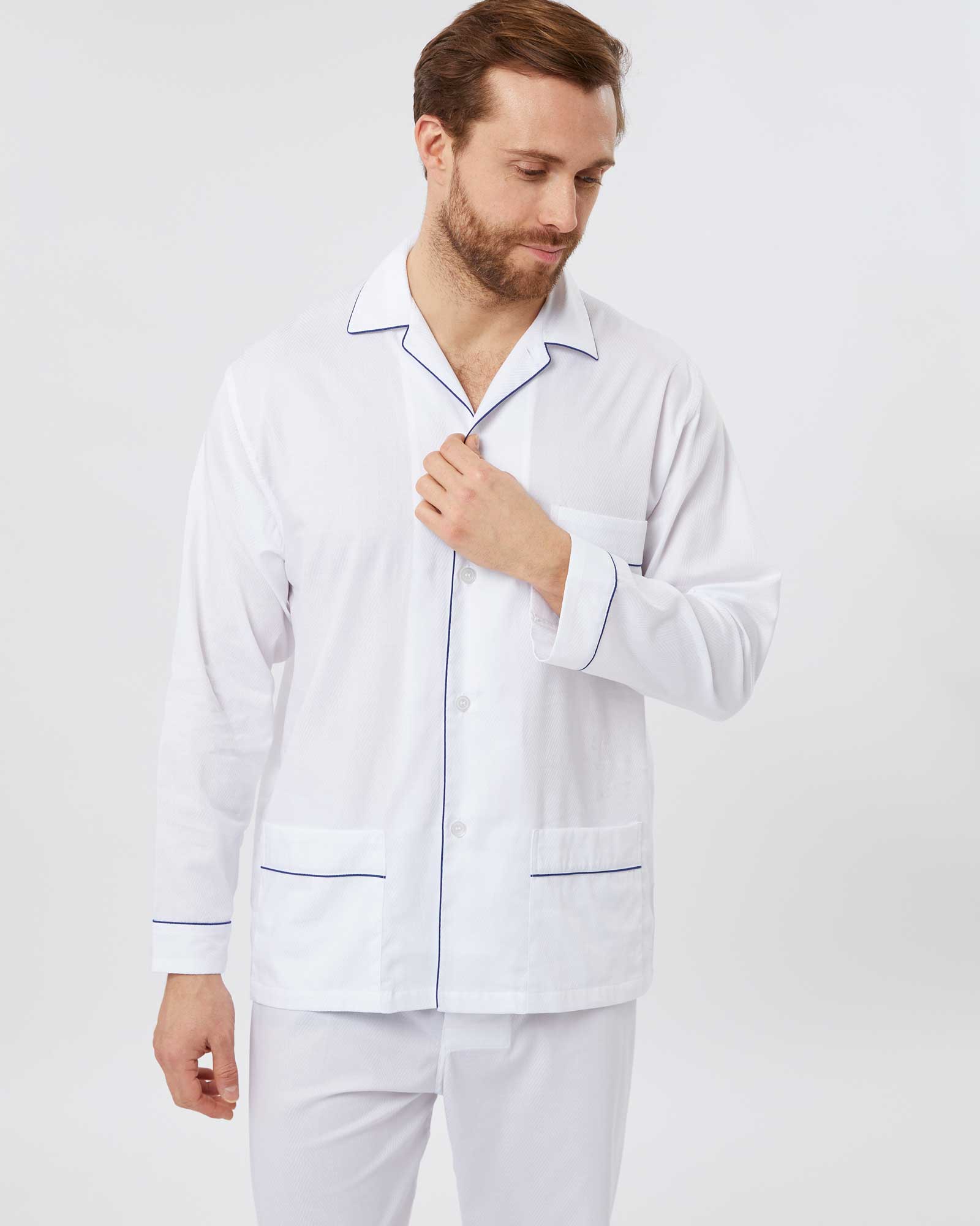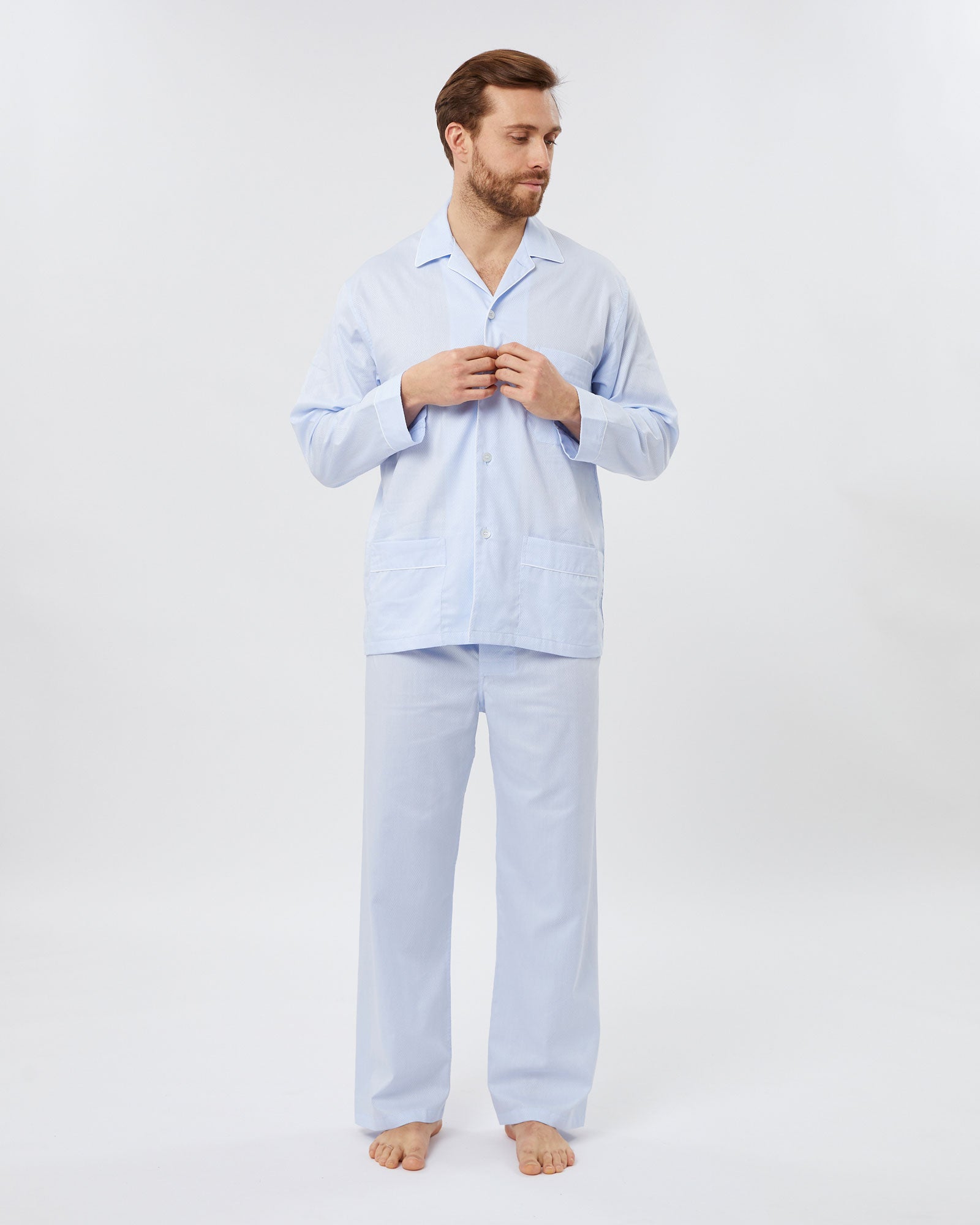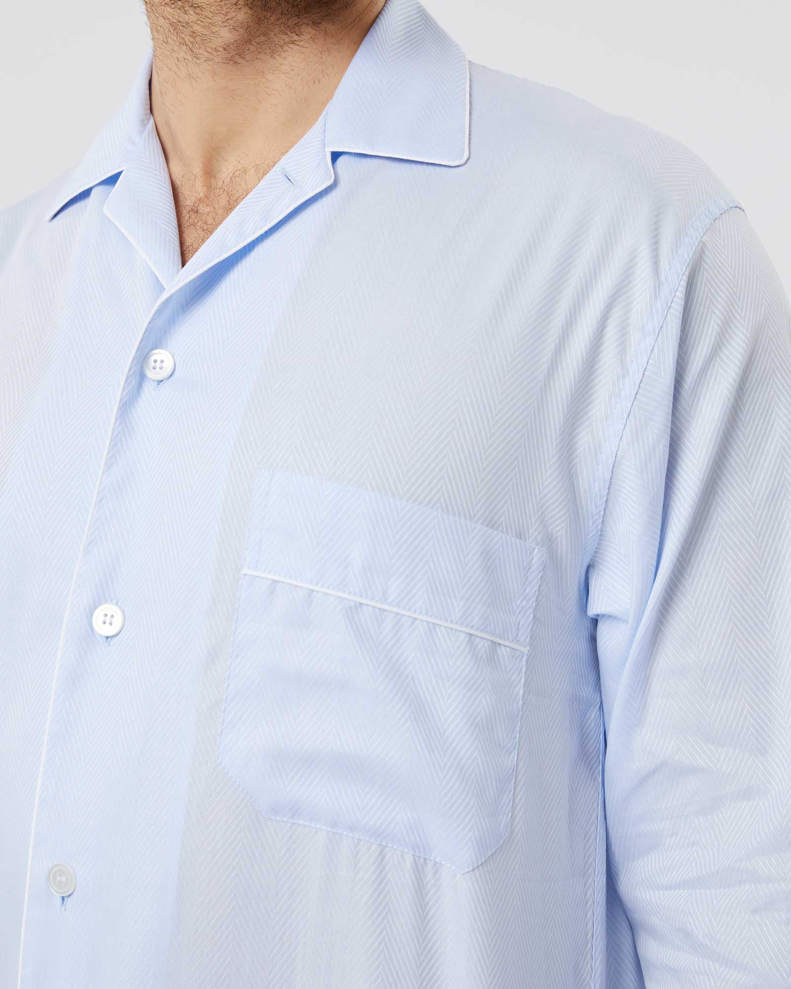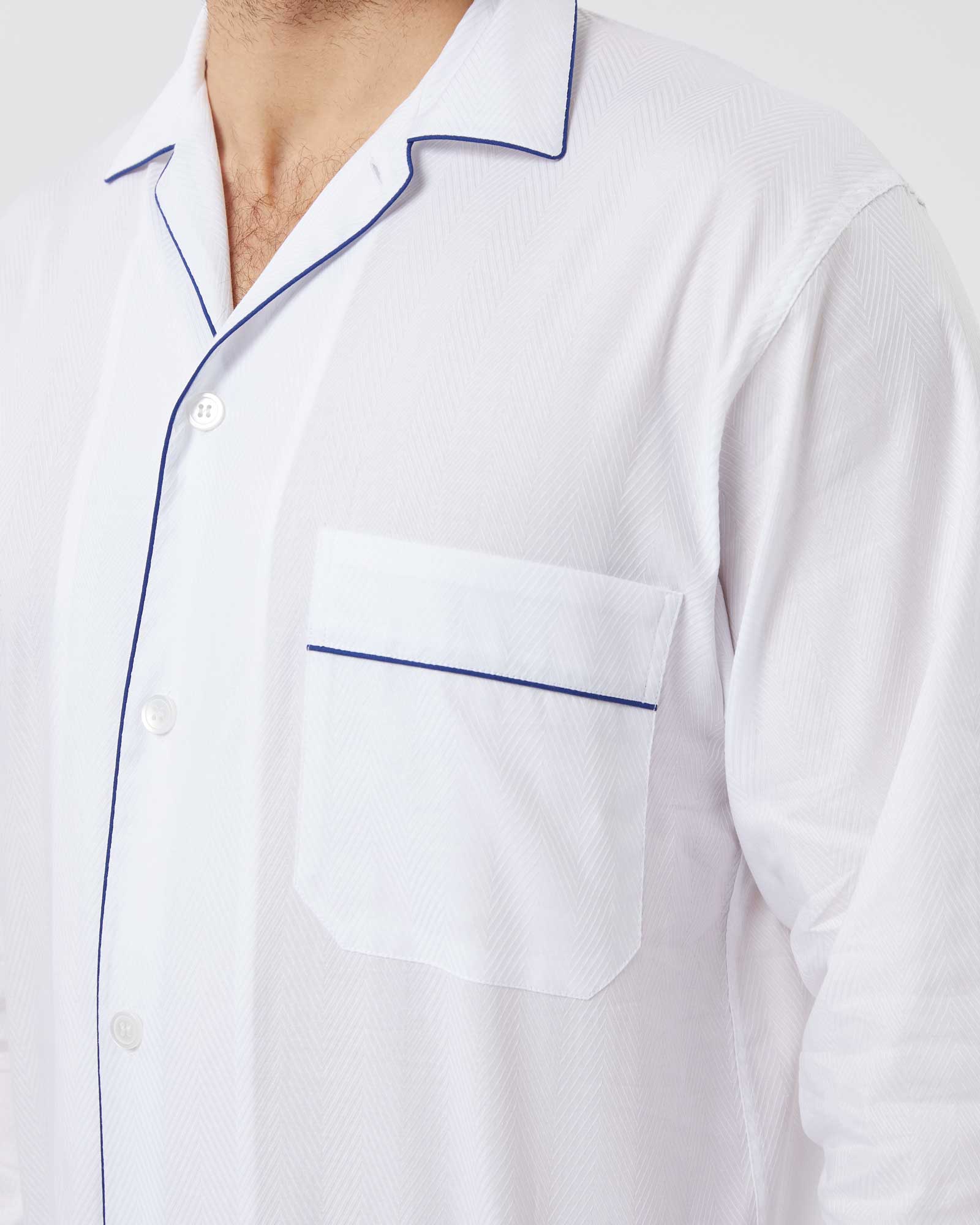 These pyjamas in a smooth cotton offer a slight sheen and delicate all over pattern from being woven from two tones of cotton yarn. Finished with contrasting piping on the jacket and an elasticated waist on the trouser.