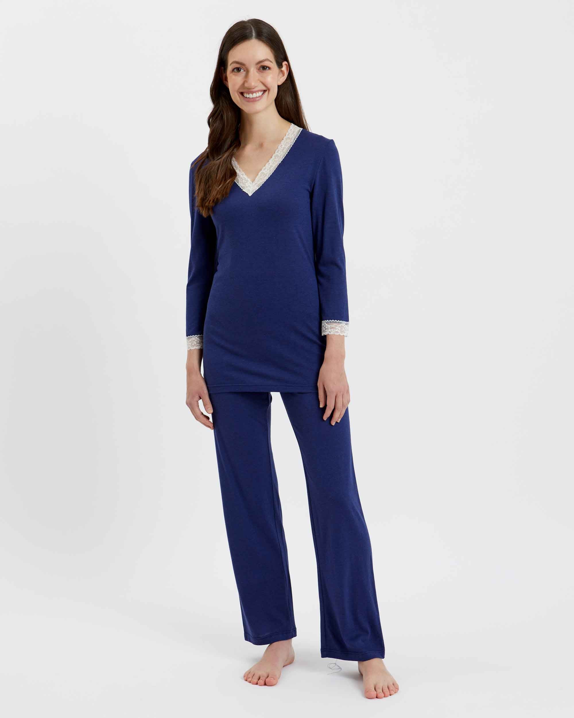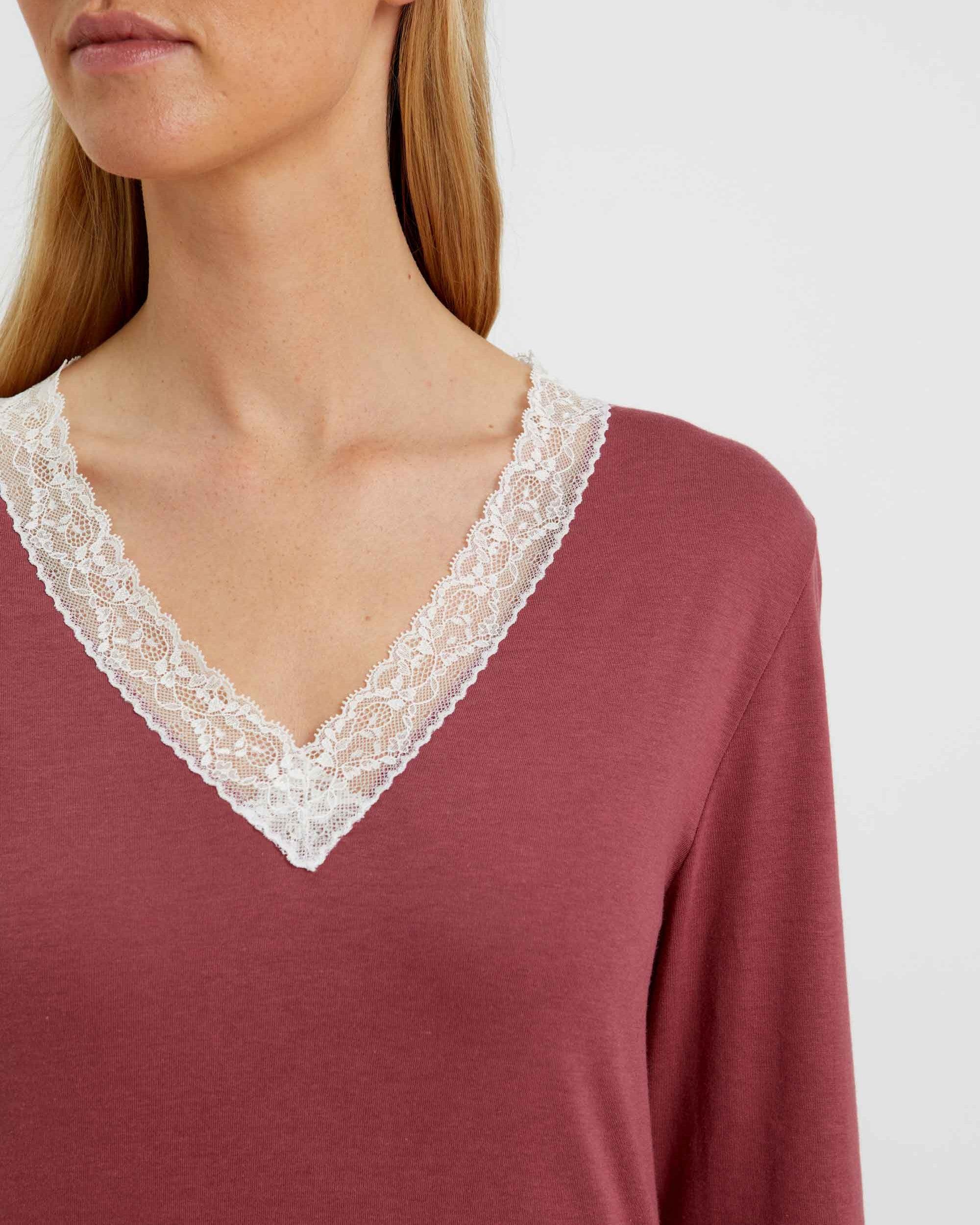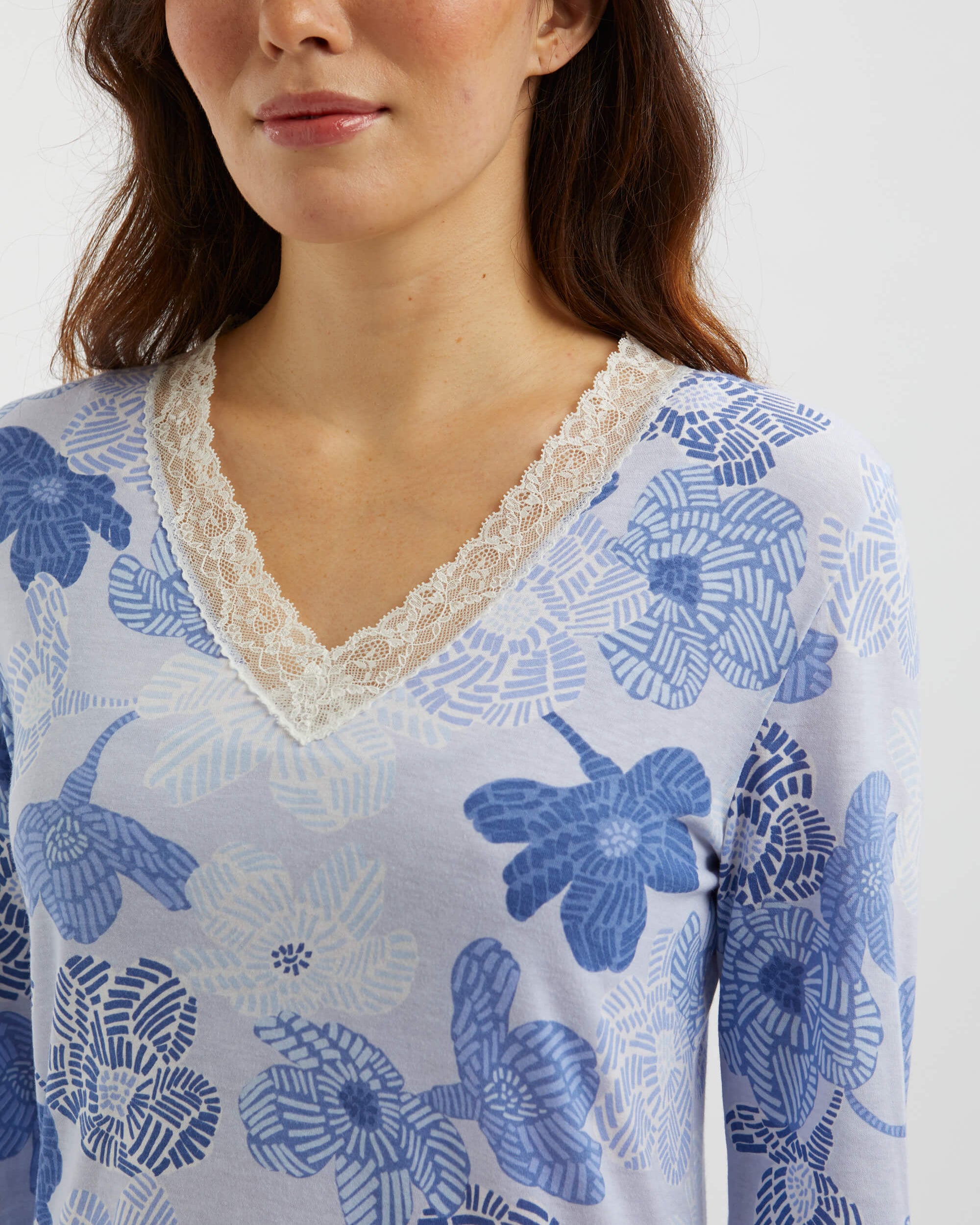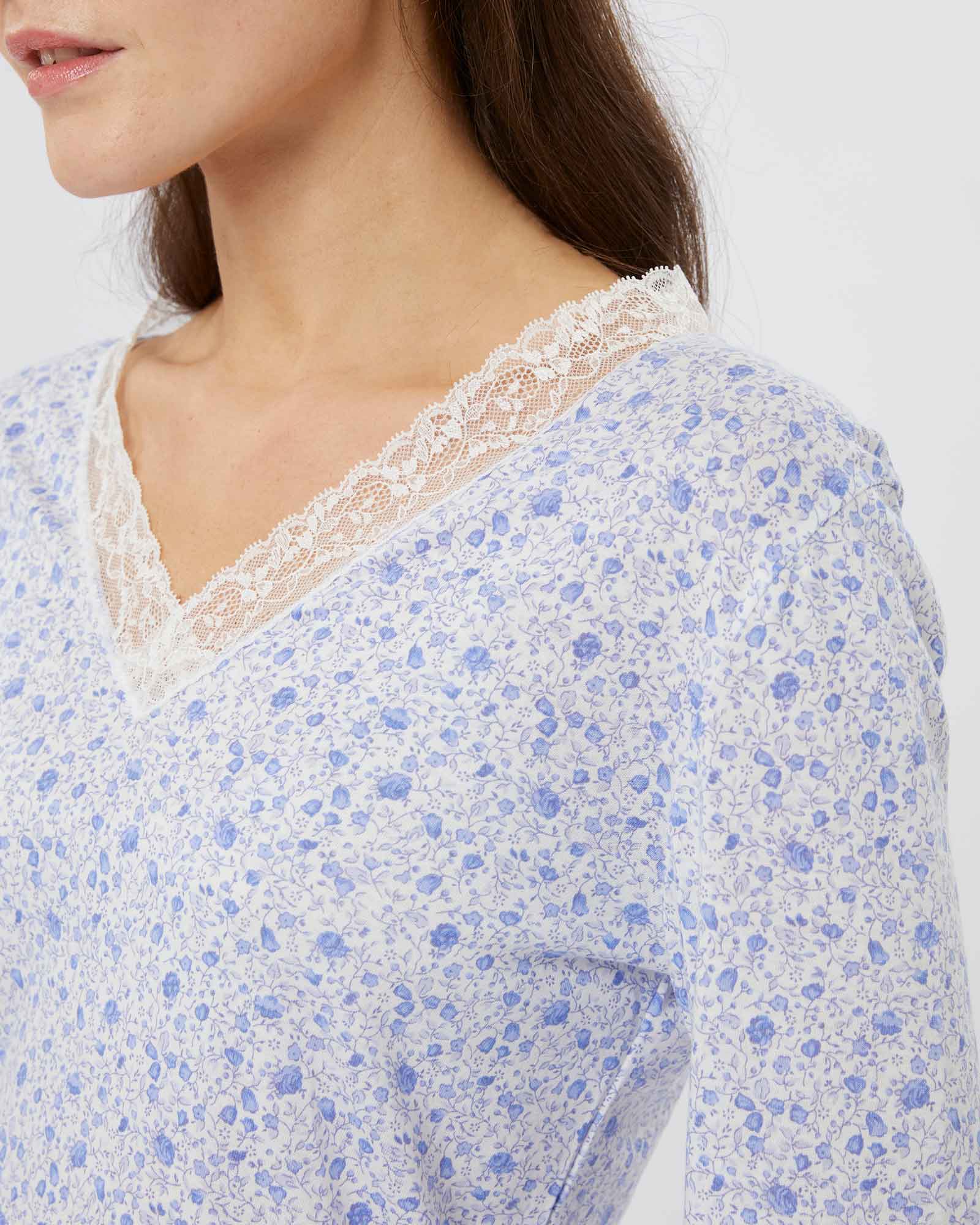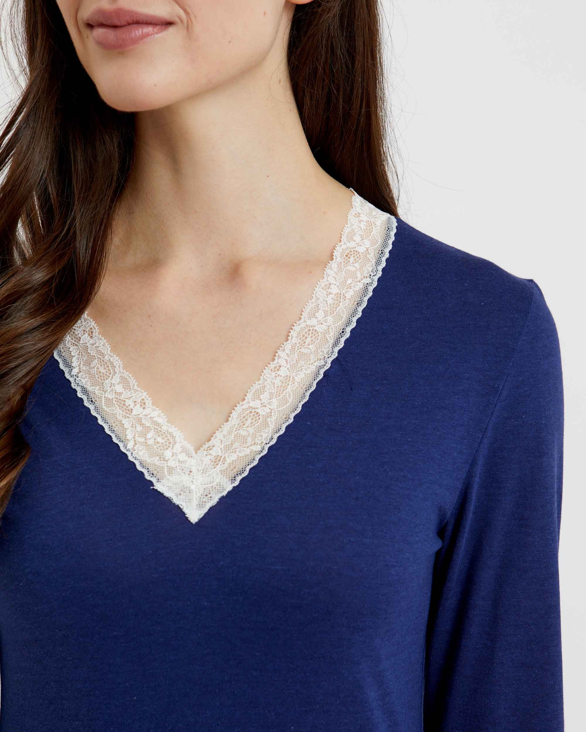 Featuring ivory lace detailing at the neckline and cuffs, this sumptuously soft and breathable jersey is a mix of 50% cotton and 50% modal, a textile sustainably sourced from the fibres of Beech trees. Technologies behind the fibre allow it to adapt to temperatures throughout the seasons, keeping you warm when it's cool and cool when it's warm.
