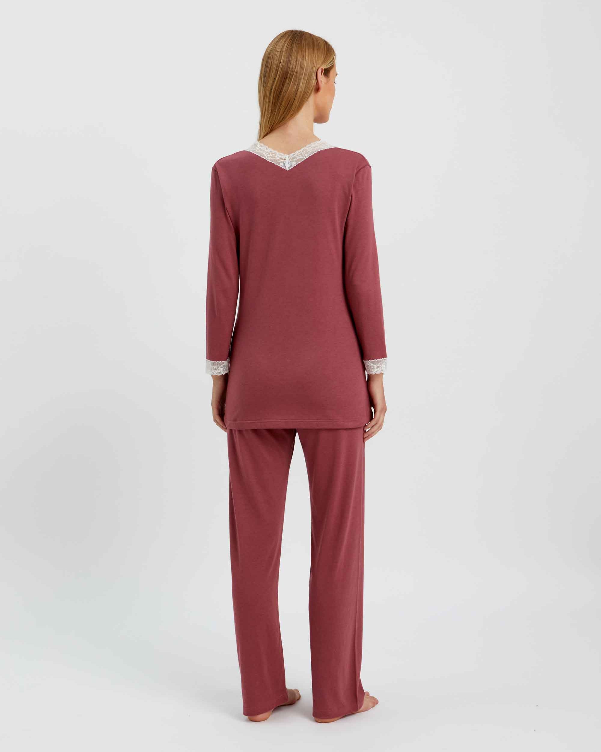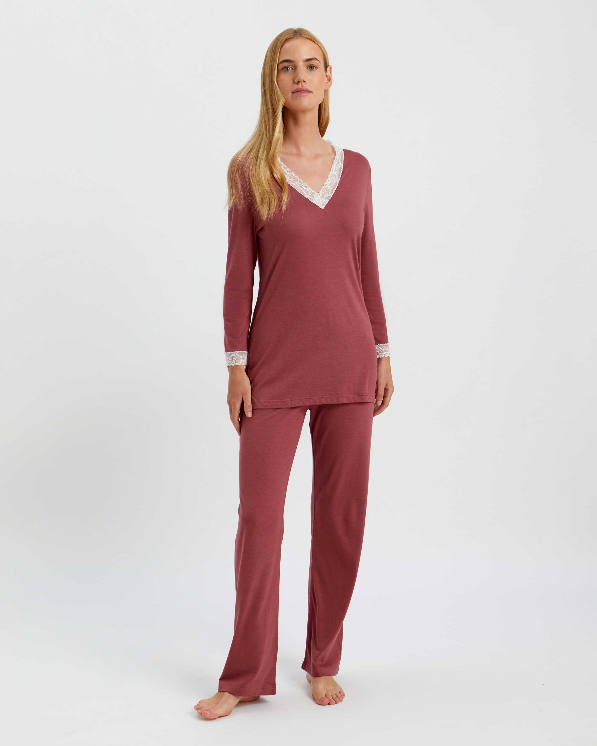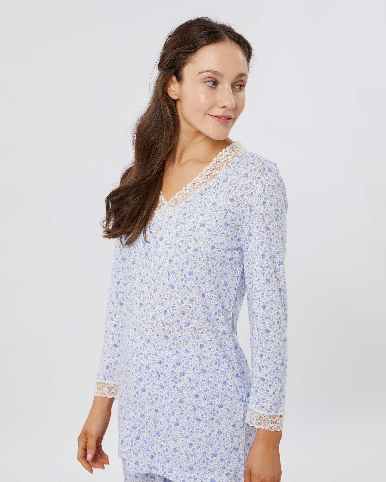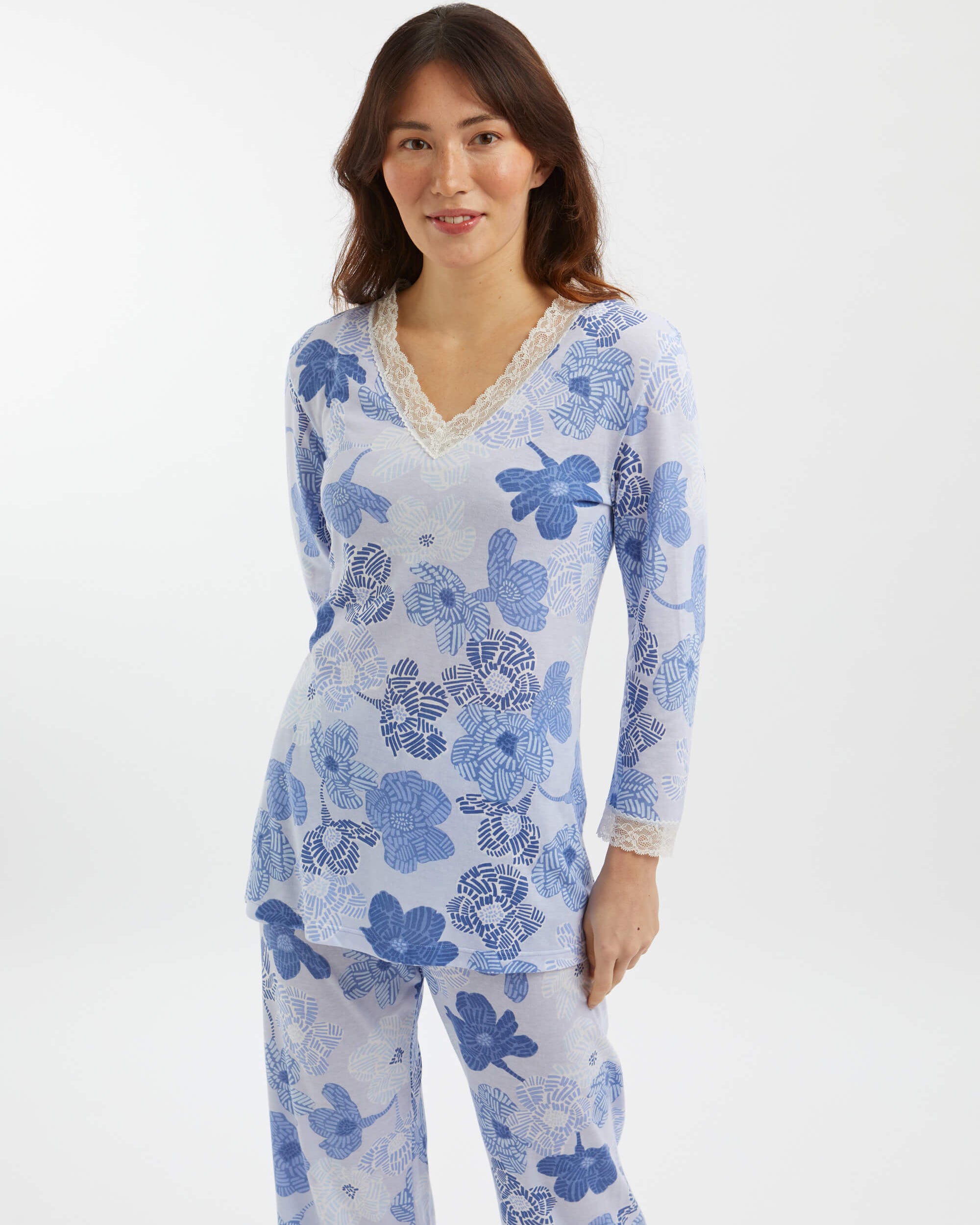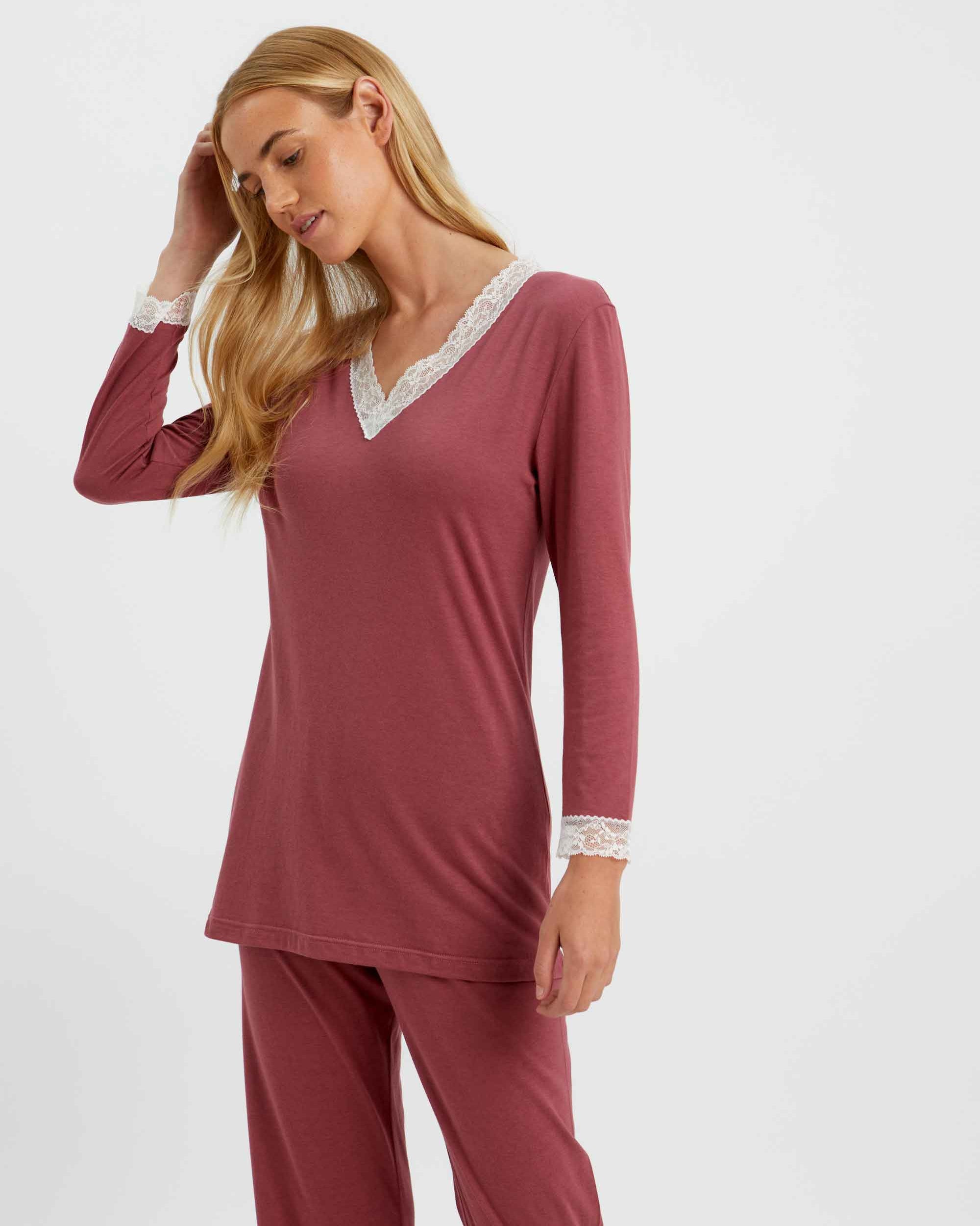 Featuring ivory lace detailing at the neckline and cuffs, this sumptuously soft and breathable jersey is a mix of 50% cotton and 50% modal, a textile sustainably sourced from the fibres of Beech trees. Technologies behind the fibre allow it to adapt to temperatures throughout the seasons, keeping you warm when it's cool and cool when it's warm.