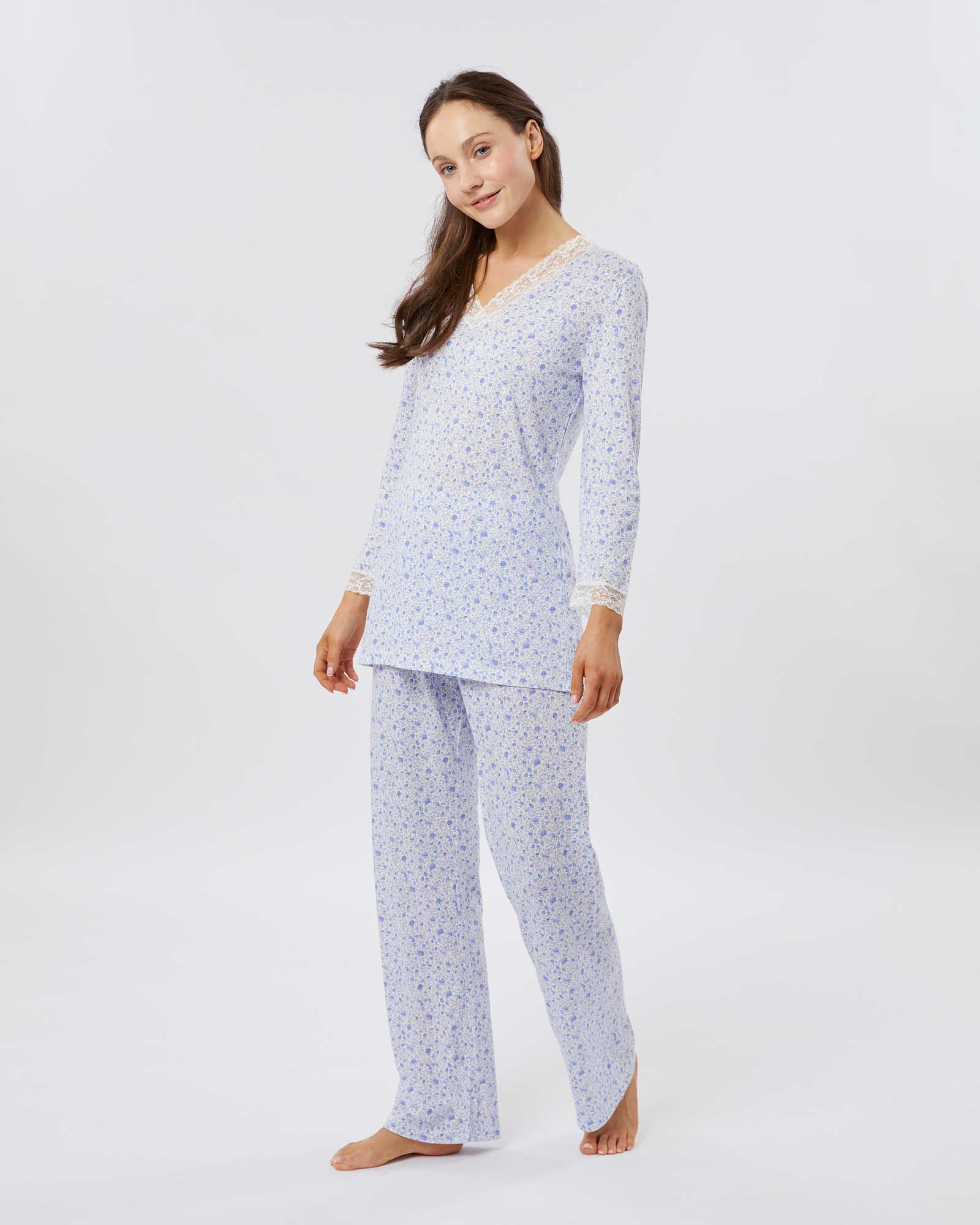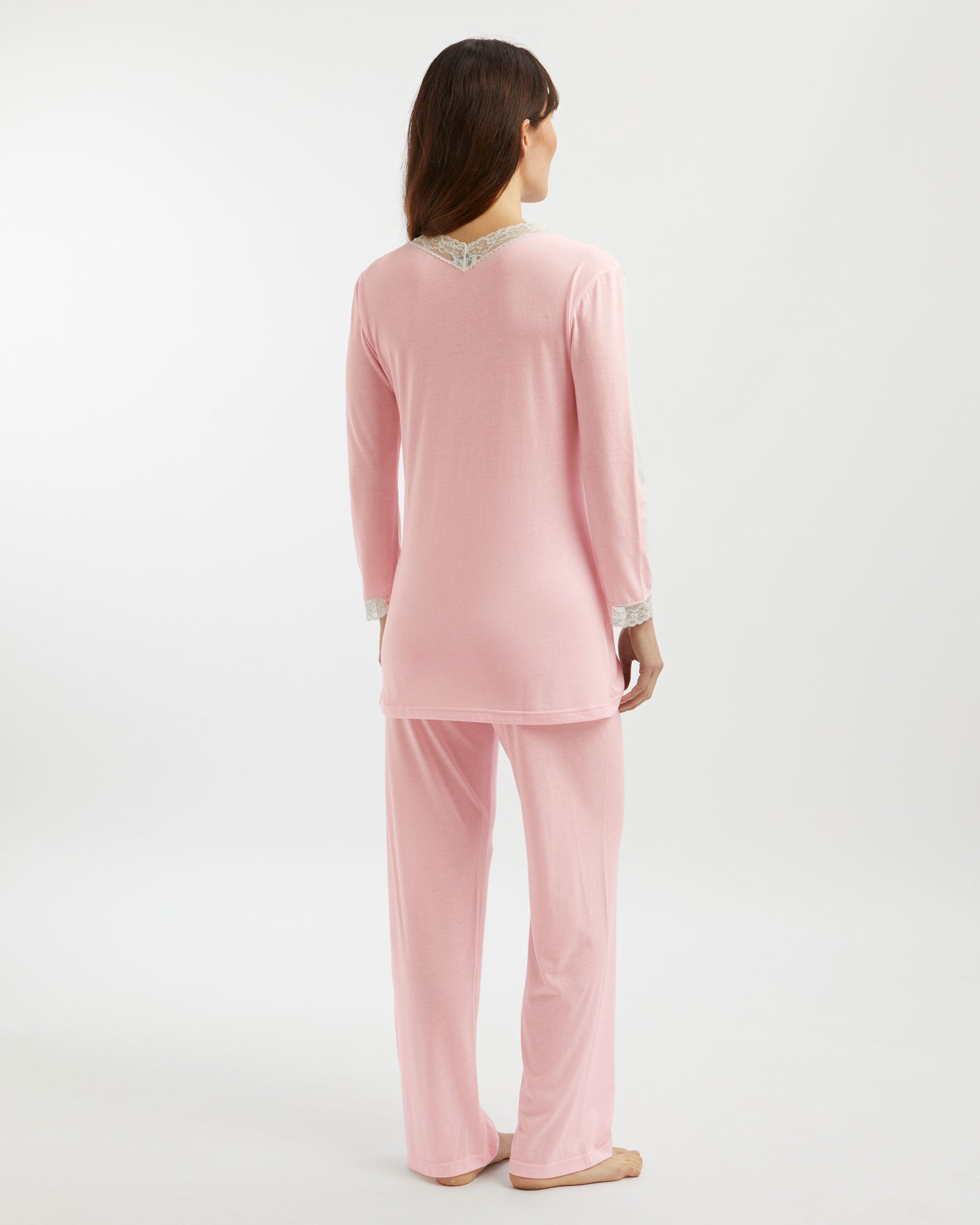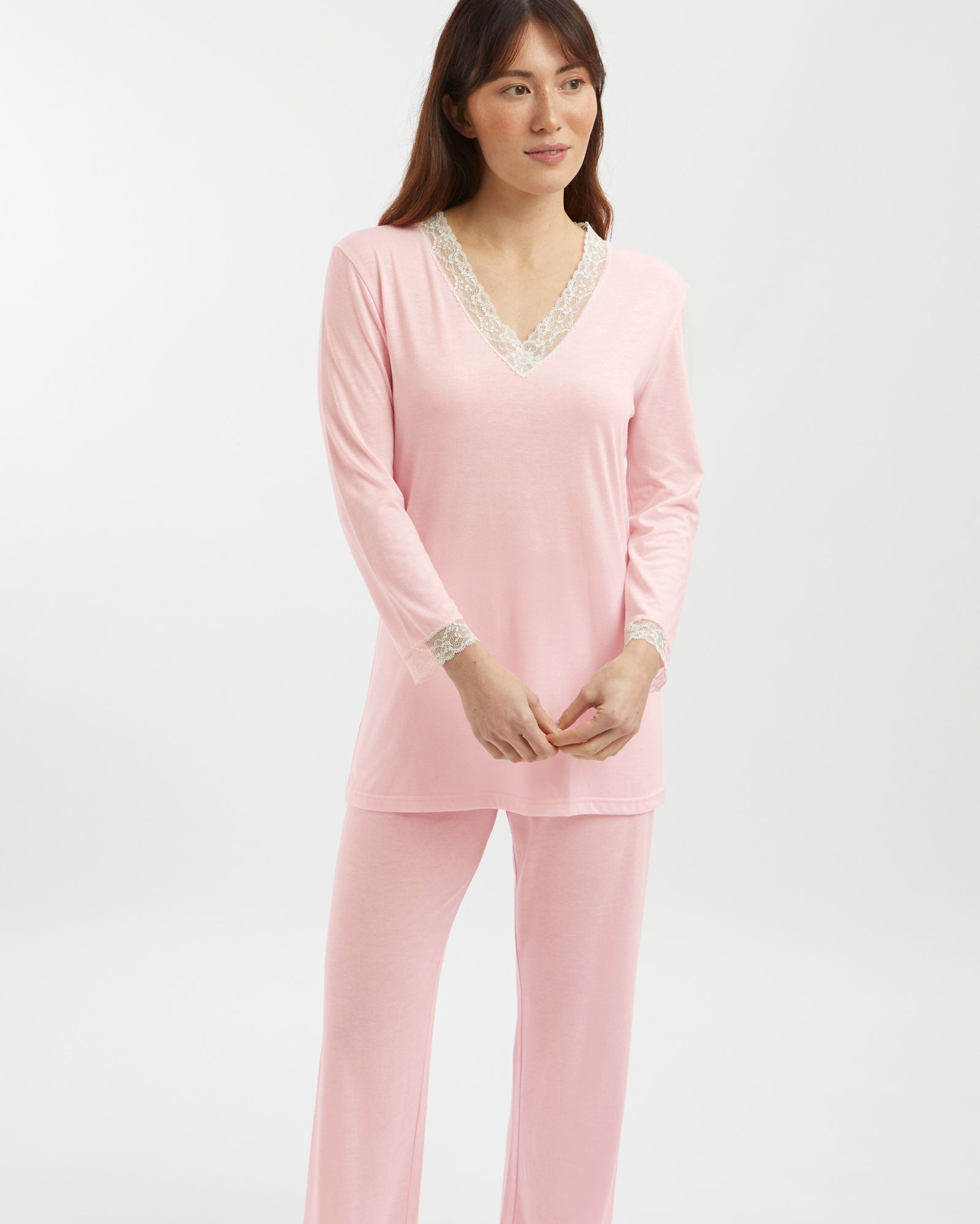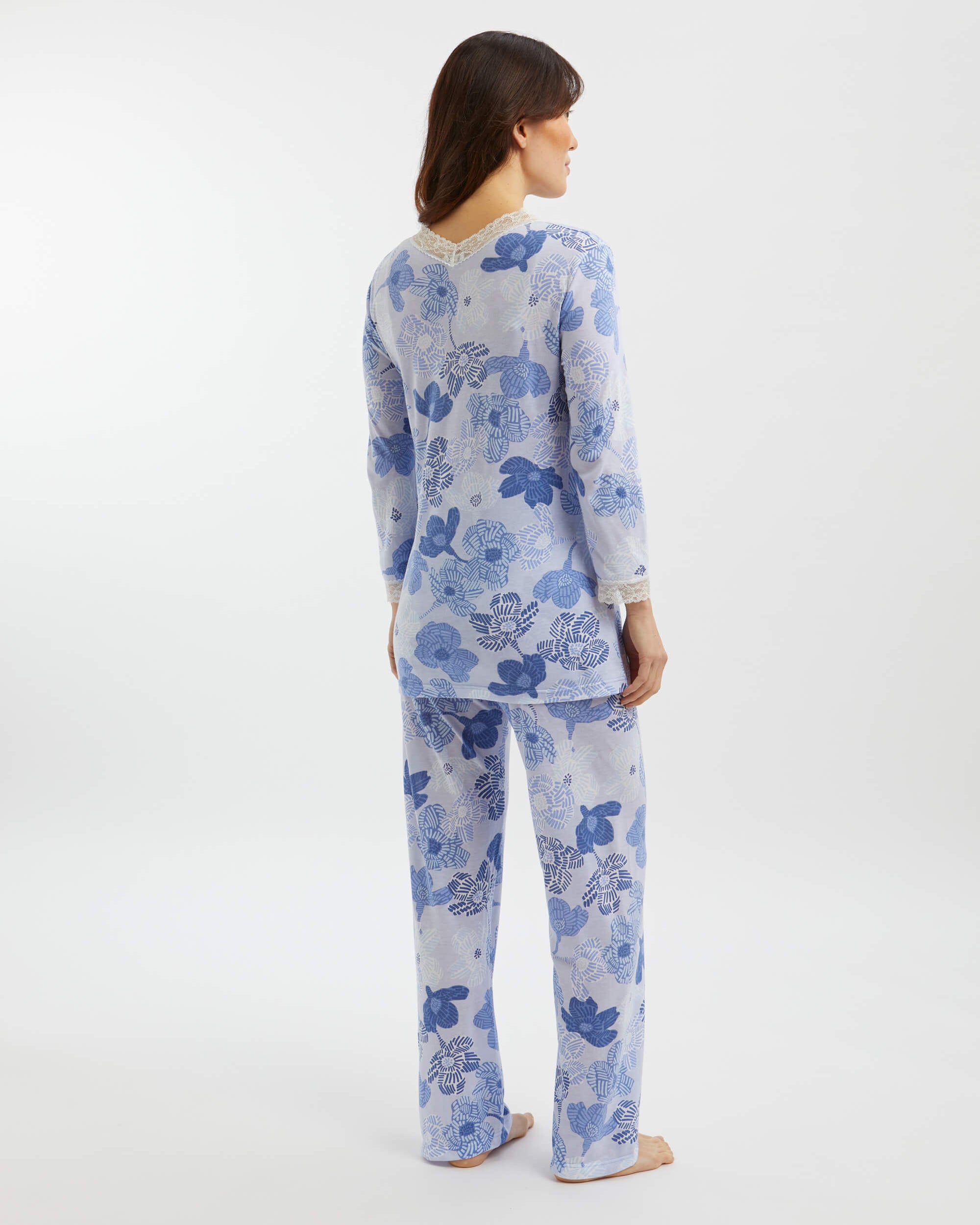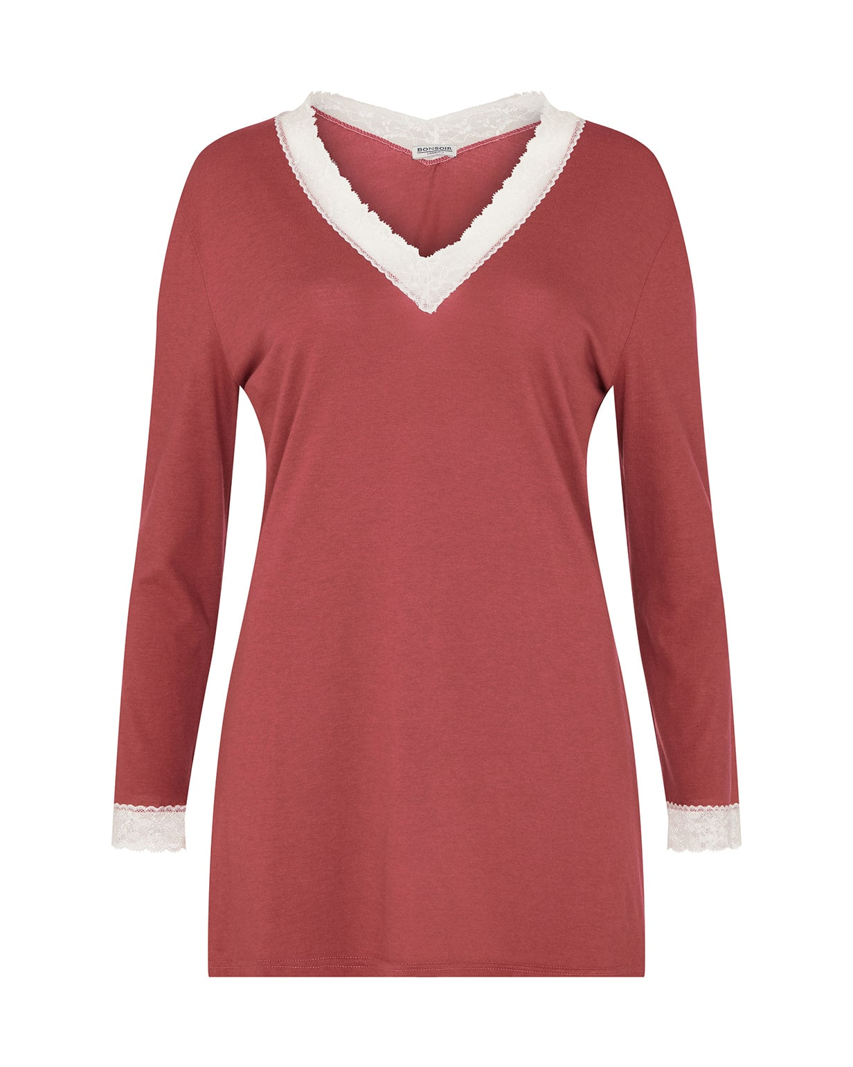 Featuring ivory lace detailing at the neckline and cuffs, this sumptuously soft and breathable jersey is a mix of 50% cotton and 50% modal, a textile sustainably sourced from the fibres of Beech trees. Technologies behind the fibre allow it to adapt to temperatures throughout the seasons, keeping you warm when it's cool and cool when it's warm.