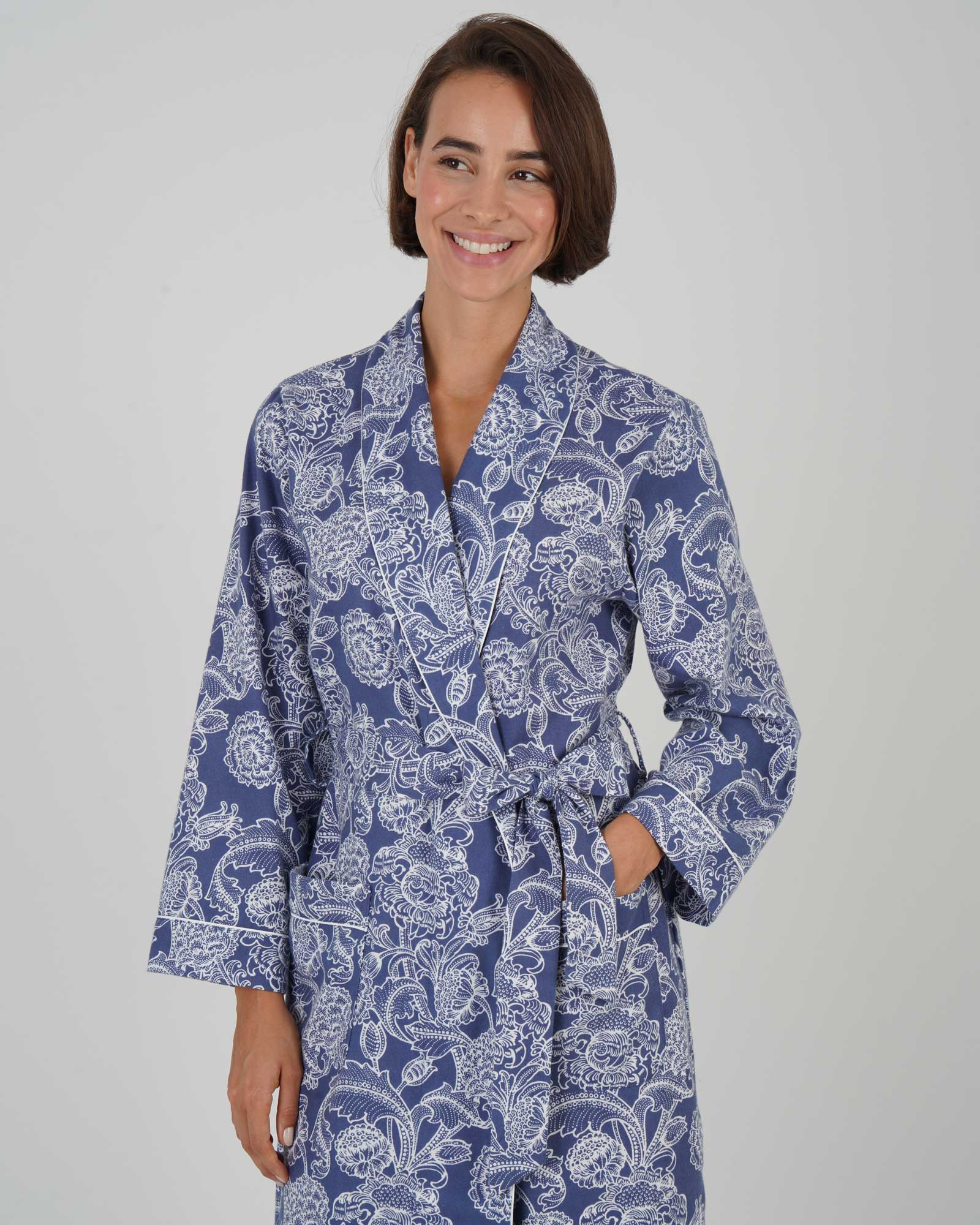 Women's Brushed Cotton Dressing Gown - Paisley Flower Blue