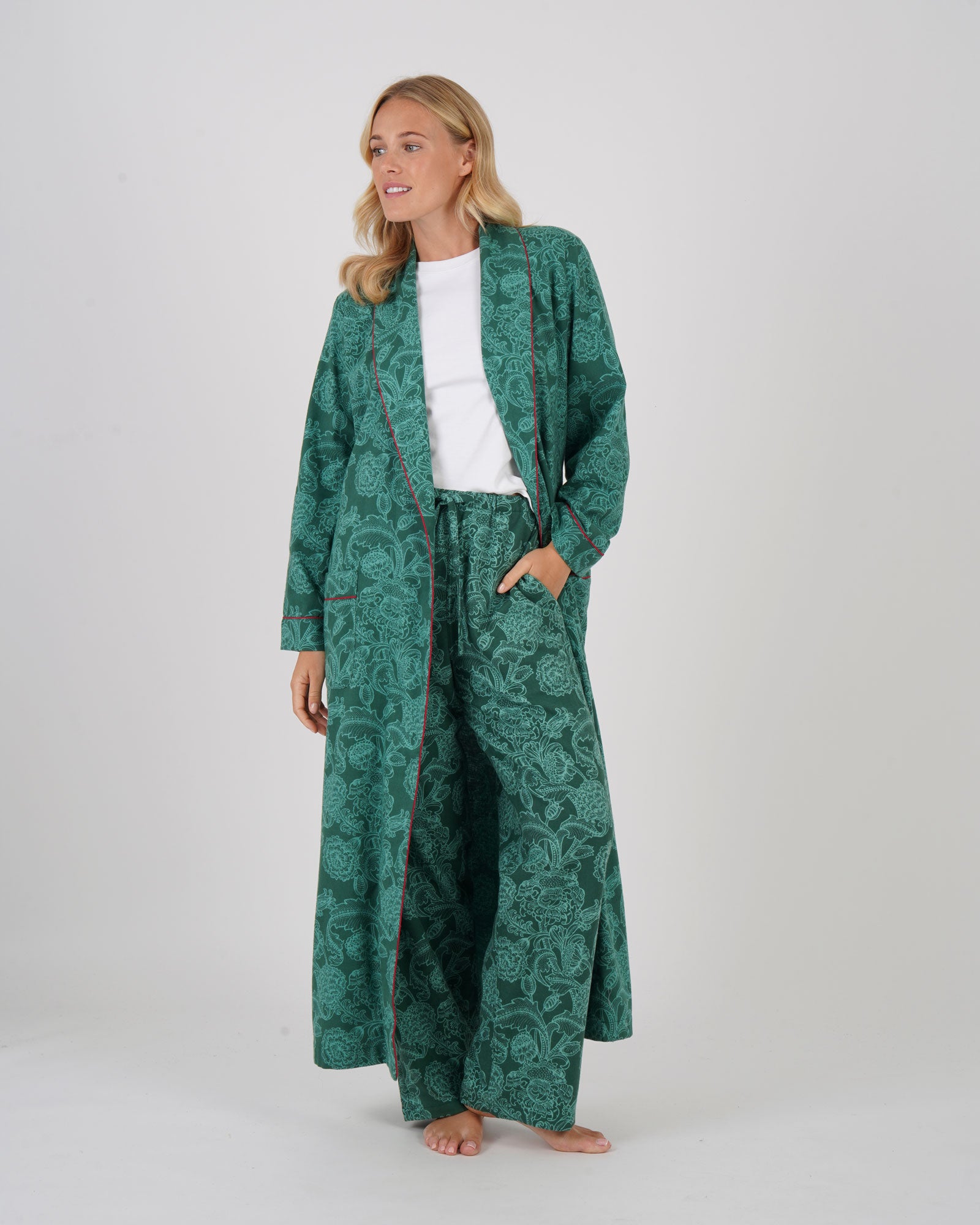 Warm without being heavy, our brushed cotton dressing gown in Paisley Flower Green is perfect for the changing seasons. 100% cotton fabric is gently brushed to create a super soft hand feel.
