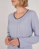 This full-sleeve nightdress, with its loose-fit cut drapes beautifully across the figure. Styled with smooth satin trims and delicate pin tuck detail in an elegant shade of midnight blue. Made from cotton and modal jersey - a sustainably sourced fabric, with a natural drape and super-soft finish.