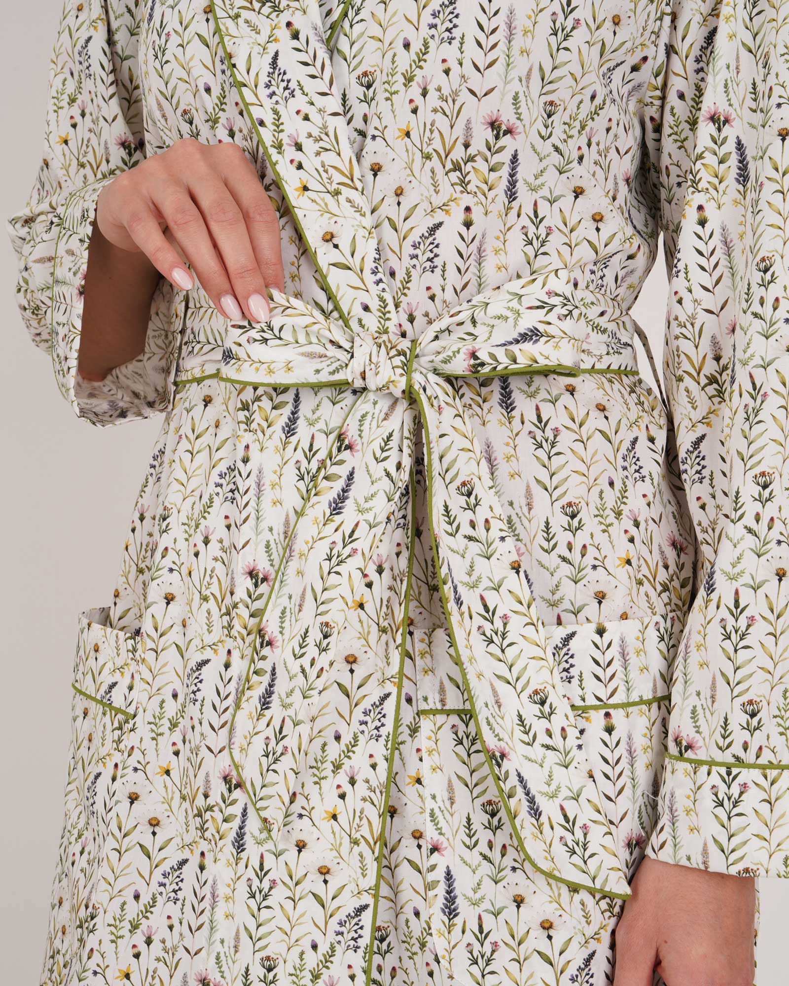 Our Classic Cotton Dressing Gown is even better this season in our new beautiful Banwell Floral print. Our luxury nightwear is designed to take you through the season in style and comfort, this 100% cotton dressing gown features a deep shawl collar, two inset pockets, inside ties, tie belt and complementary piping.