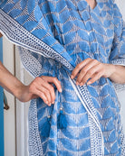 Introducing the Cap Estel Kaftan from Zen Ethic - your summer travel essential for effortless style. Designed in Paris from 100% organic cotton, this luxurious piece is crafted with the same premium materials as your beloved Bonsoir nightwear. Featuring a relaxed silhouette with a cinched tie waist finished with a blue tassel, the kaftan is adorned with a striking blue geometric print, bringing a modern, elegant touch to your relaxation wardrobe or next getaway.