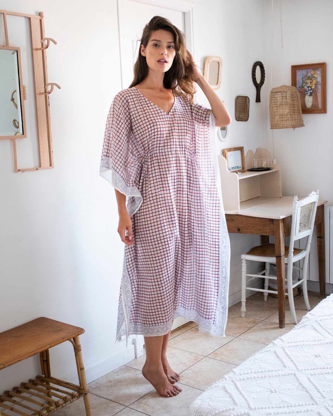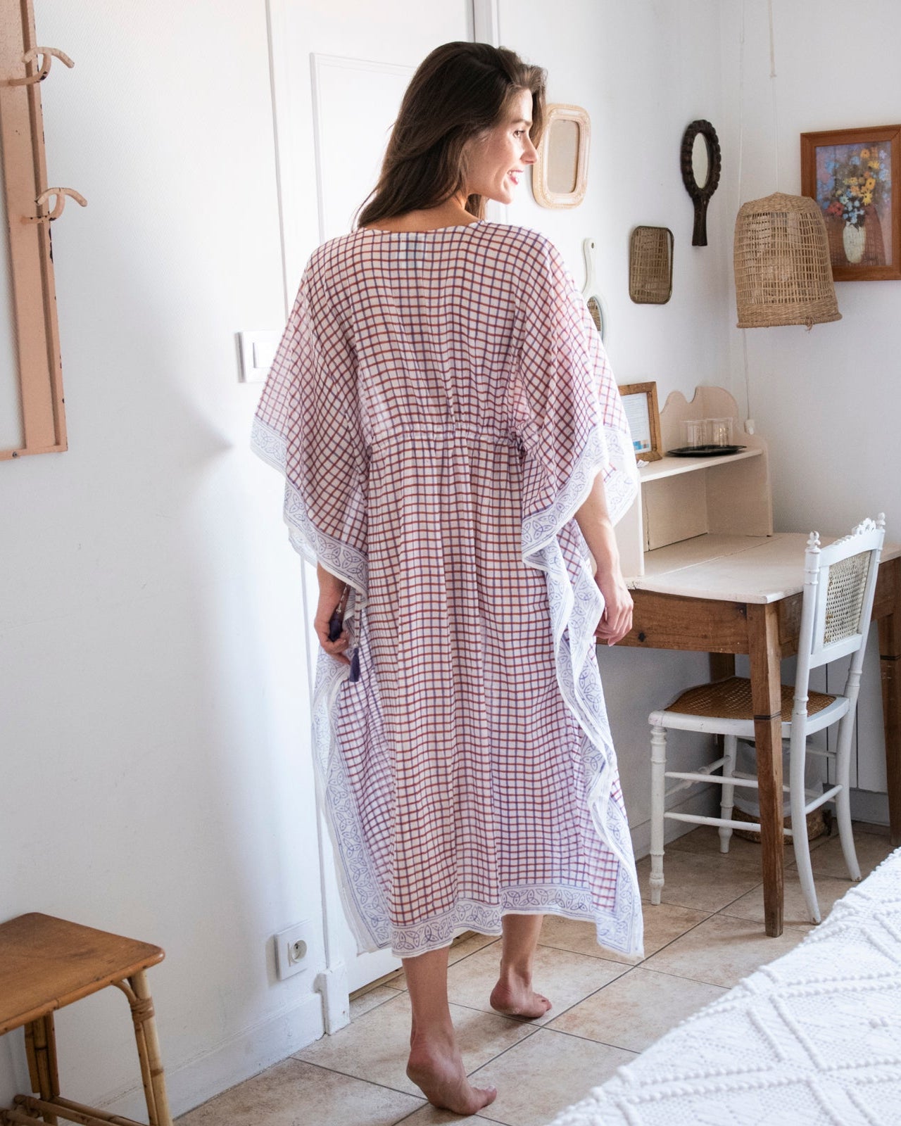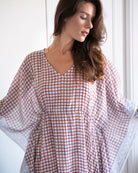 Introducing the Croisette Orange Kaftan from Zen Ethic - your summer travel essential for effortless style. Designed in Paris from 100% organic cotton, this luxurious piece is crafted with the same premium materials as your beloved Bonsoir nightwear. Featuring a relaxed silhouette with a cinched tie waist finished with a lilac tassel, this kaftan showcases a chic check print, adding a modern, elegant touch to your relaxation wardrobe or next getaway.
