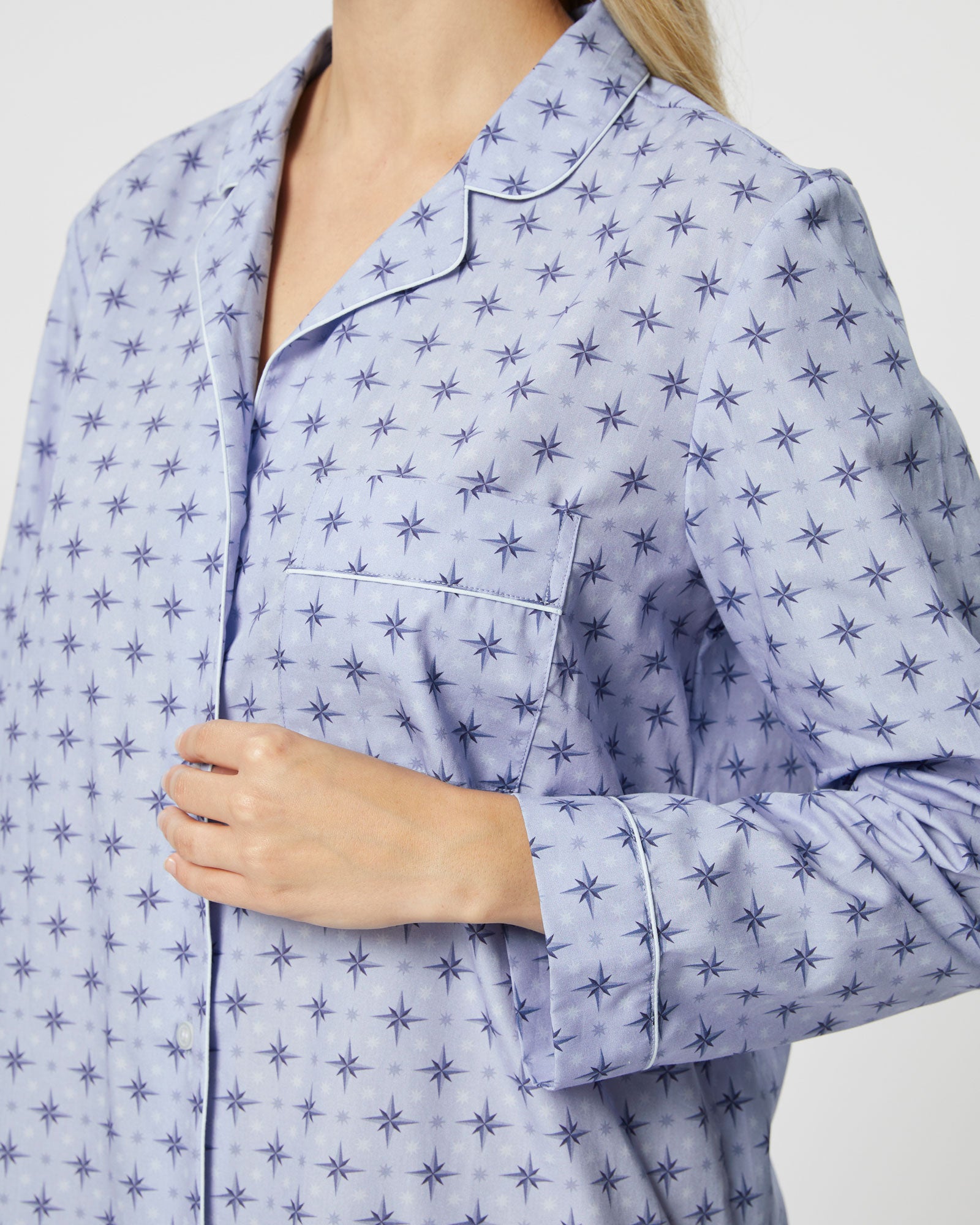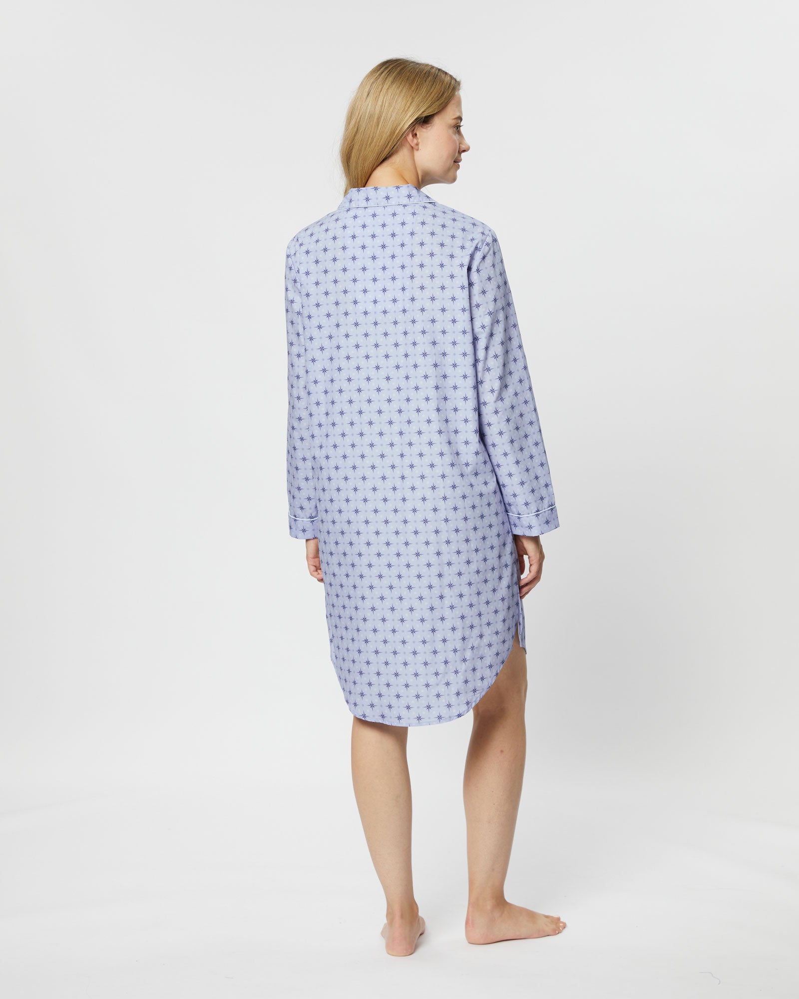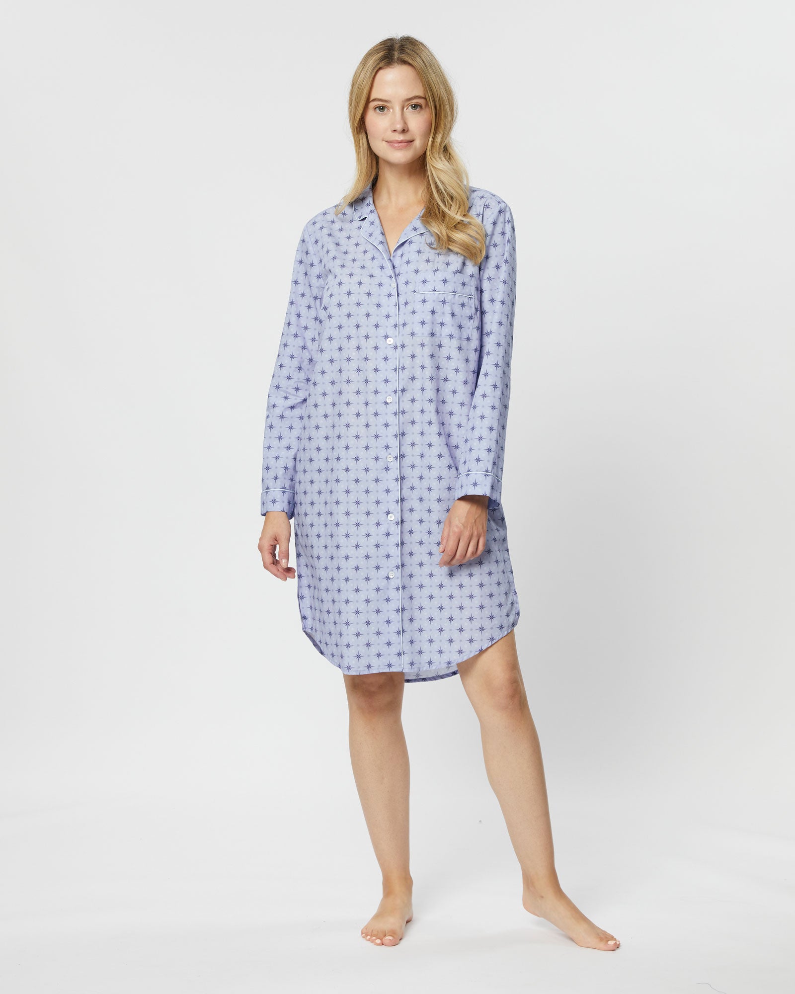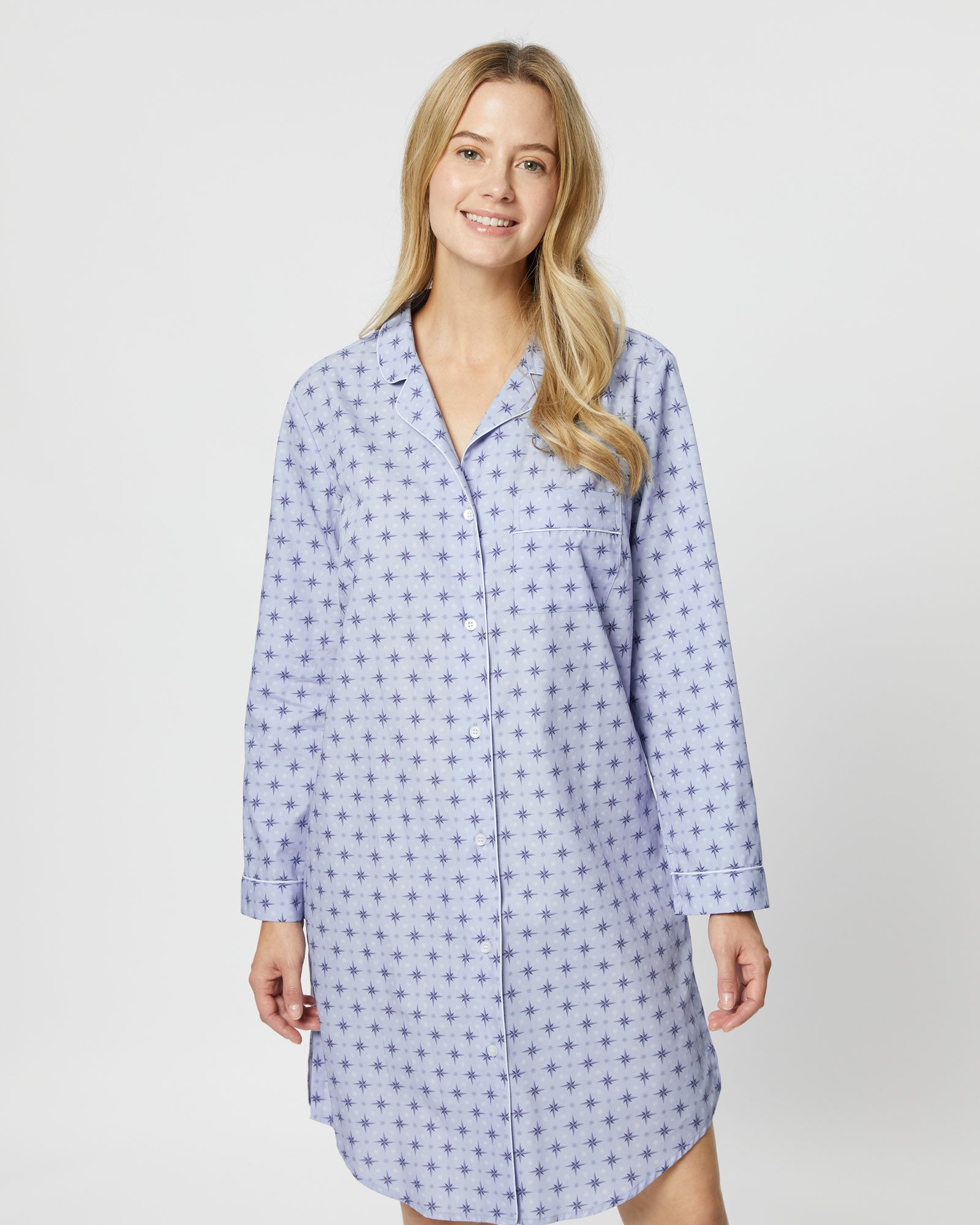 The classic cotton nightshirt is introduced in this season's stylish Evie Star design. The perfect piece for sleep or lounging at home, it is expertly cut for comfort and style.  Featuring a shirt-tail hem and buttons all the way down the front, it is finished with complementary piping on the collar, cuffs and breast pocket.