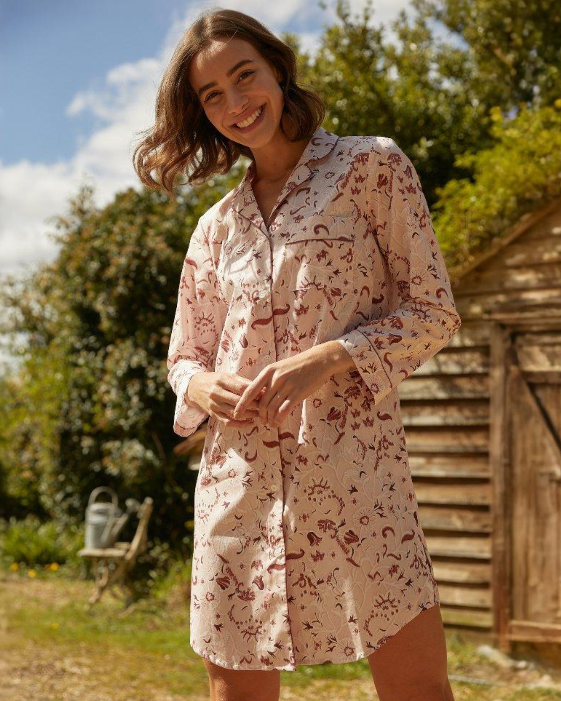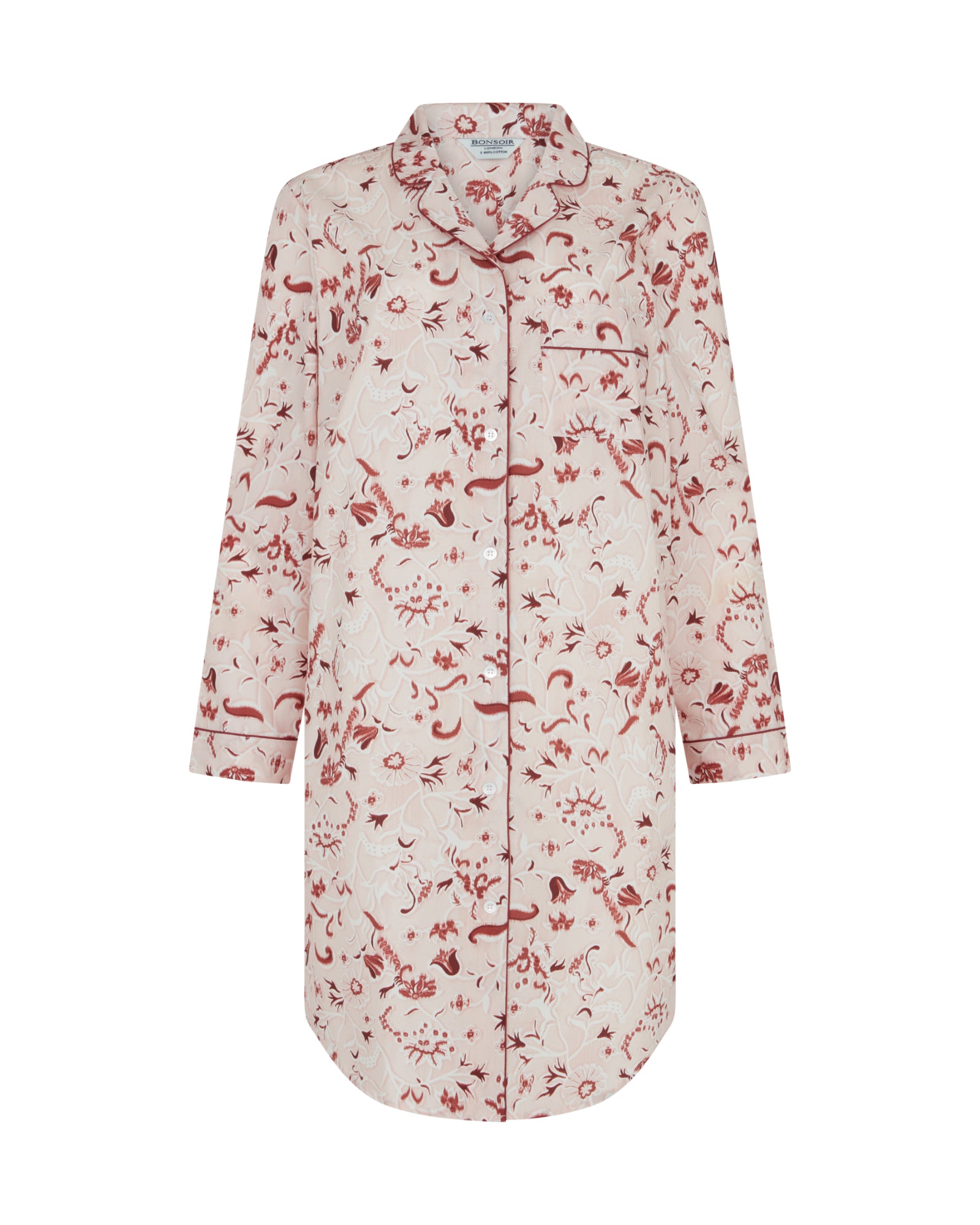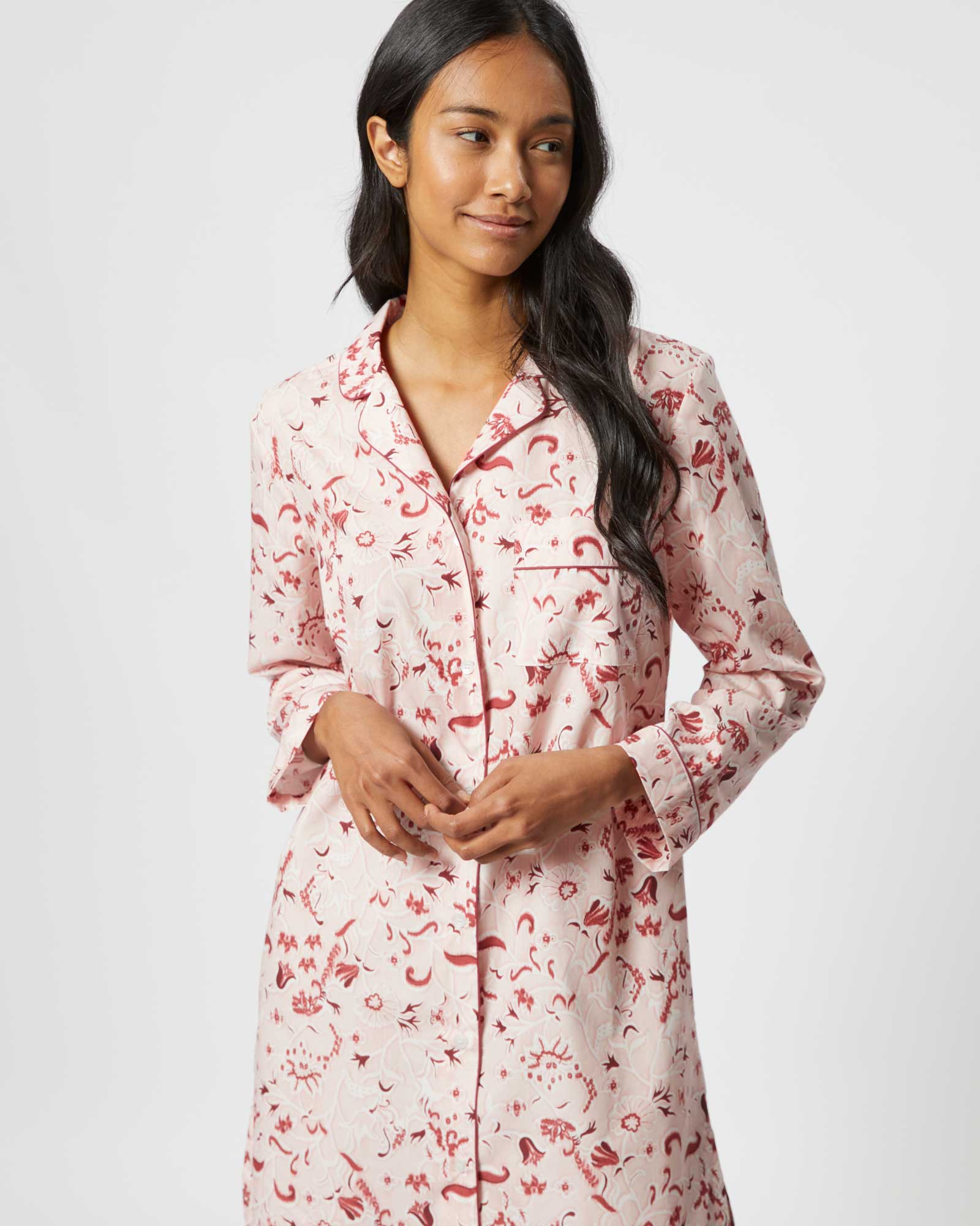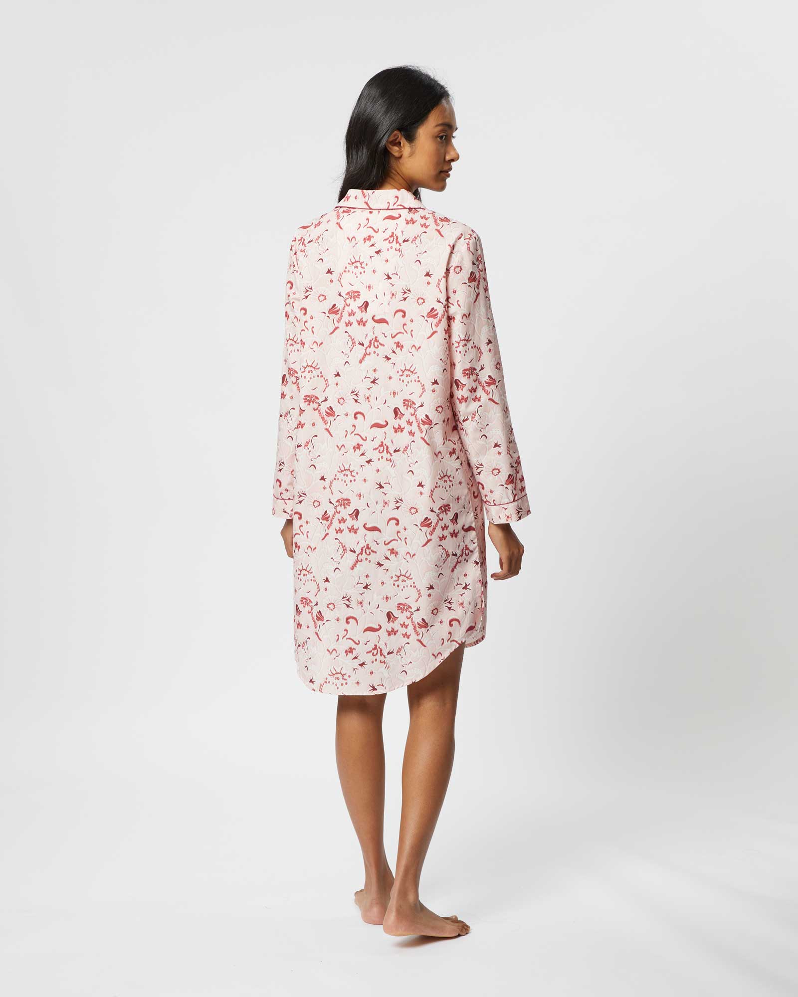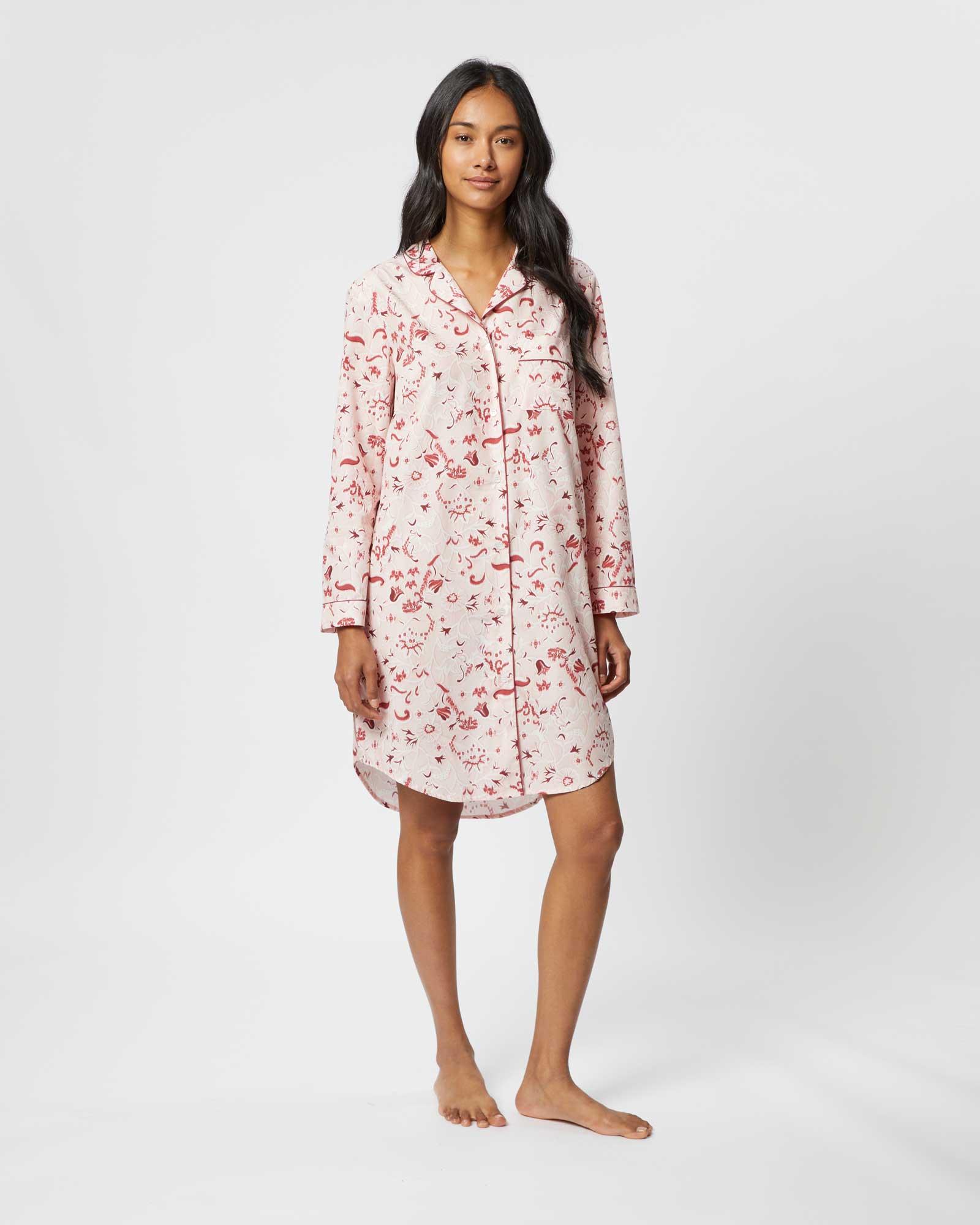 The classic cotton nightshirt is introduced in this season's stylish Evie Star design. The perfect piece for sleep or lounging at home, it is expertly cut for comfort and style.  Featuring a shirt-tail hem and buttons all the way down the front, it is finished with complementary piping on the collar, cuffs and breast pocket.