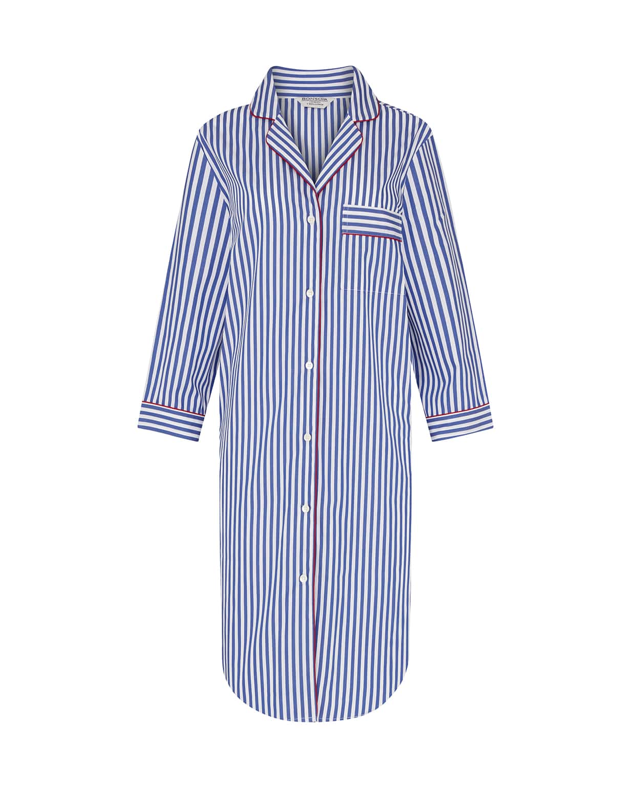 The classic cotton nightshirt is introduced in this season's St. Moritz design, a classic blue and white stripe that never goes out of style.