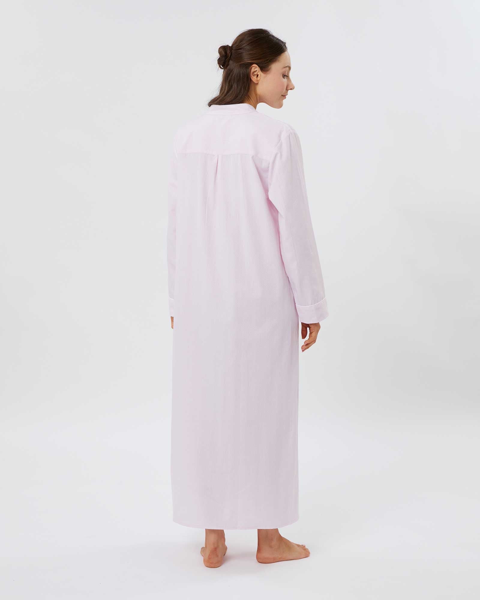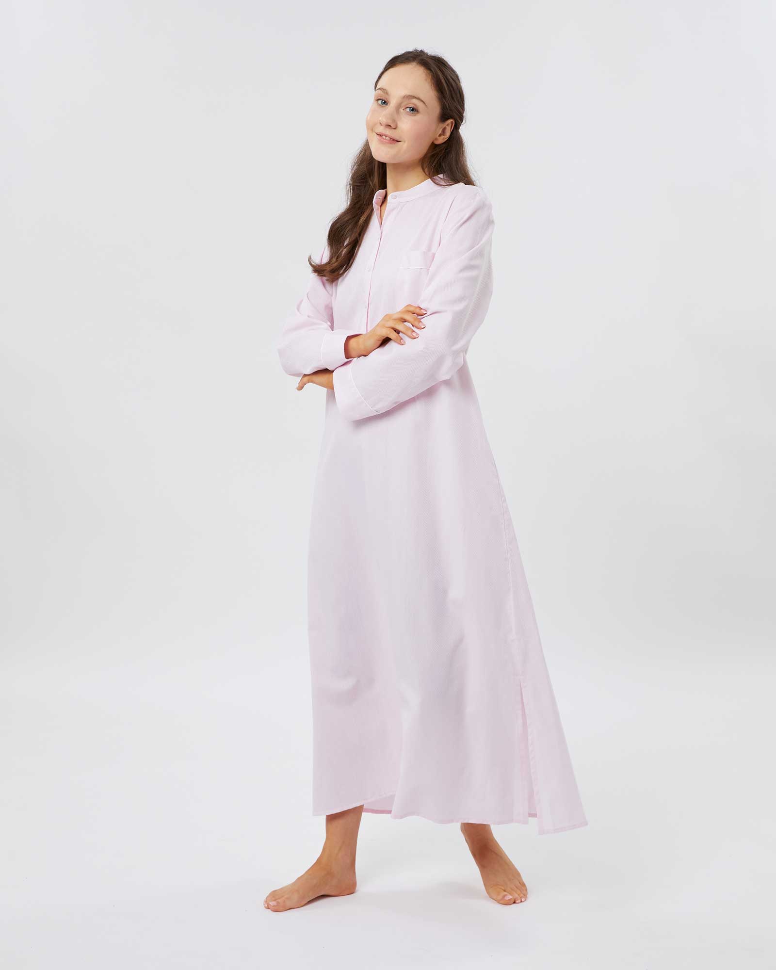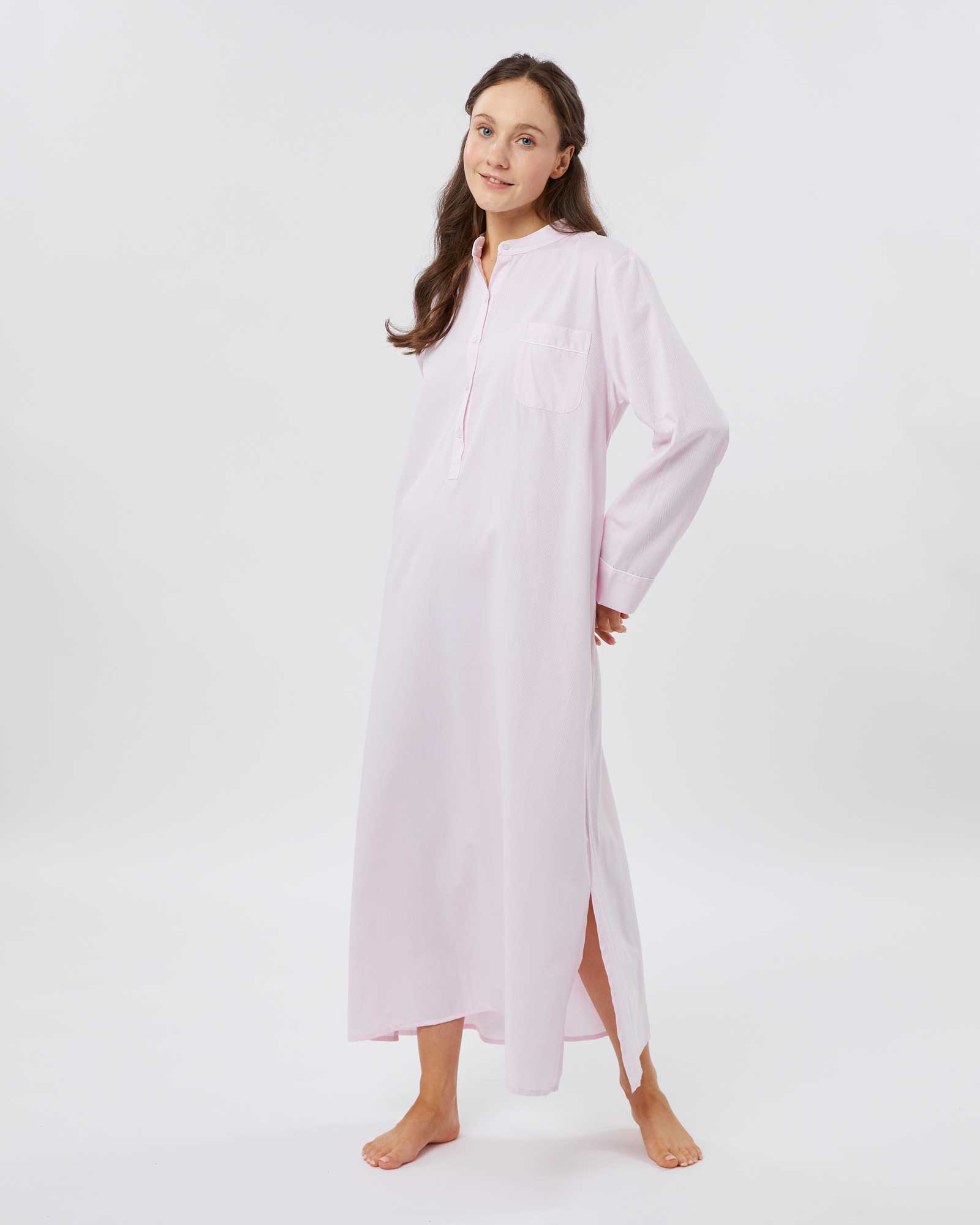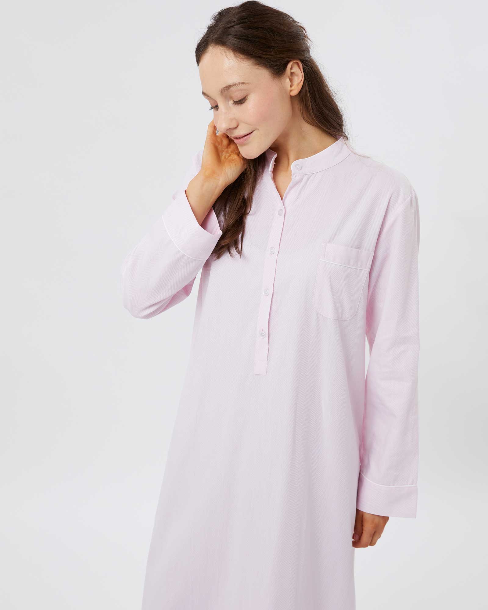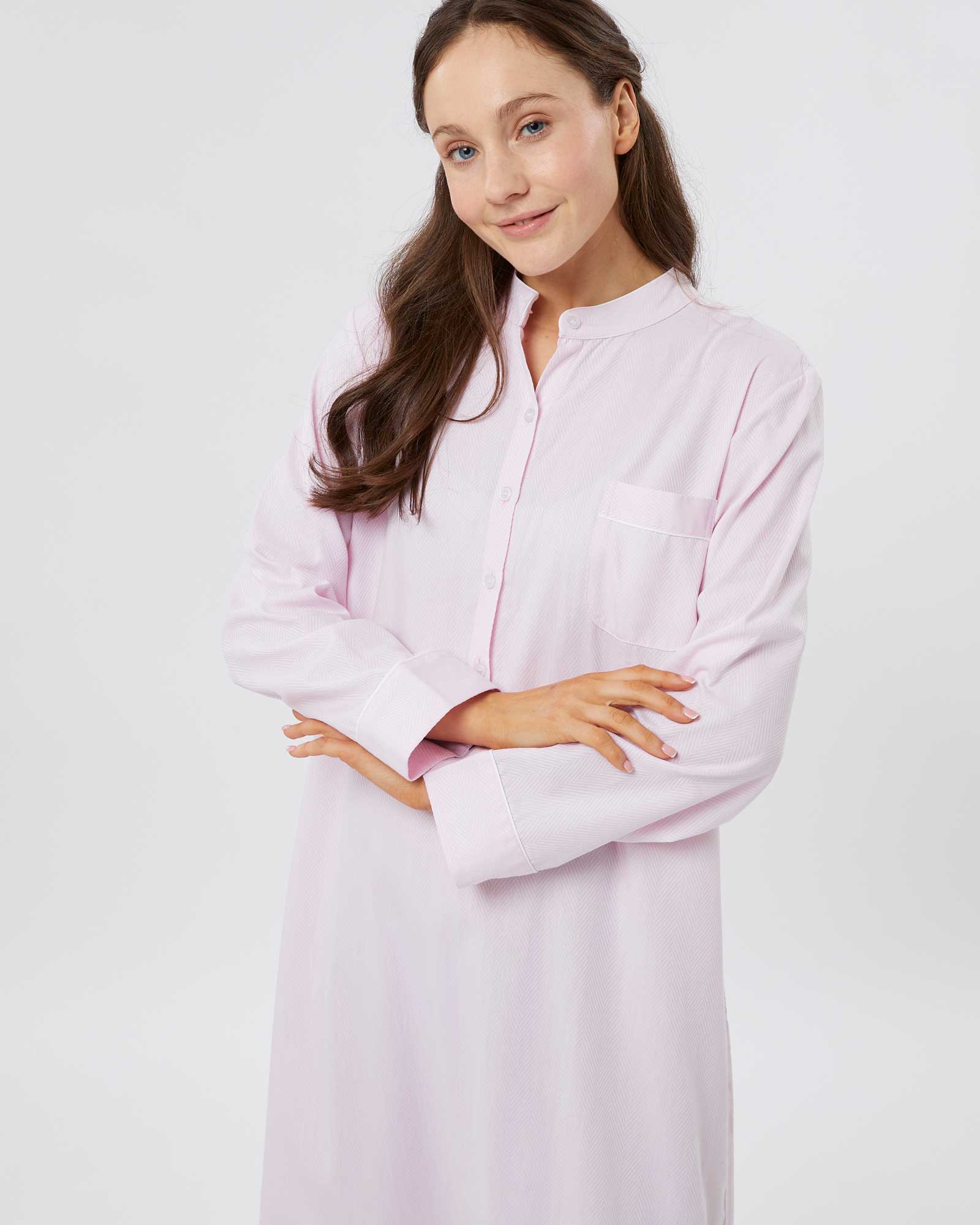 Introducing our women's Estelle Grandad Collar Nightshirt.  Crafted from a beautiful smooth 100% cotton with a woven satin herringbone design, our jacquard nightshirt in pink is the perfect addition to your nightwear collection.