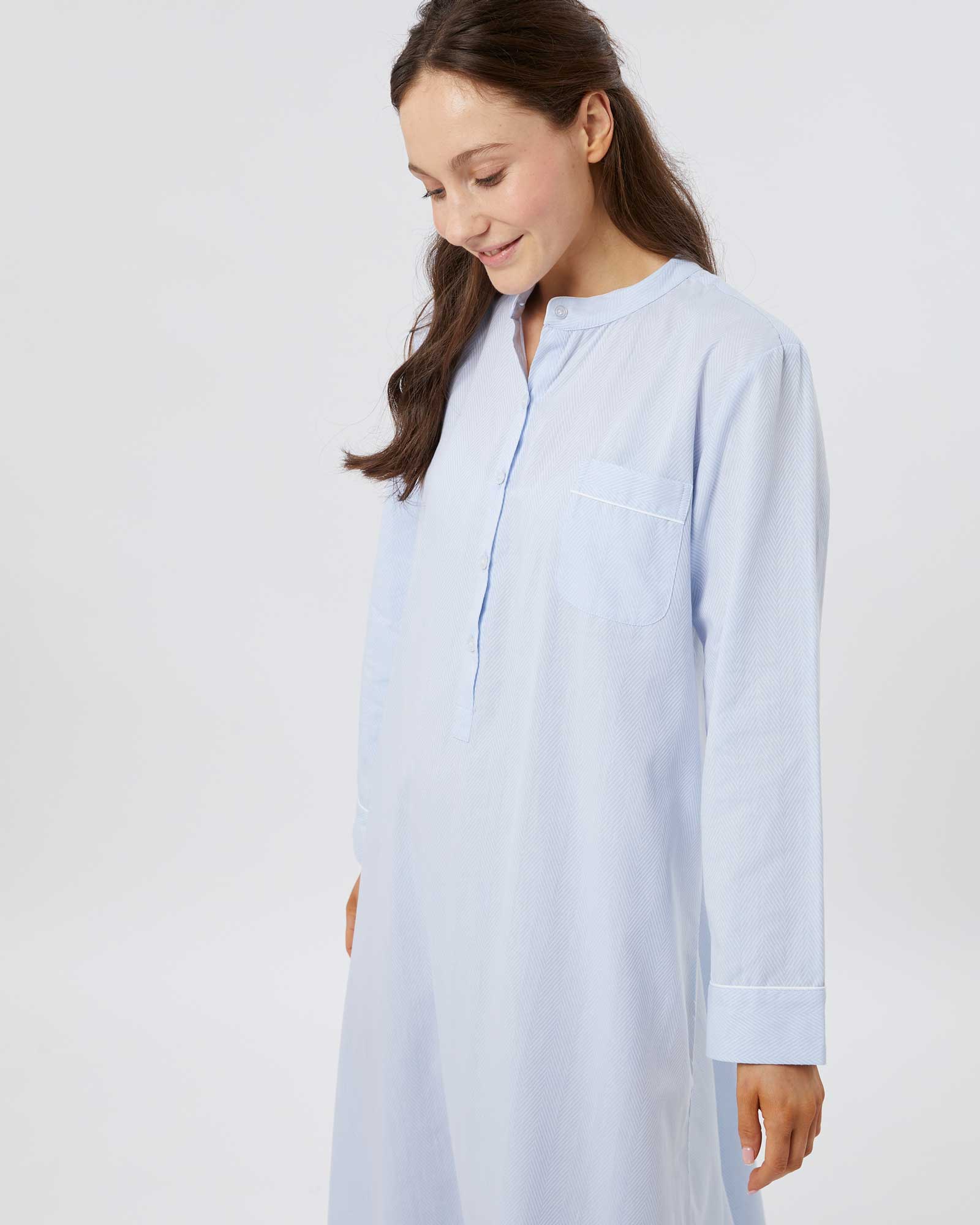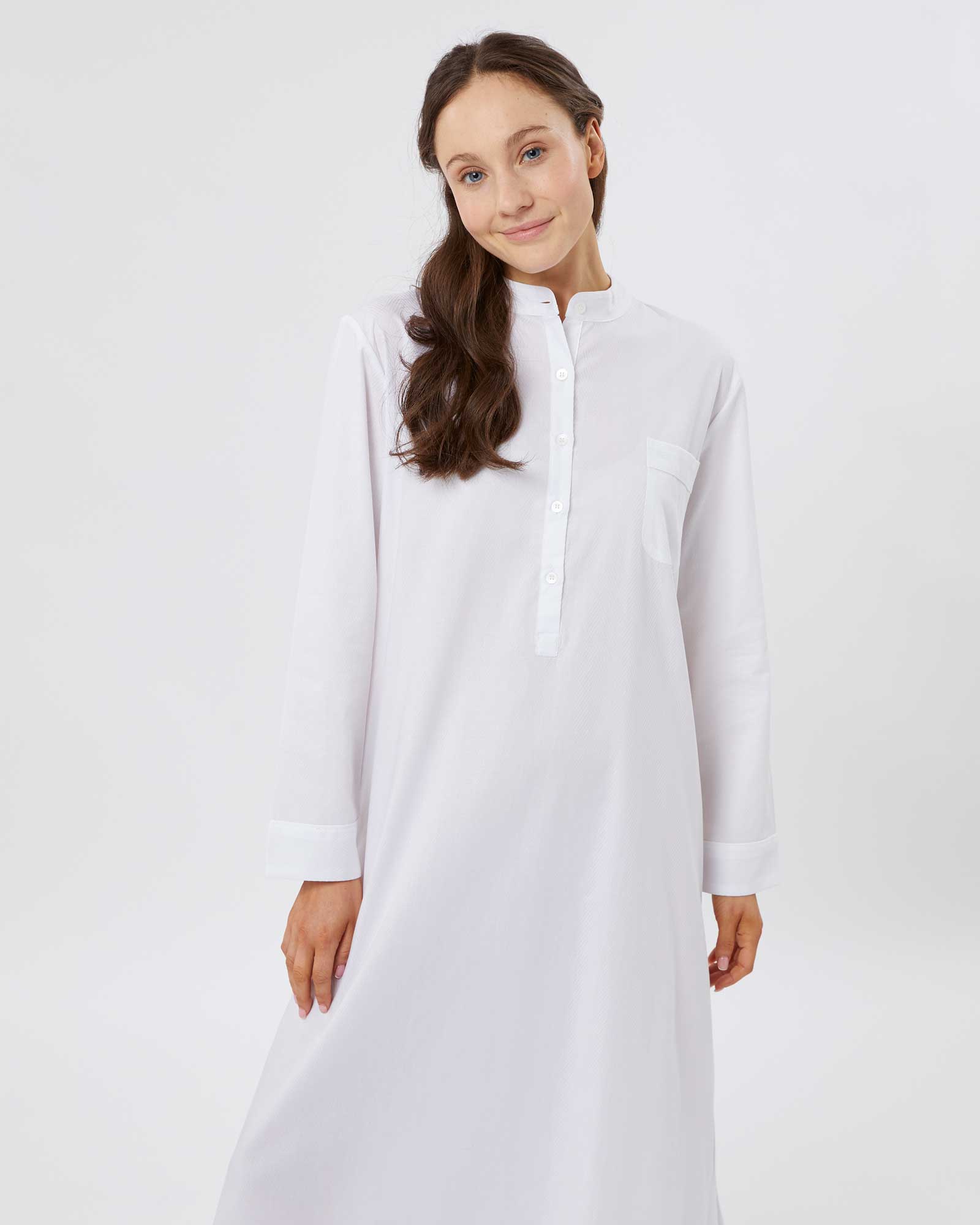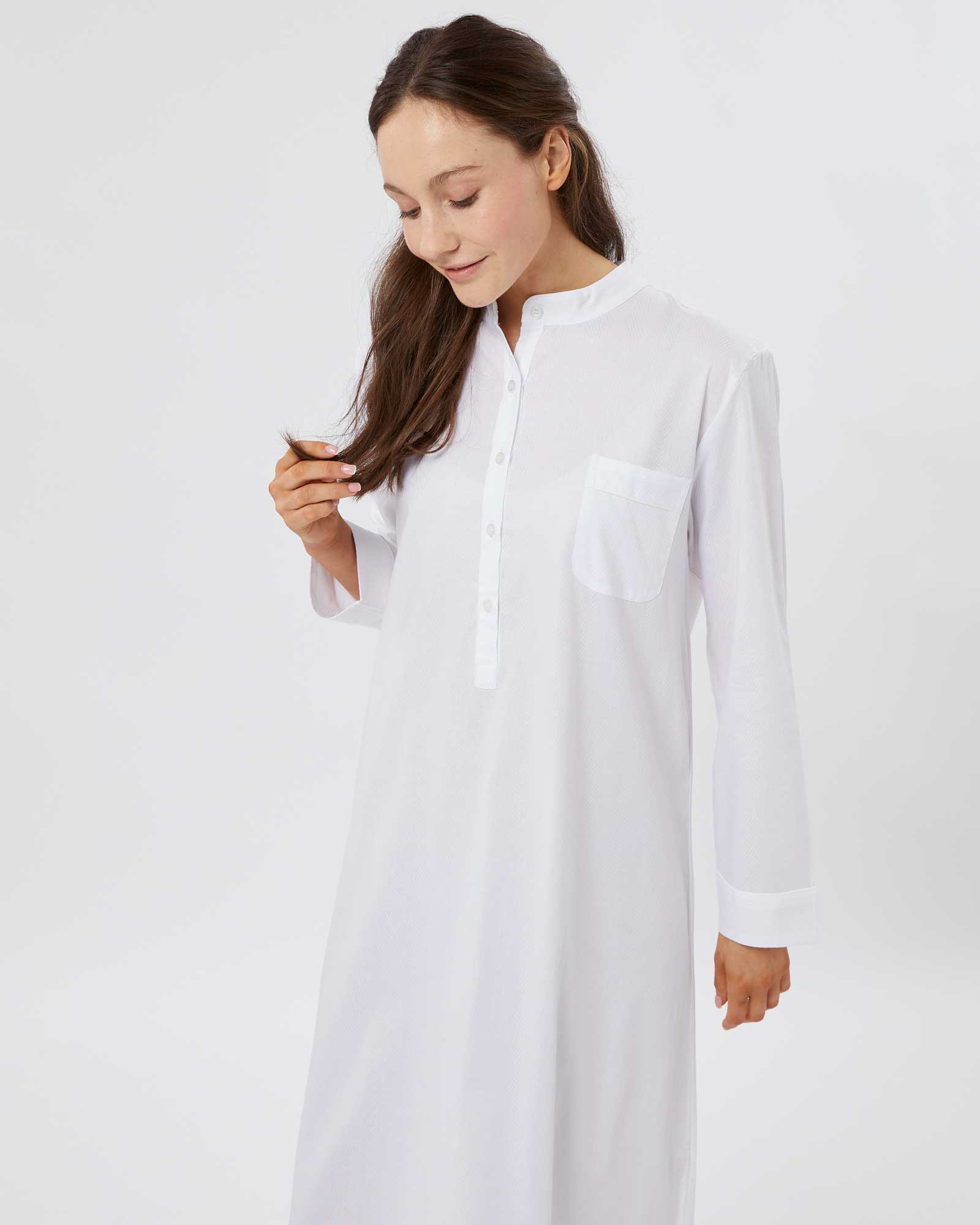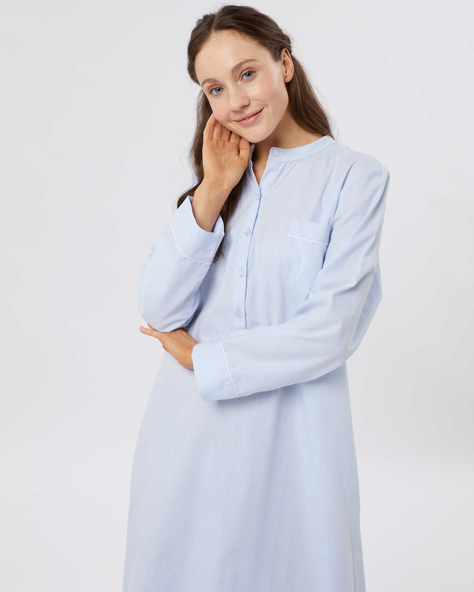 Introducing our women's Estelle Grandad Collar Nightshirt.  Crafted from a beautiful smooth 100% cotton with a woven satin herringbone design, our jacquard nightshirt in pink is the perfect addition to your nightwear collection.