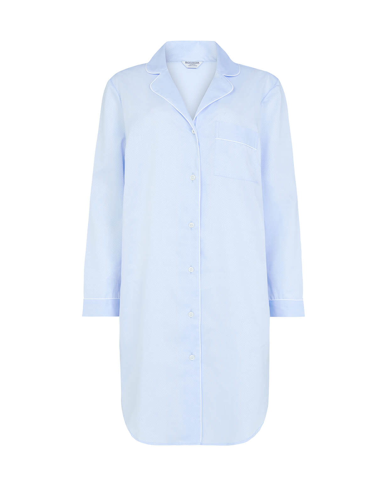 The new length jacquard nightshirt is introduced this season in a beautiful blue woven satin herringbone design.