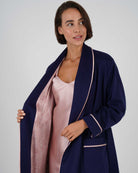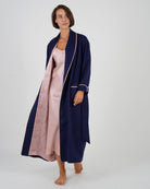 Expertly handcrafted by our team of seamstresses in Somerset, it features turn-back cuffs, pockets and a shawl collar, all beautifully finished with cord piping detail for a refined result. The dressing gown has a wrap over front secured with a wide tie belt and inside ties for ease and comfort.