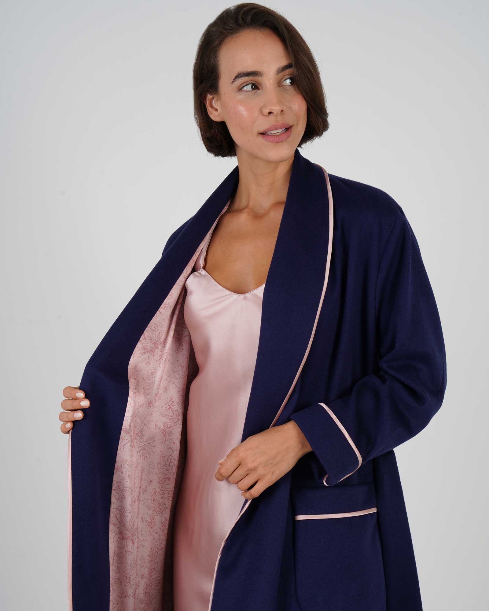Our luxury women’s silk-lined cashmere robe in navy with our beautiful Marlin Silk lining, is individually tailored to order in a wonderfully soft Italian cashmere. The ultimate gift or investment piece, this is luxury loungewear at its best.