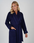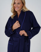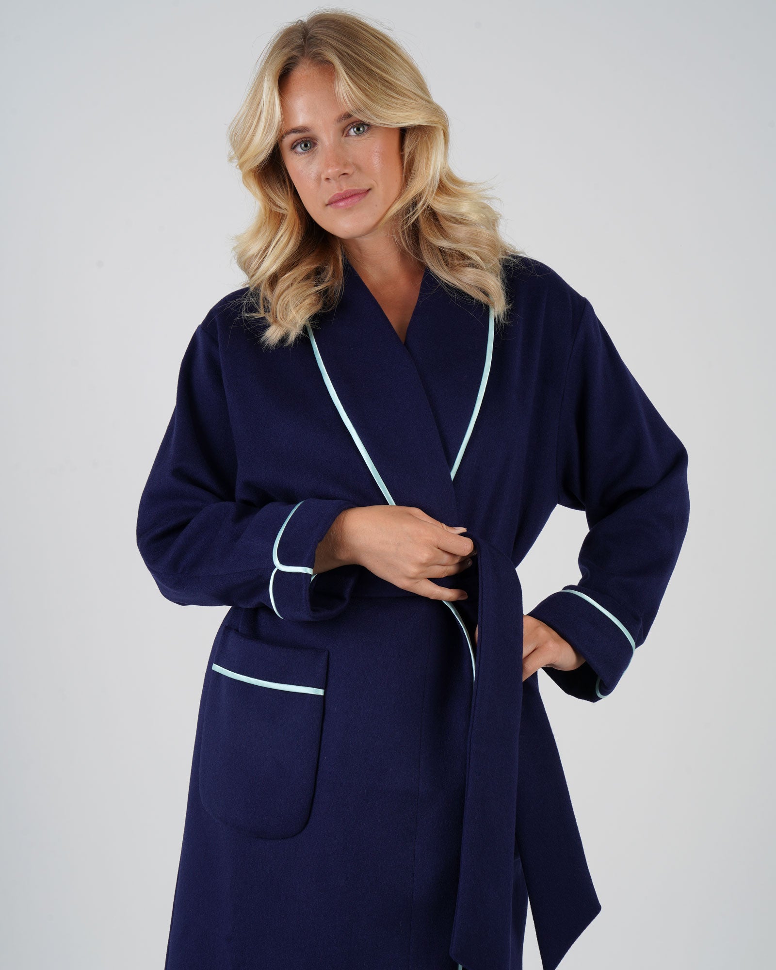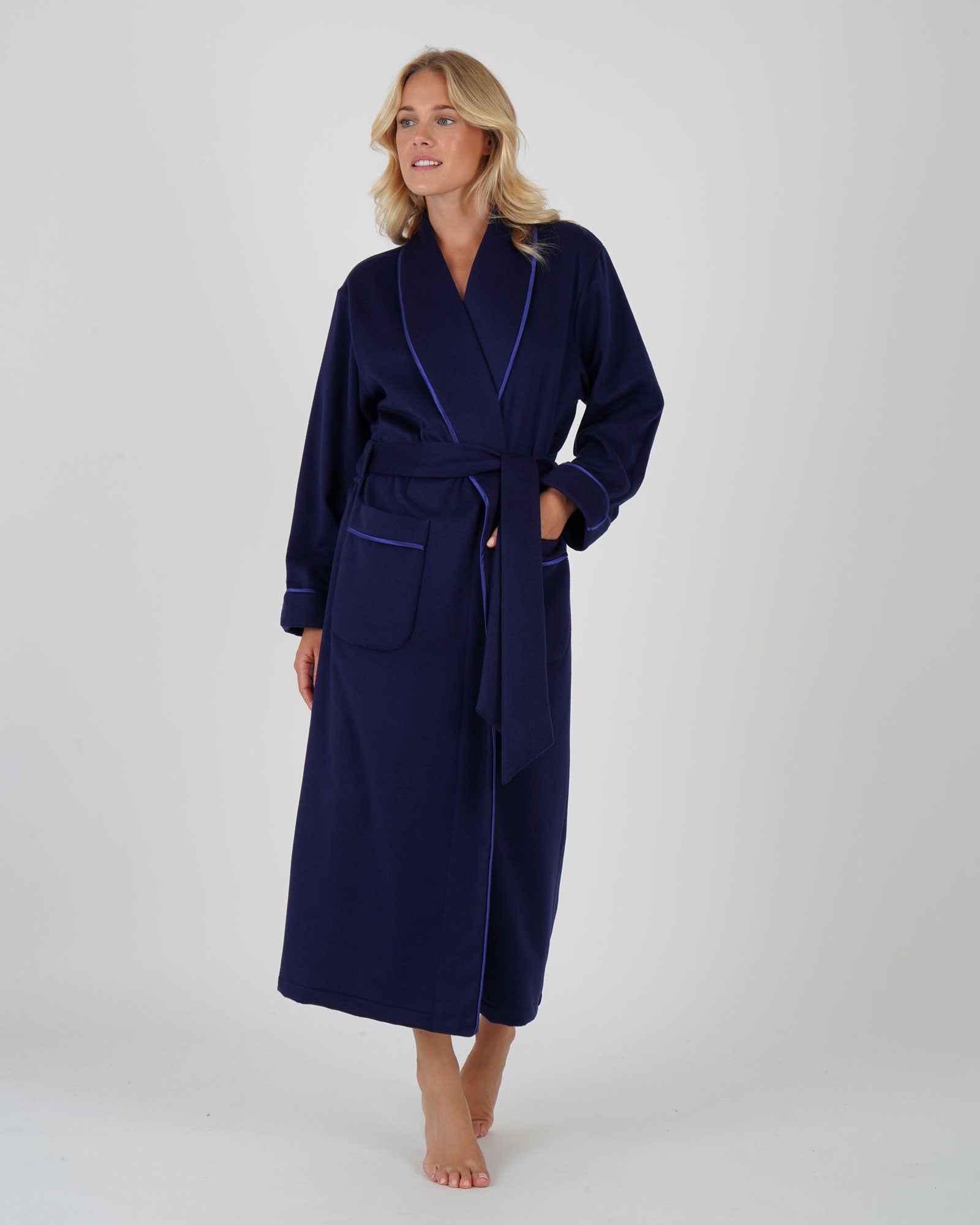 Expertly handcrafted by our team of seamstresses in Somerset, it features turn-back cuffs, pockets and a shawl collar, all beautifully finished with cord piping detail for a refined result. The dressing gown has a wrap over front secured with a wide tie belt and inside ties for ease and comfort.