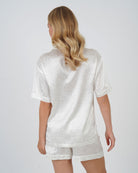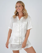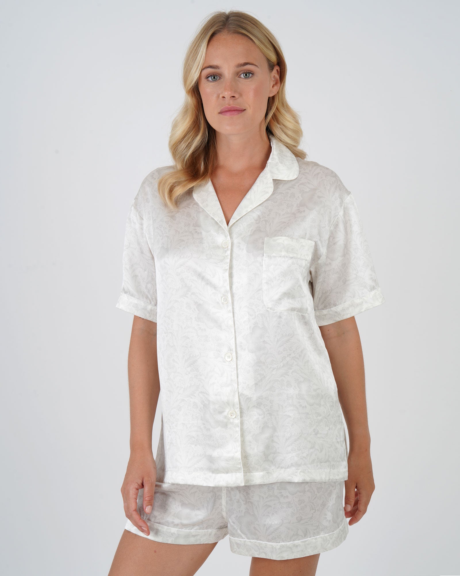 Introducing our classic women's short pyjamas crafted from beautiful 19 momme silk satin, and now available in our new season Highclere Flower Print. The ultimate indulgence for the summer months. The shorts are loosely cut for a flattering yet comfortable fit and feature a tie waist. The shirt features a single breast pocket and short sleeves. Perfect for sleeping or relaxing in.