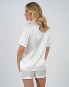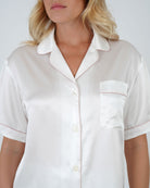 Introducing our classic women's short pyjamas crafted from beautiful 19 momme silk satin, and now available in our ivory colour but with beautiful dusty pink piping detail. The ultimate indulgence for the summer months. The shorts are loosely cut for a flattering yet comfortable fit and feature a tie waist. The shirt features a single breast pocket and short sleeves. Perfect for sleeping or relaxing in.