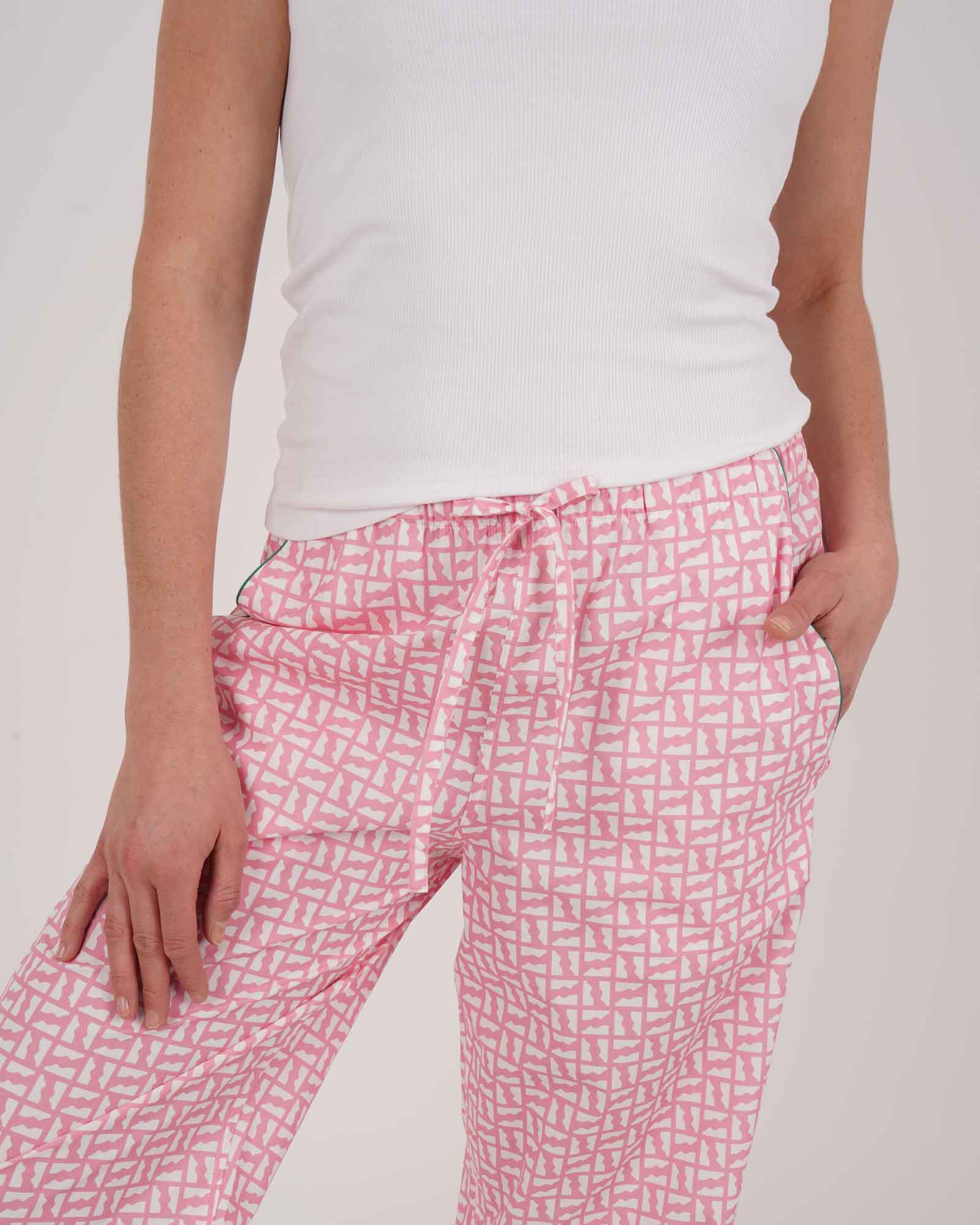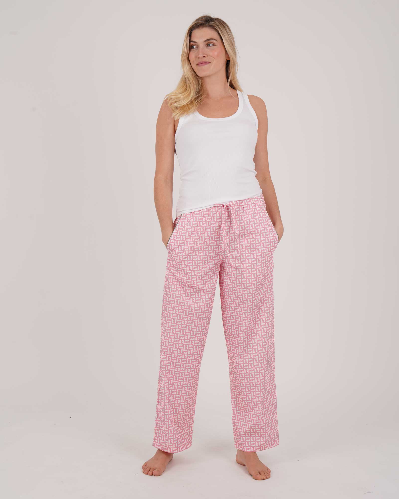 Our women's classic cotton pyjama trousers are the answer to laid back lounging. New this season in our stylish Lita Pink Print. Featuring a fully elasticated and tie waist, they are perfect paired with a simple t-shirt.