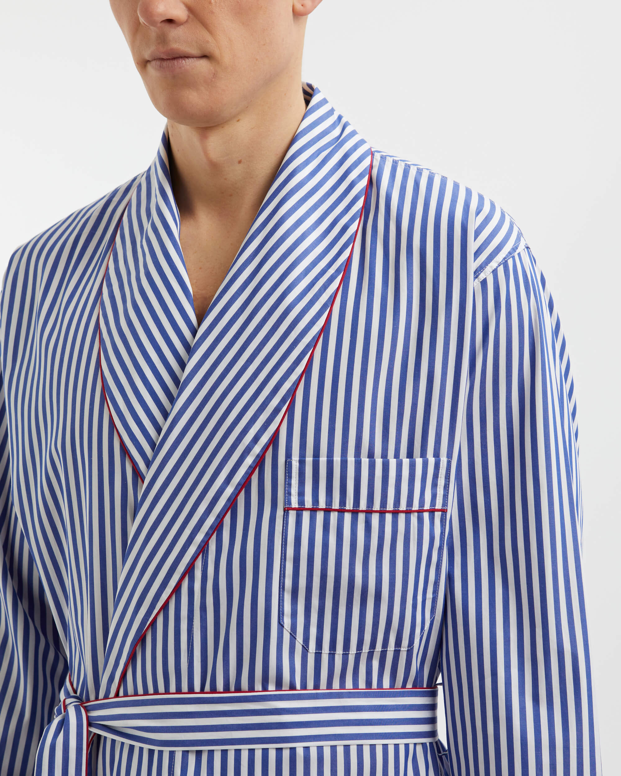 Our men's dressing gown is crafted from sumptuously smooth 100% cotton. Roomy and relaxed, it has a shawl collar, wide tie belt and useful patch pockets. The perfect piece of loungewear for relaxing at home or away.